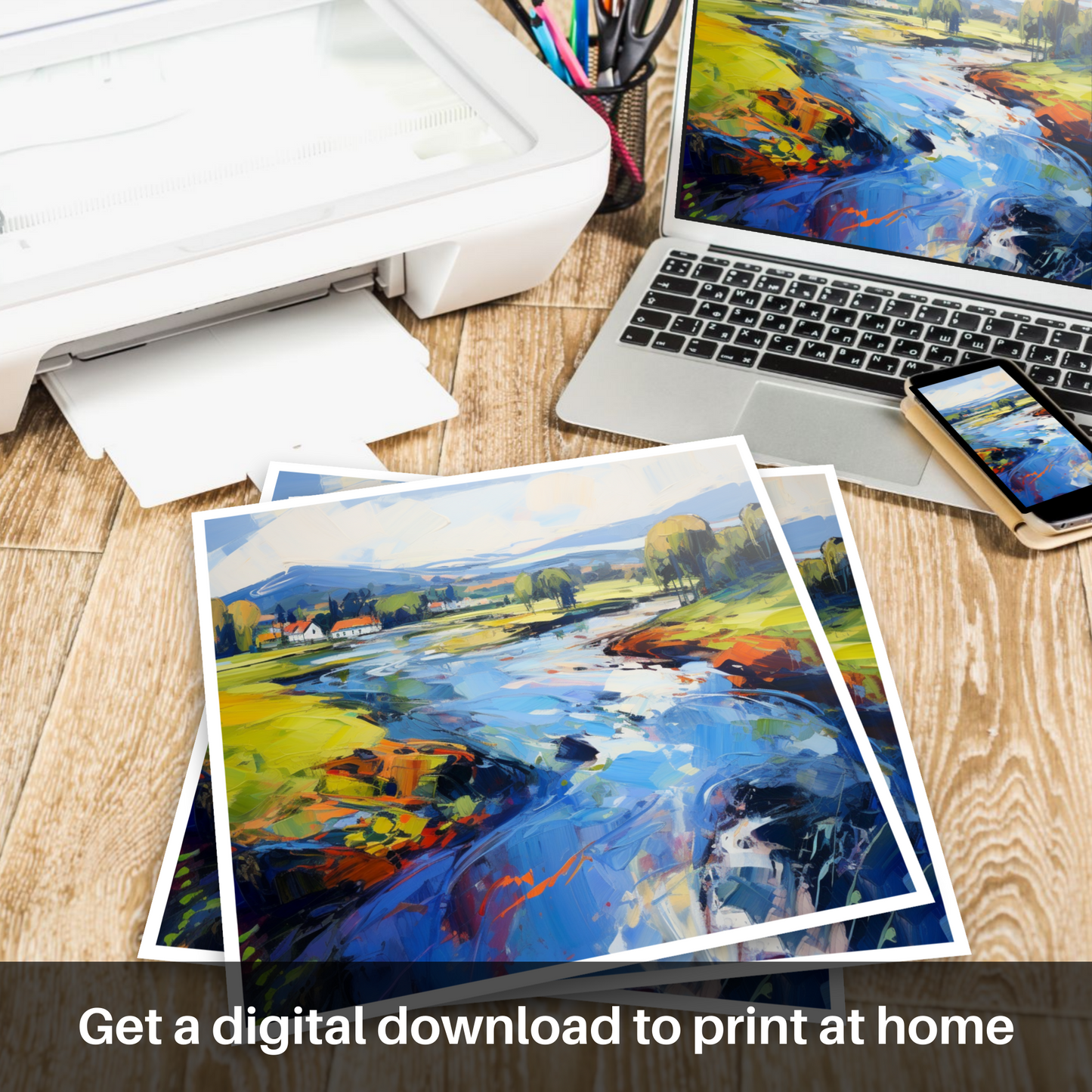 Painting and Art Print of River Leven, West Dunbartonshire entitled "Vibrant Expression: The Dance of River Leven".
