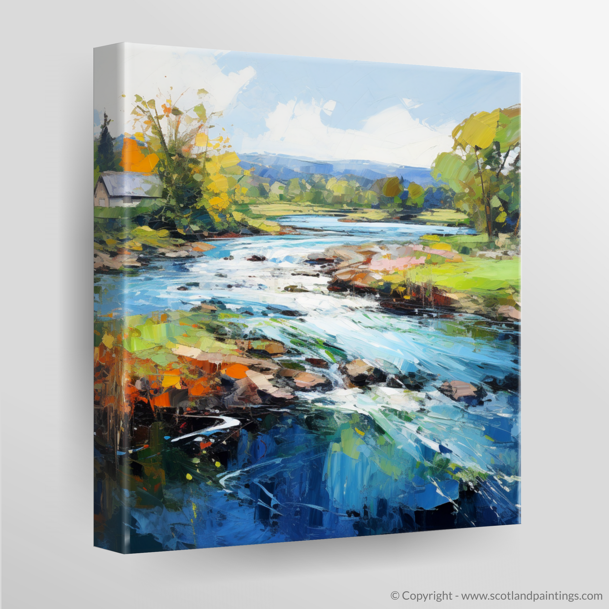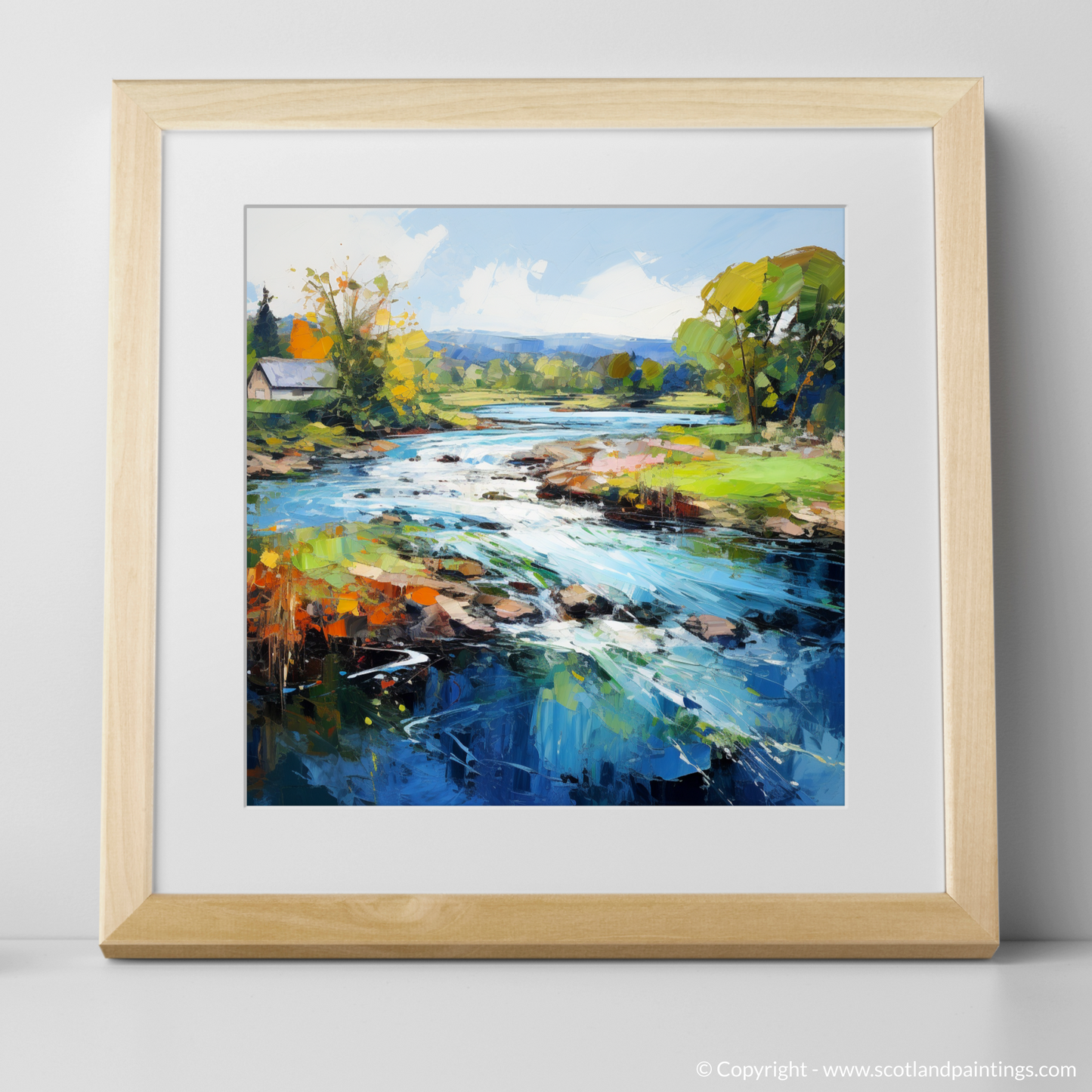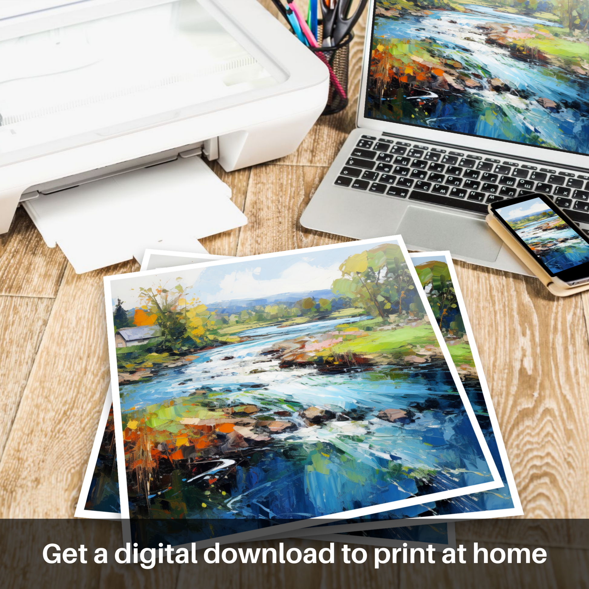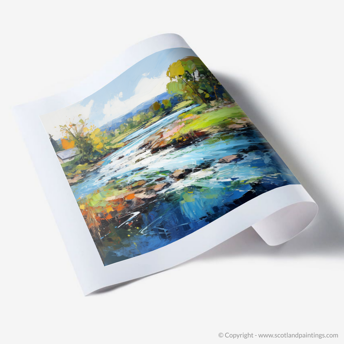 This captivating print portrays the dynamic beauty of the River Leven in West Dunbartonshire, rendered in a vibrant expressionist style that breathes life and emotion into the Scottish landscape. With bold, impasto strokes, the artist captures the river's rushing waters as they cascade over rocks and pebbles, creating torrents of white that contrast sharply with the deep blues and greens of the water's depths.