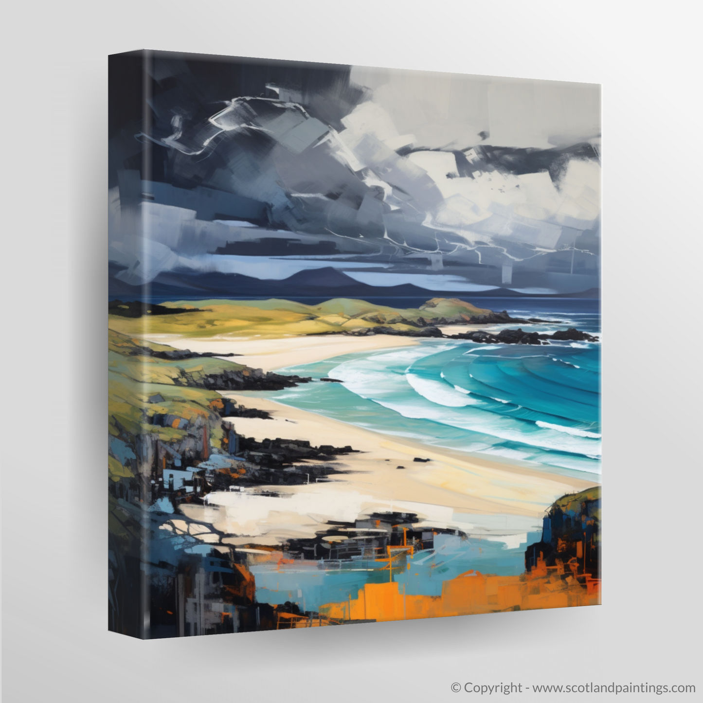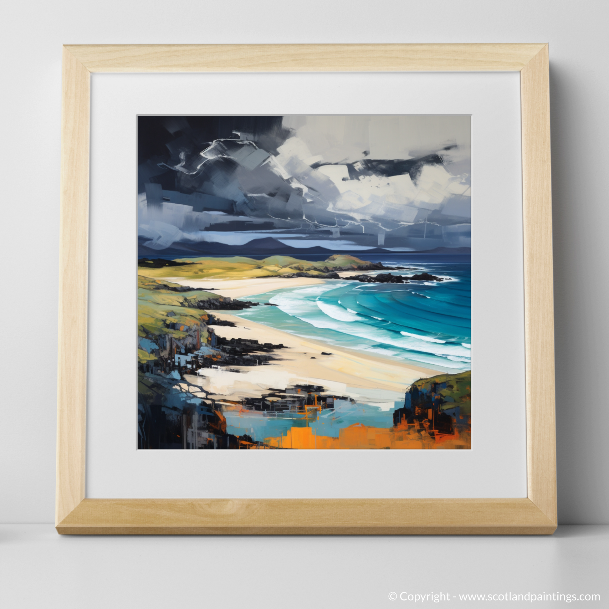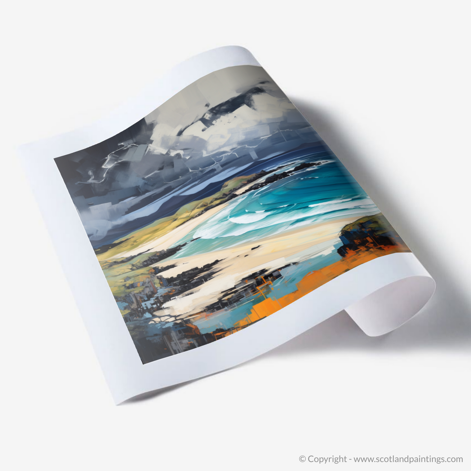 With bold strokes and a vivid palette, this expressive print encapsulates the rugged beauty of Kiloran Bay amidst the drama of a stormy atmosphere. Swathes of dark, brooding clouds dominate the upper reaches of the composition, their chaotic, swirling forms captured with a dynamic interplay of light and shadow that suggests the tumultuous movement of an impending tempest.