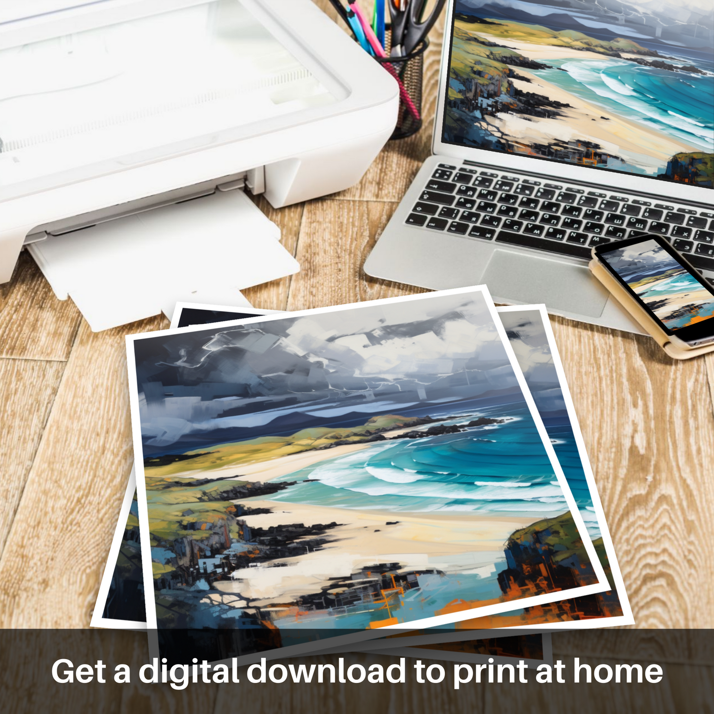 This print is a powerful representation of nature's contrasting forces—calm and chaos, light and dark—and the eternal interplay between sky, land, and sea. It is a stirring ode to the Scottish coastal landscape that will evoke a sense of awe and contemplation in any viewer, bringing a slice of the sublime into any space it adorns.