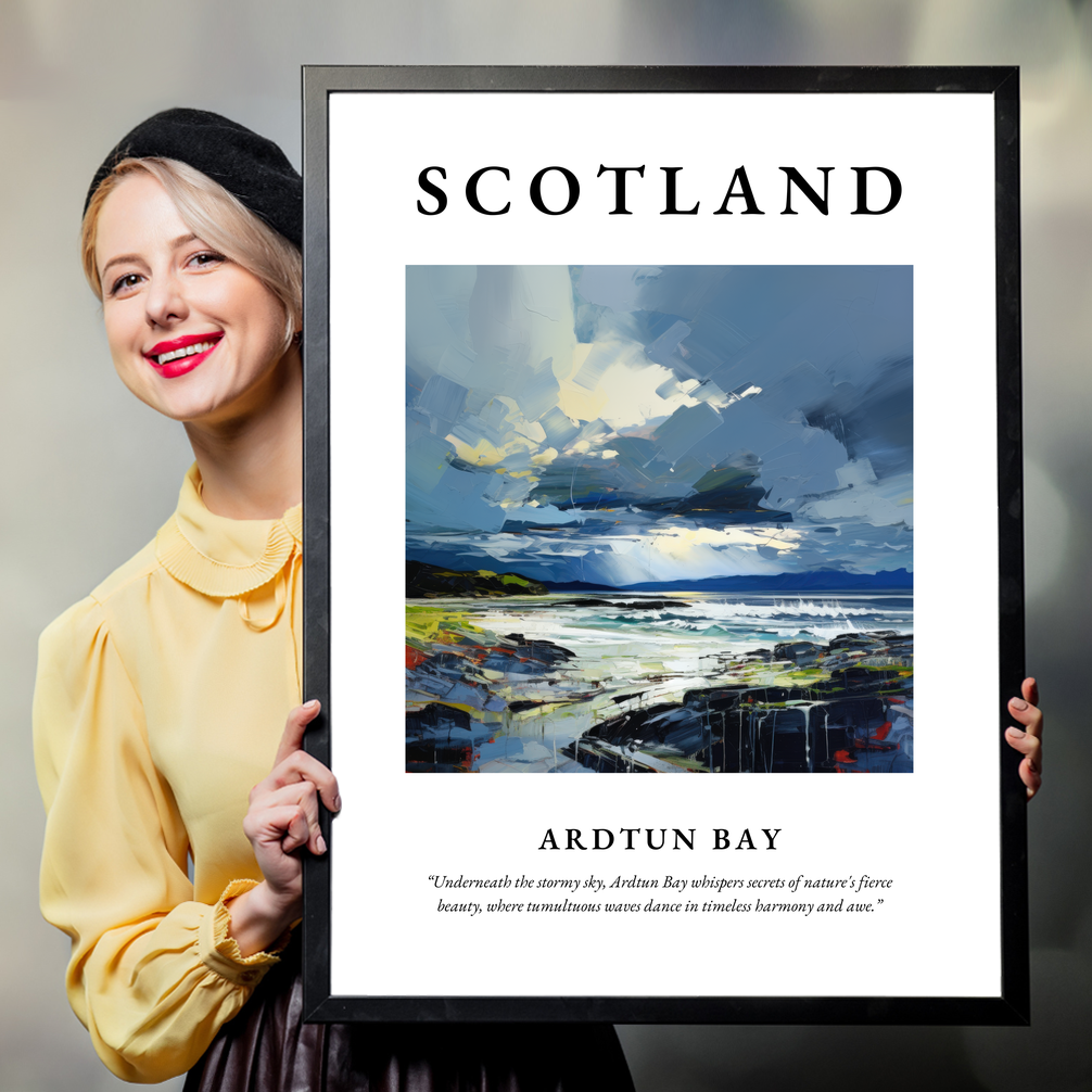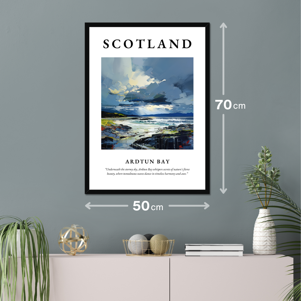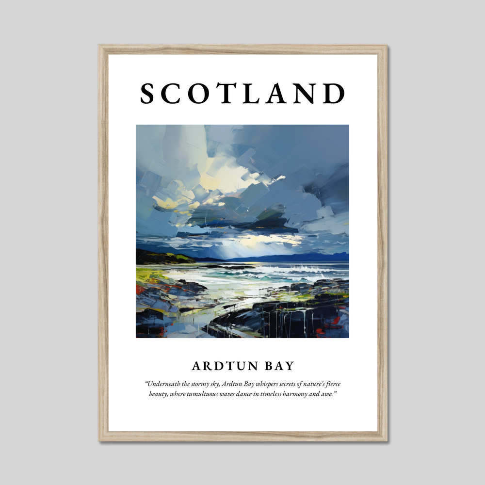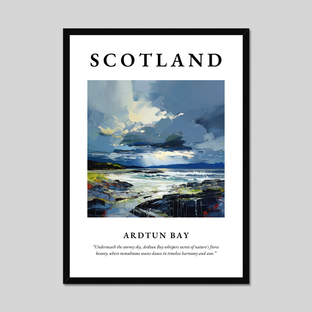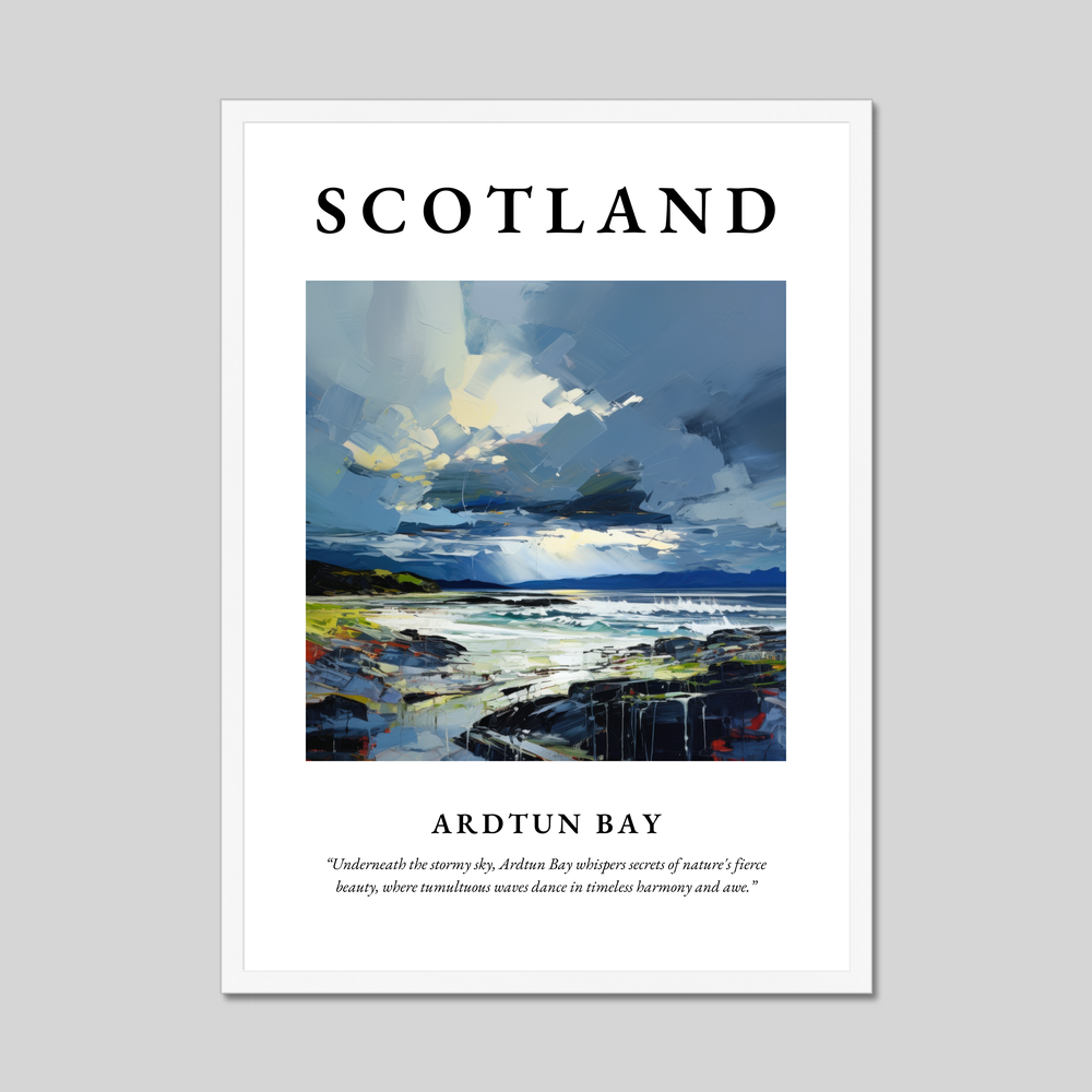 Capture the essence of Scotland's wild beauty with our striking framed poster print, measuring a generous 50cm x 70cm. Presenting a bold tribute to the majesty of the Scottish coastline, this stunning piece is sure to transform any space, weaving the dramatic allure of Ardtun Bay into your home. Available in an elegant black, crisp white, or sophisticated natural wood-effect frame, it complements any décor while being an affordable means to cover a large wall area.