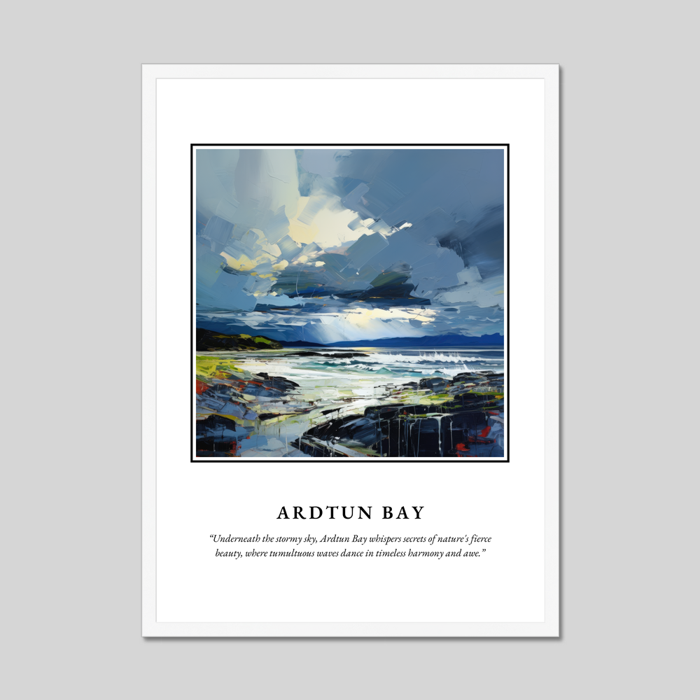 Ardtun Bay itself is a hidden gem on the Isle of Mull, renowned for its striking coastal cliffs and serene beaches. The bay’s tempestuous weather and breathtaking vistas have long inspired both poets and painters, much like the vivid artwork in this poster. Visitors to Ardtun Bay are often captivated by its wild charm, where the sky seems to endlessly play with the ocean, creating a dramatic theatre of nature.