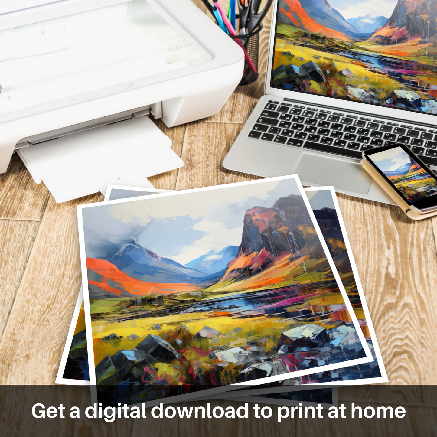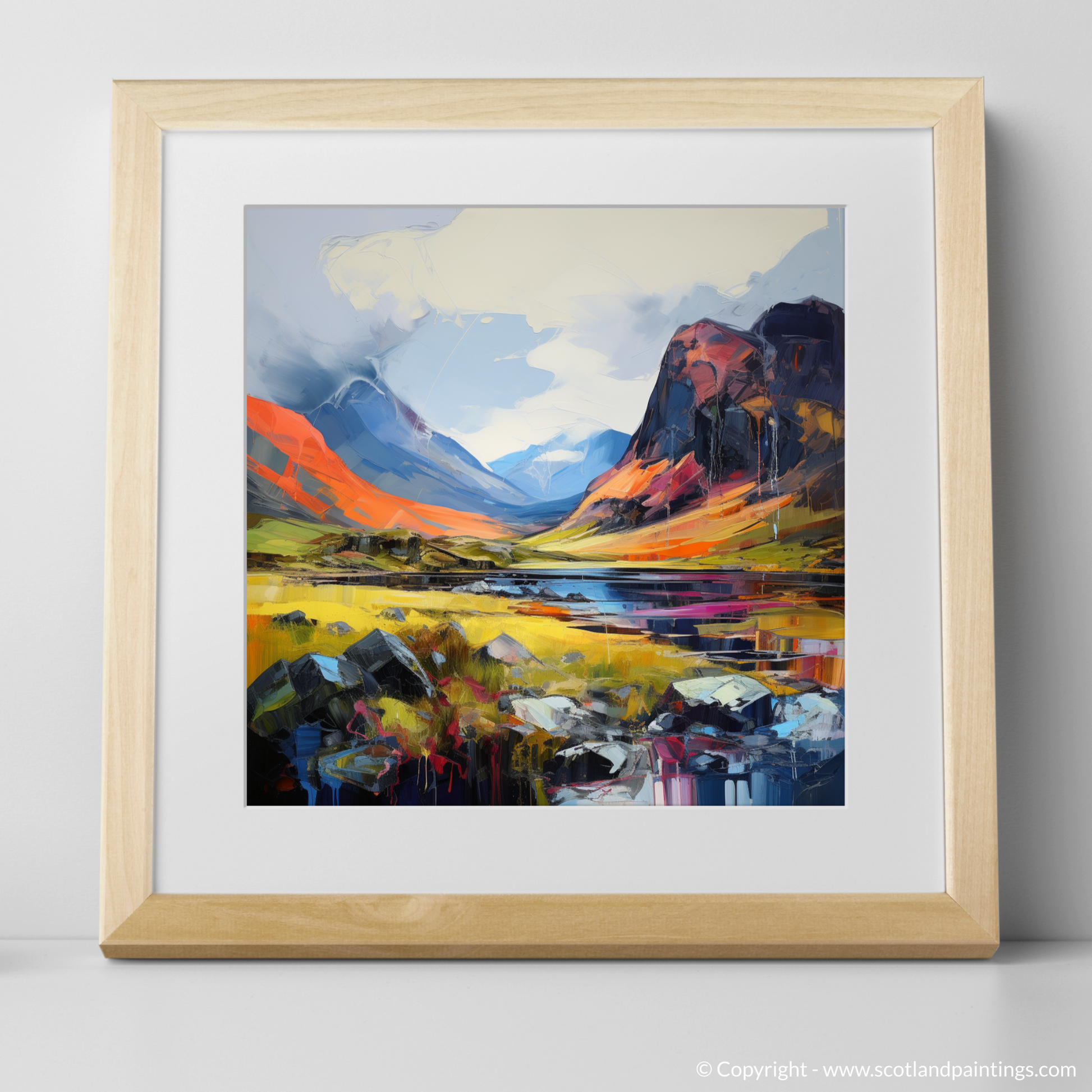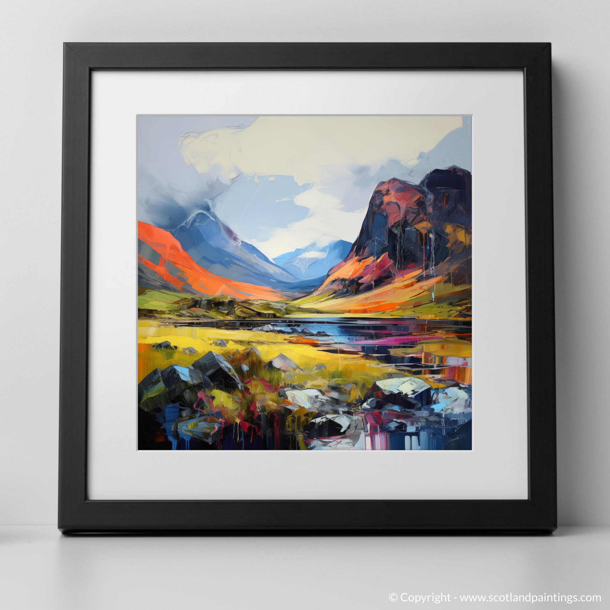 Experience the rugged beauty of the Scottish Highlands with this expressive and striking print, capturing the raw essence of Creag Leacach. Swathes of vivid colour boldly interpret the natural landscape, with undulating mountain ridges rising majestically against a dramatic sky. The painterly strokes evoke a sense of movement, mirroring the wild and untamed spirit of the region.