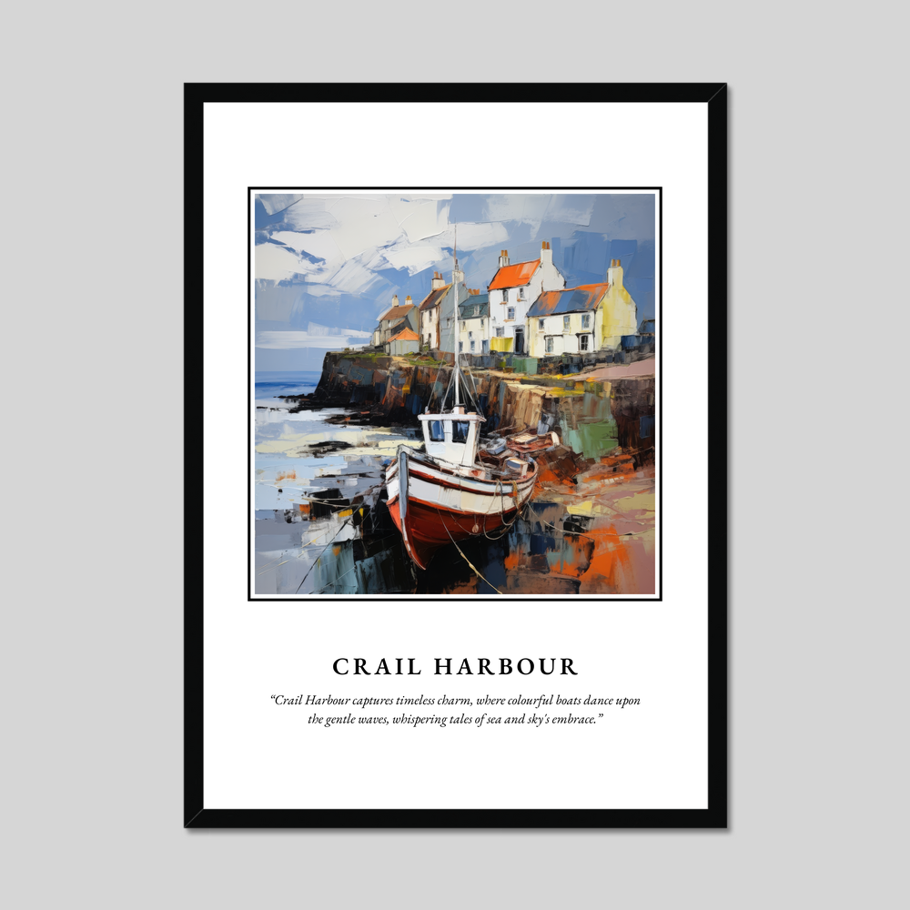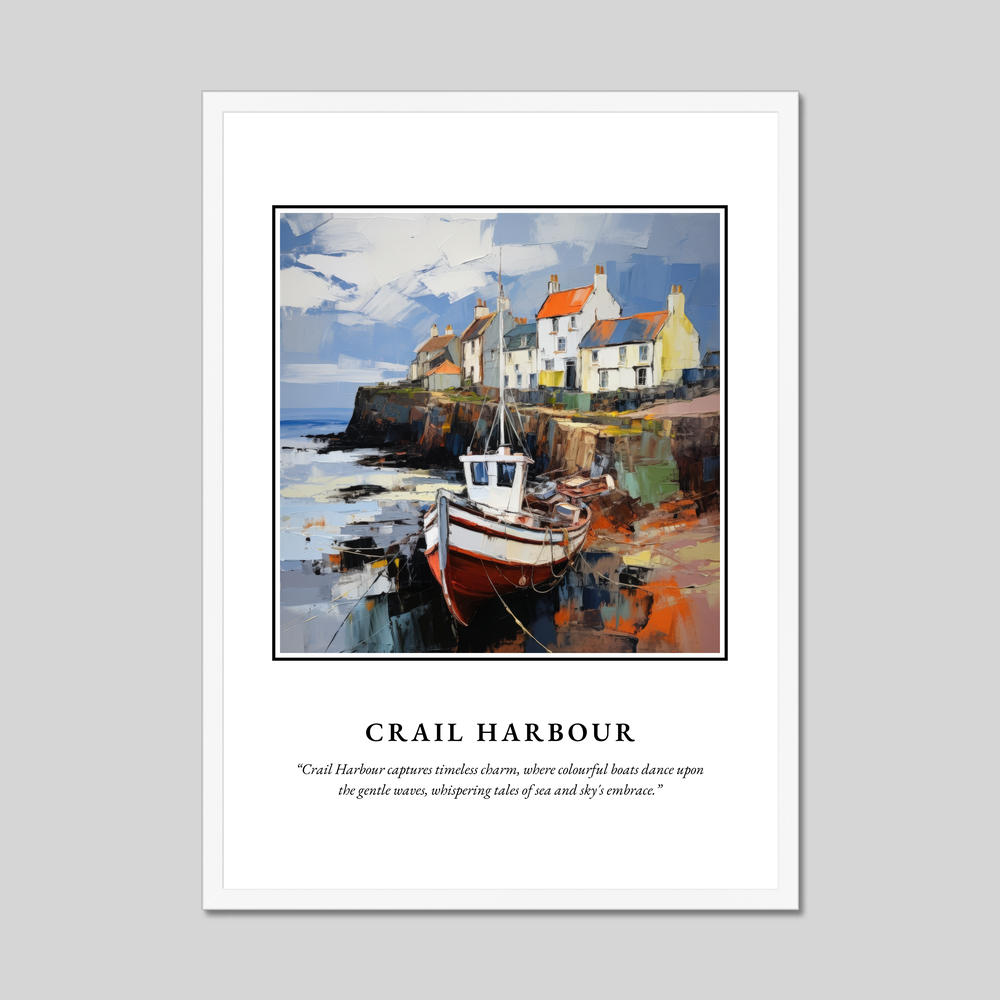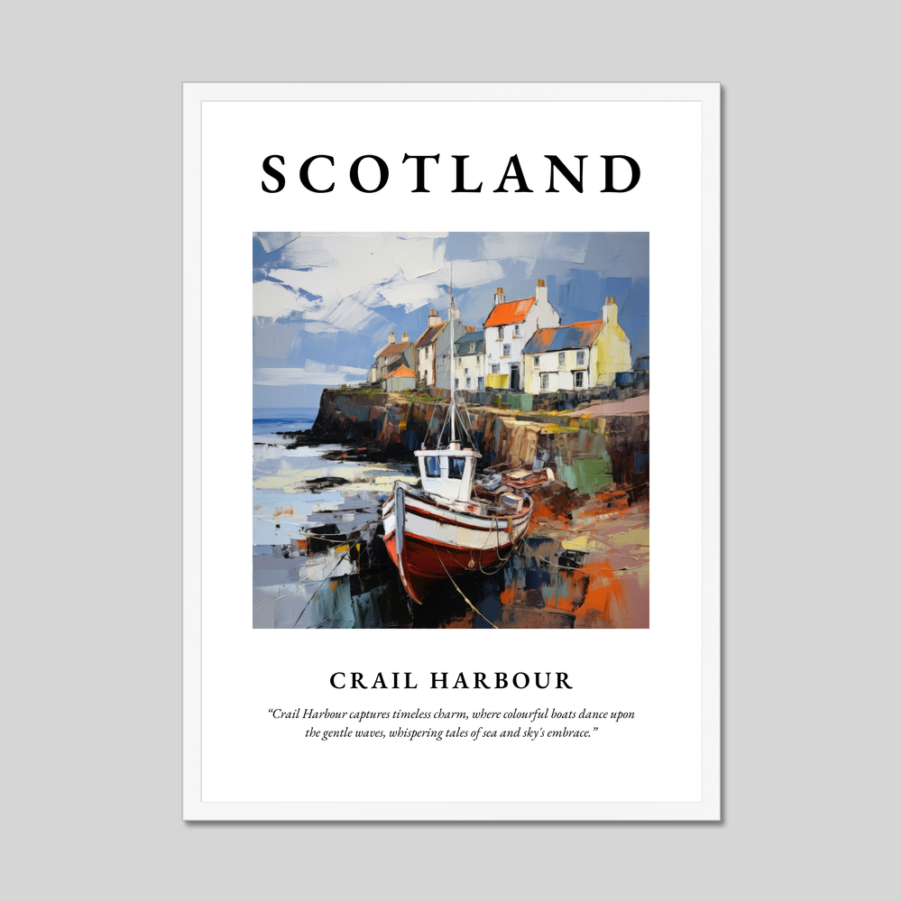 Crail Harbour, nestled in the East Neuk of Fife, is a treasure trove of scenic beauty and history. This charming fishing village, with its cobbled streets and historic cottages, offers a glimpse into the traditional Scottish coastal life. The harbour itself has been a safe haven for sailors for centuries, its enduring charm captured perfectly in our featured poster. The colourful boats depicted in the artwork reflect the vibrant community spirit and seafaring tales that are the heartbeat of Crail.