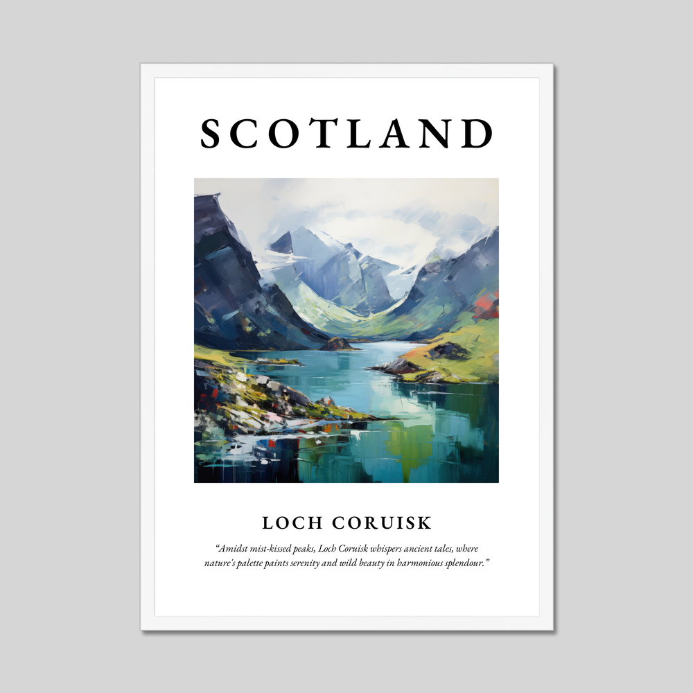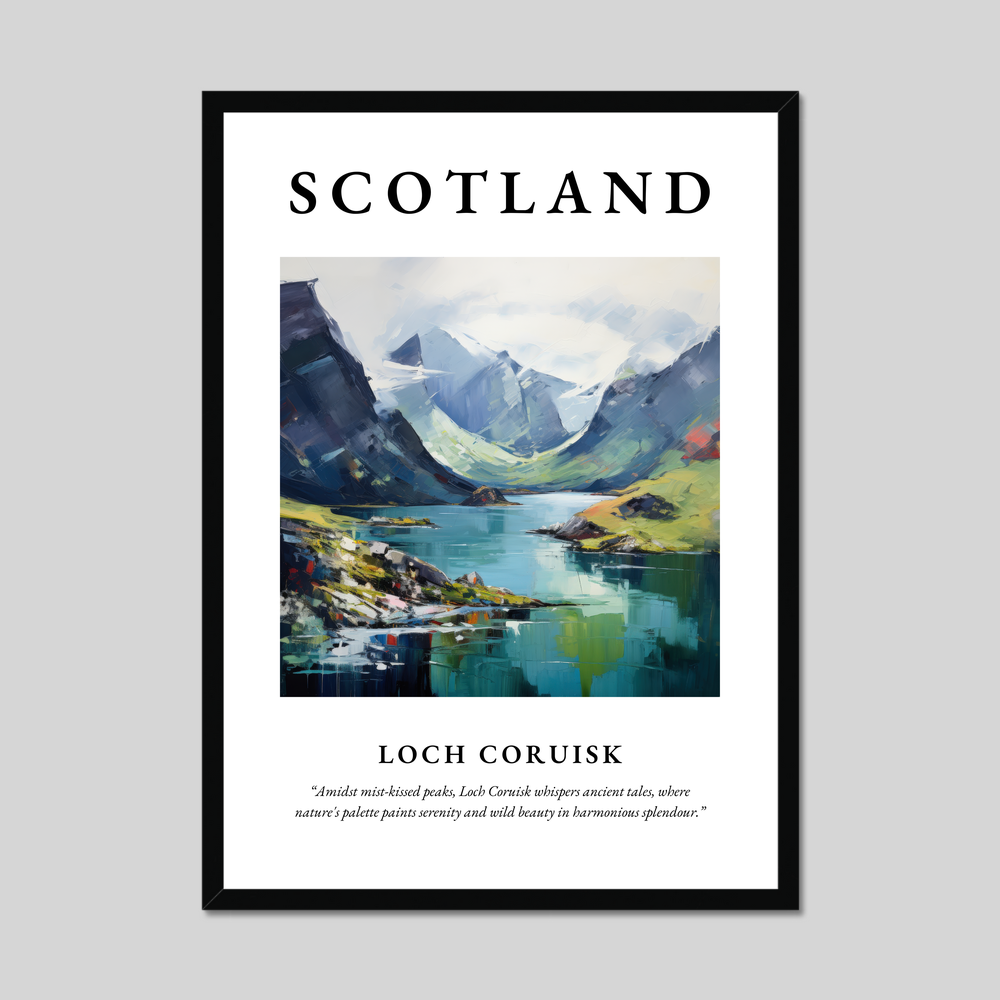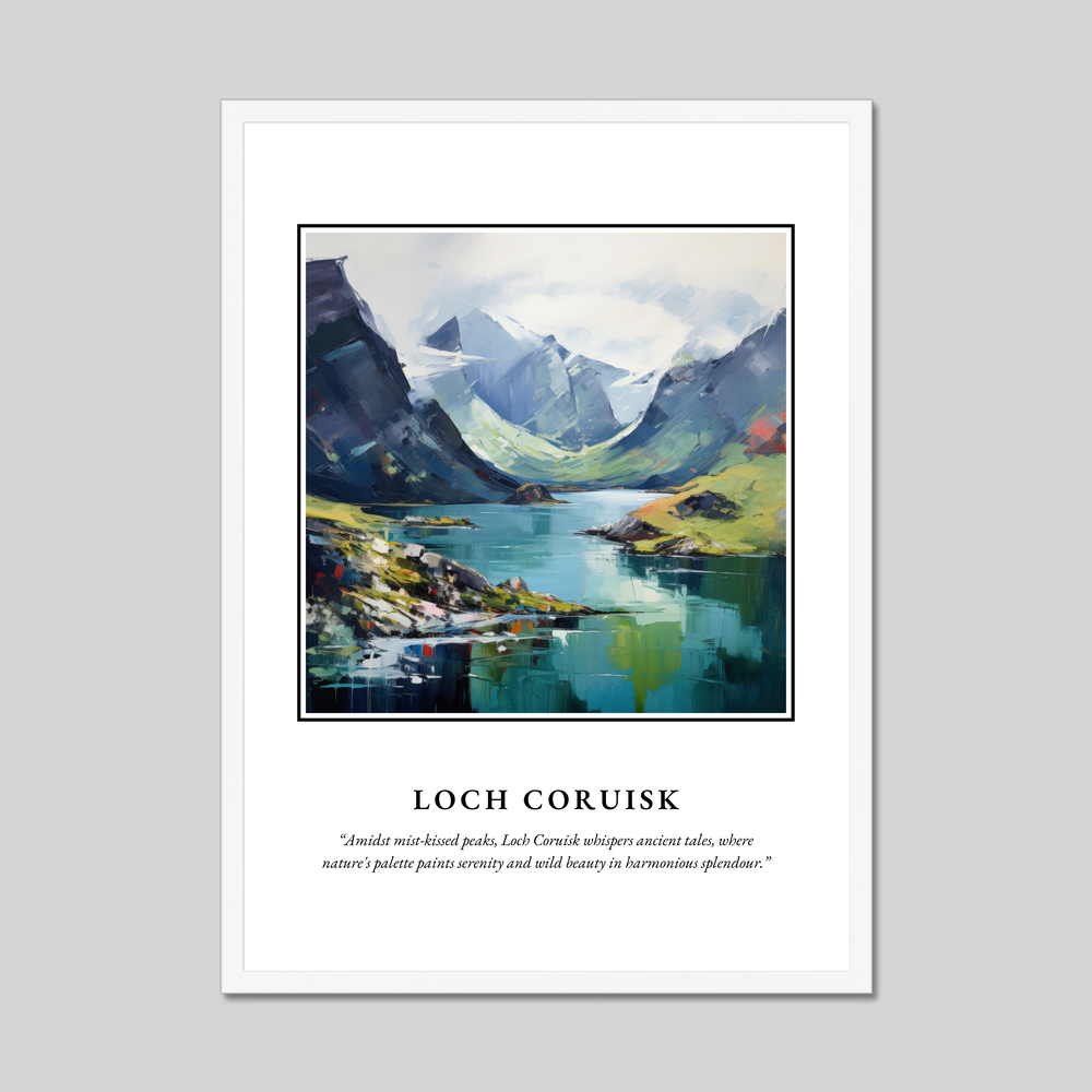 Accompanying this mesmerizing artwork is the evocative quote: "Amidst mist-kissed peaks, Loch Coruisk whispers ancient tales, where nature's palette paints serenity and wild beauty in harmonious splendour." This captures the spirit and allure of the highlands, resonating with anyone who cherishes a connection to these captivating landscapes — whether through personal experience or a simple admiration from afar.