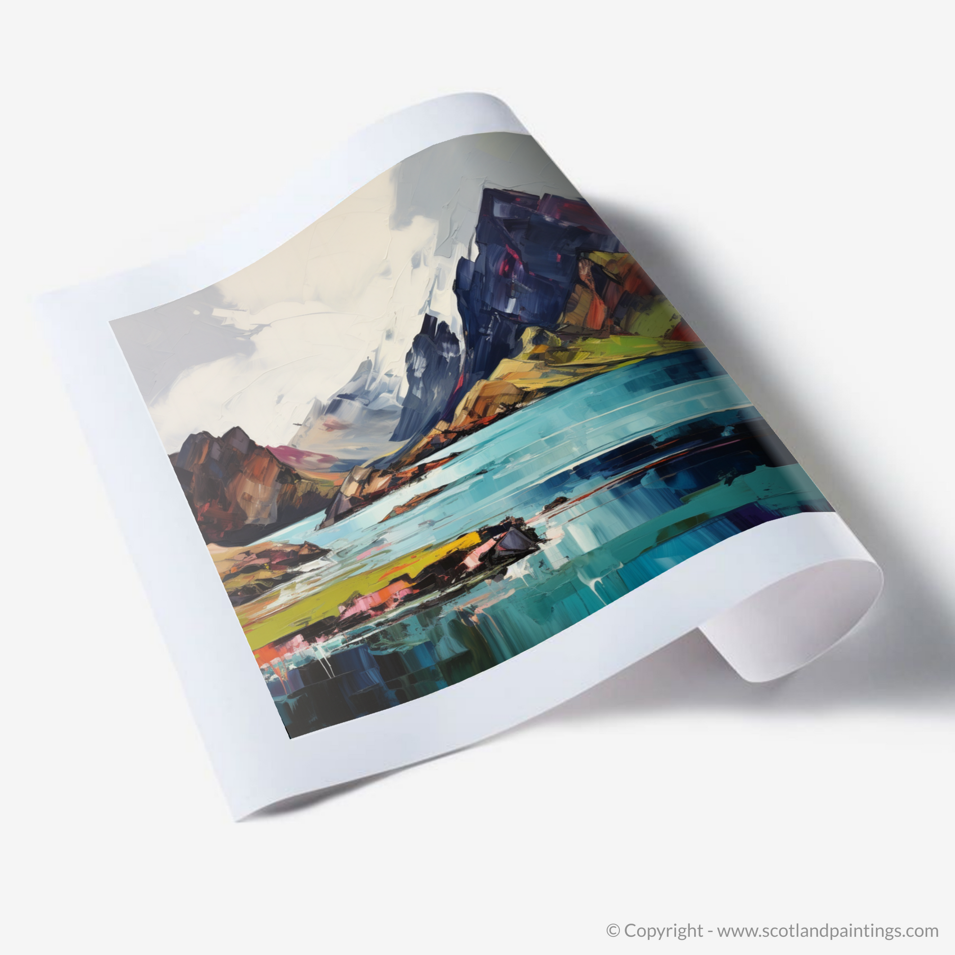 Capture the untamed beauty of Loch Coruisk, nestled within the rugged embrace of the Isle of Skye, through a striking Expressionist interpretation that breathes new life into this Scottish cove. Bold, sweeping strokes of white and grey evoke the swiftly moving clouds hanging over peaks that rise dramatically from the loch's shores. A dynamic palette of profound blues reflects the pristine waters, creating a mesmerizing contrast with the fiery hues of rust and amber that suggest the wild, heather-strewn landscapes typical of the Highlands.