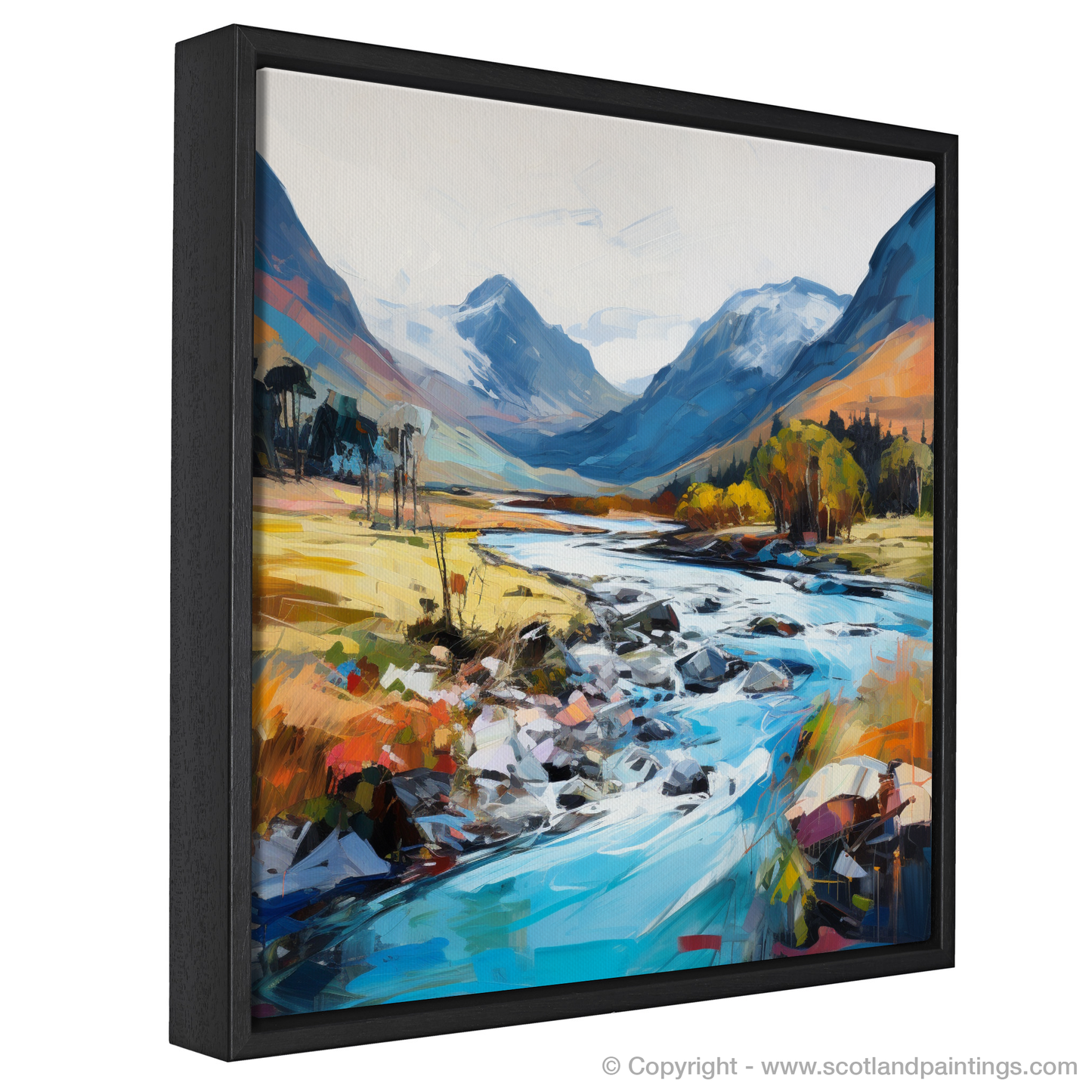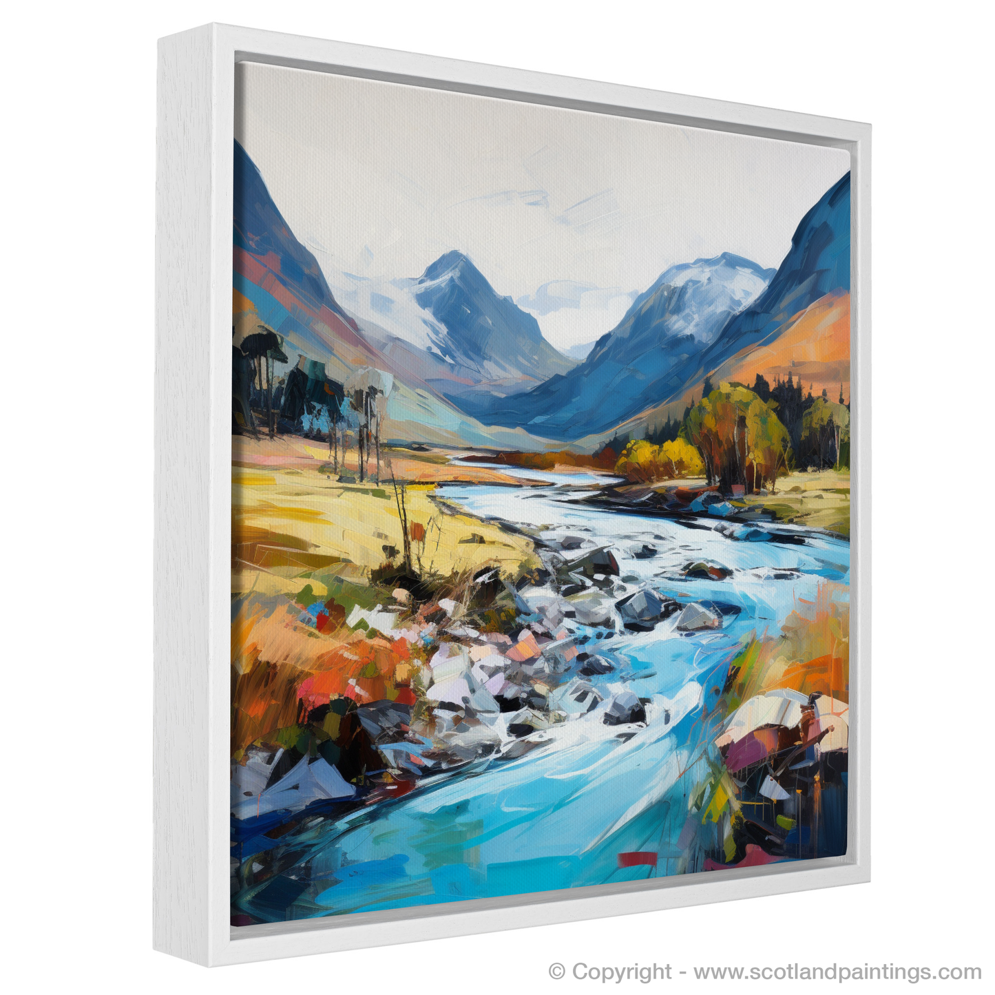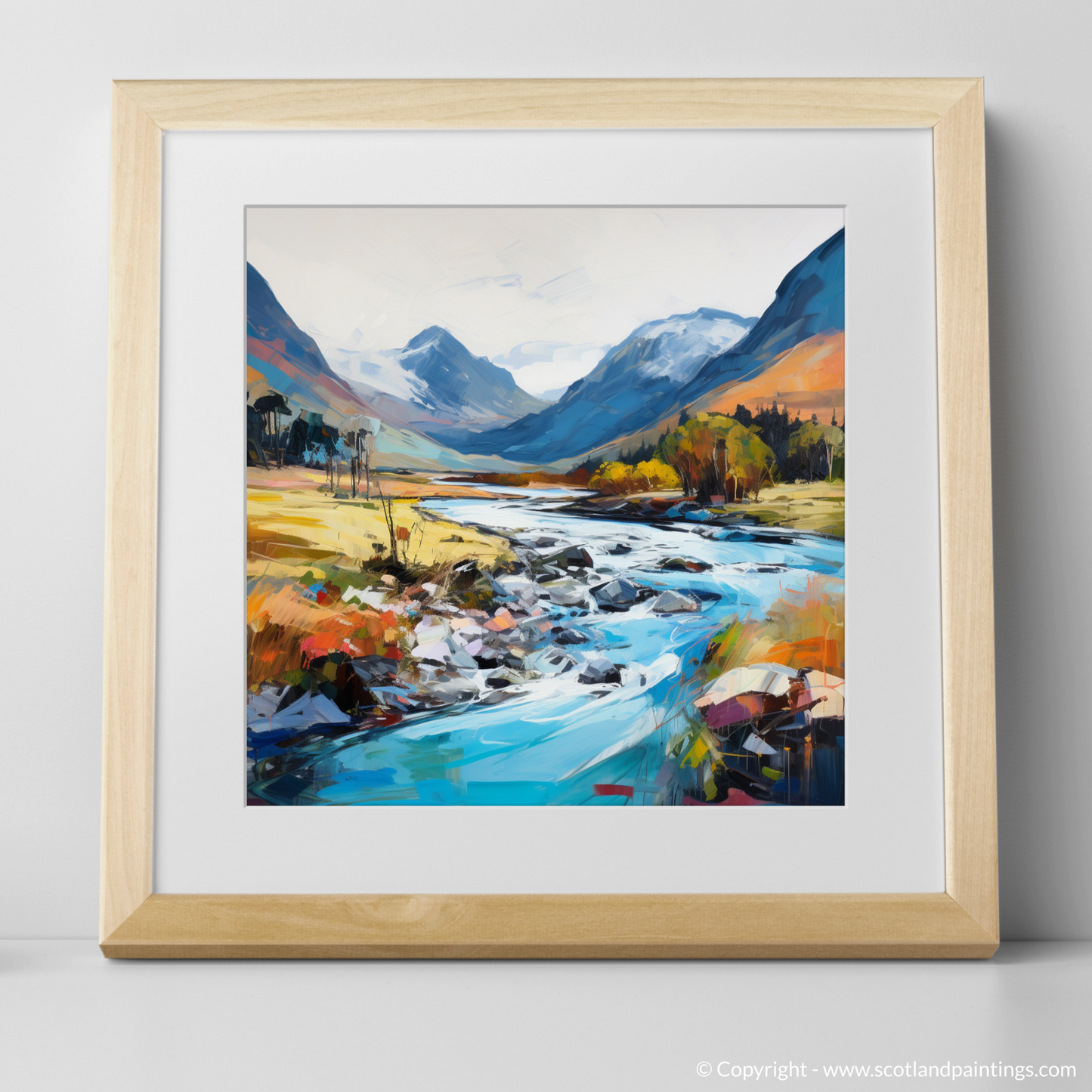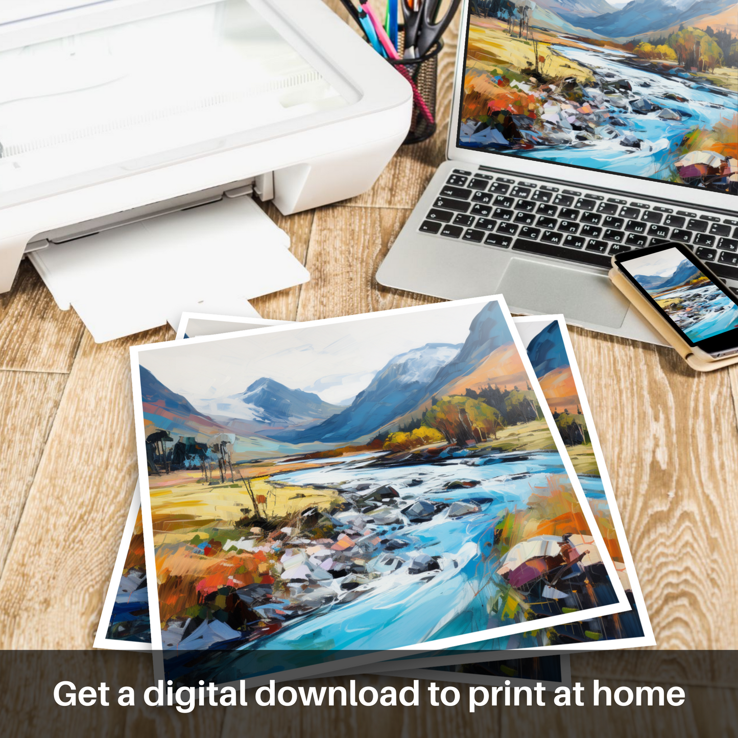 Capture the essence of the Scottish Highlands with this evocative print, inspired by the River Coe in the heart of Glencoe. This expressionist interpretation paints a vivid tableau of one of Scotland's most iconic landscapes, alive with dynamic brushstrokes and a palette that articulates the raw beauty of the region.