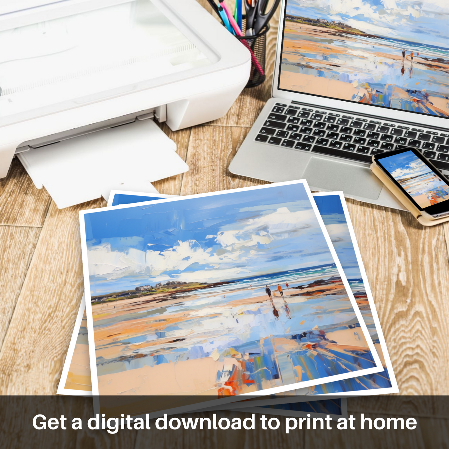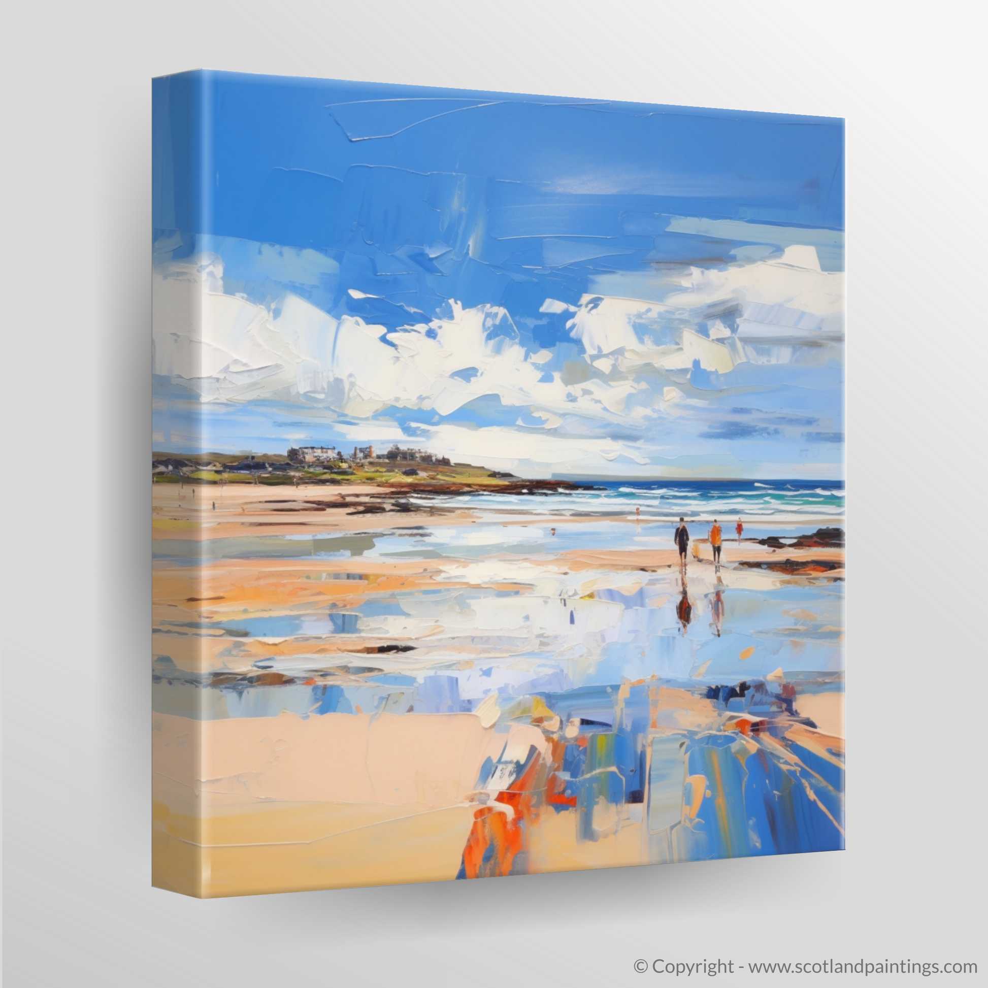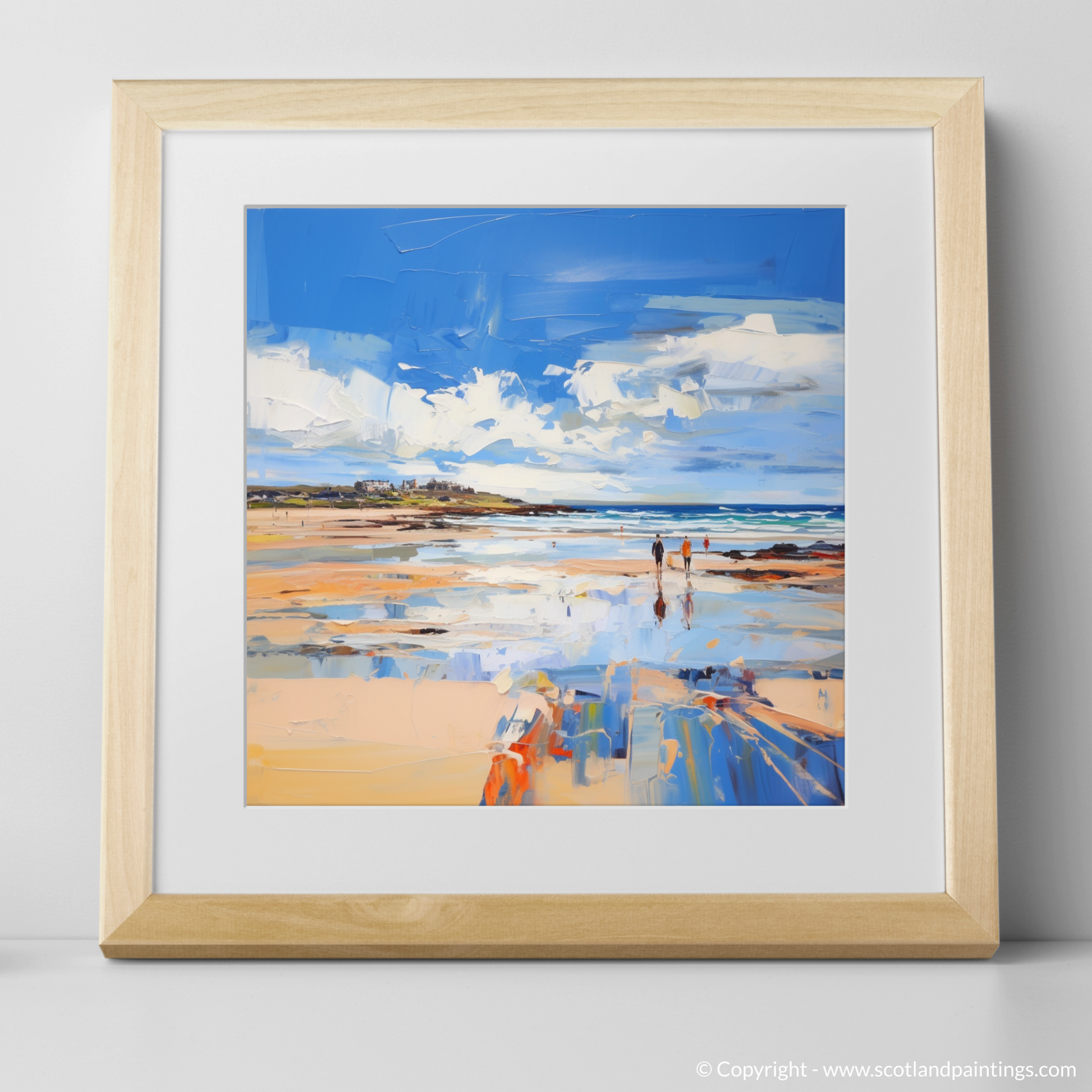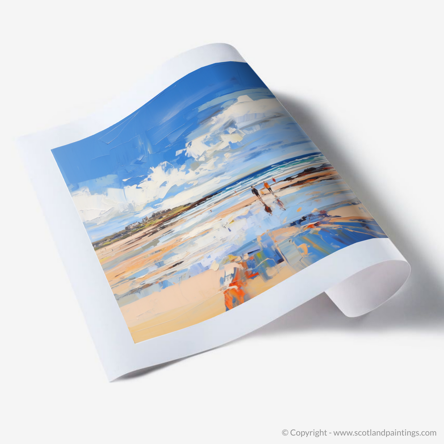 Capturing the dynamic essence of West Sands in St Andrews, this expressionist print evokes the untamed beauty and vivid colours of the Scottish coast. Bold, impasto brushstrokes animate the canvas, conveying the movement of the clouds and the swirling energy of the sea. The azure sky, a palette of blues and whites, hangs above the beach, suggesting a brisk but clear day.