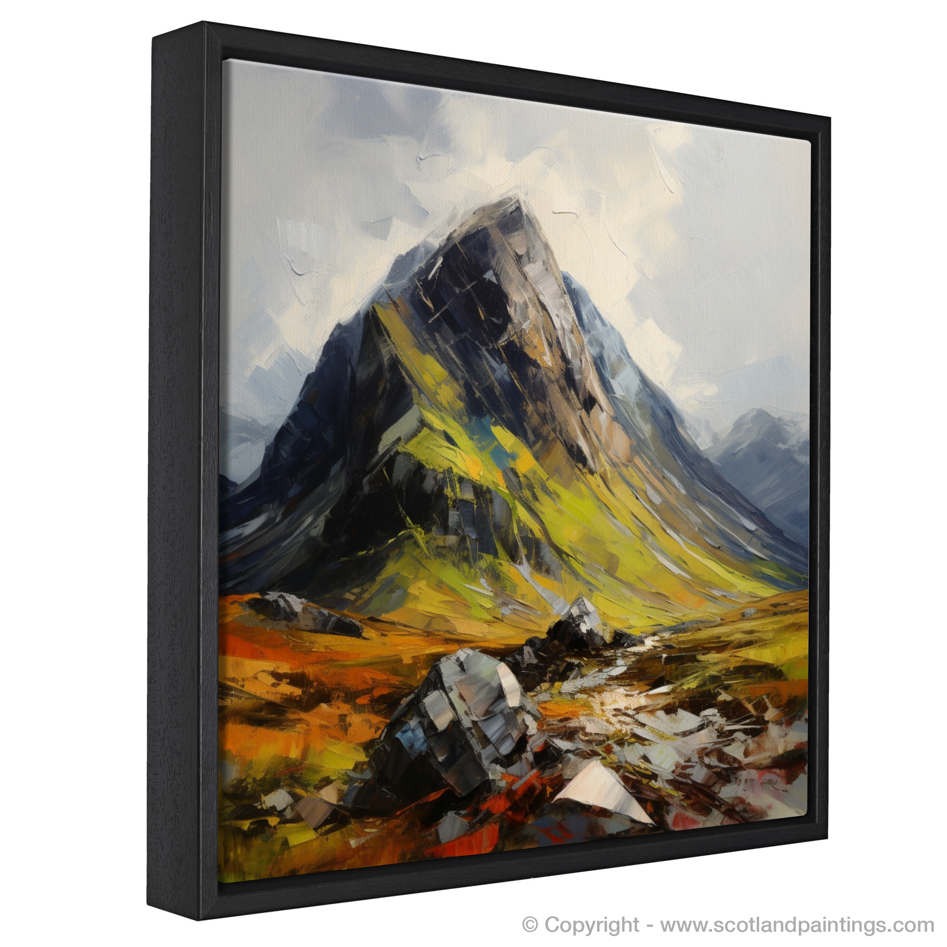Capturing the raw and stirring beauty of the Scottish Highlands, this expressive print brings to life the rugged landscape of Stob Coire Raineach of Buachaille Etive Beag. The dynamic brushstrokes convey the power and majesty of the Munro, as it rises precipitously against a brooding sky. The palette is rich with contrasts, where the dark stony facade of the mountainside is illuminated by streaks of brilliant green and gold, suggesting the fleeting warmth of sunlight over the heather and grasses.