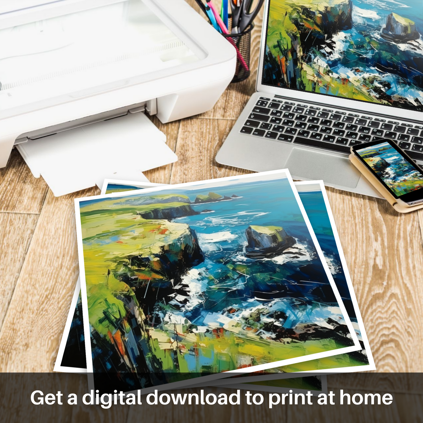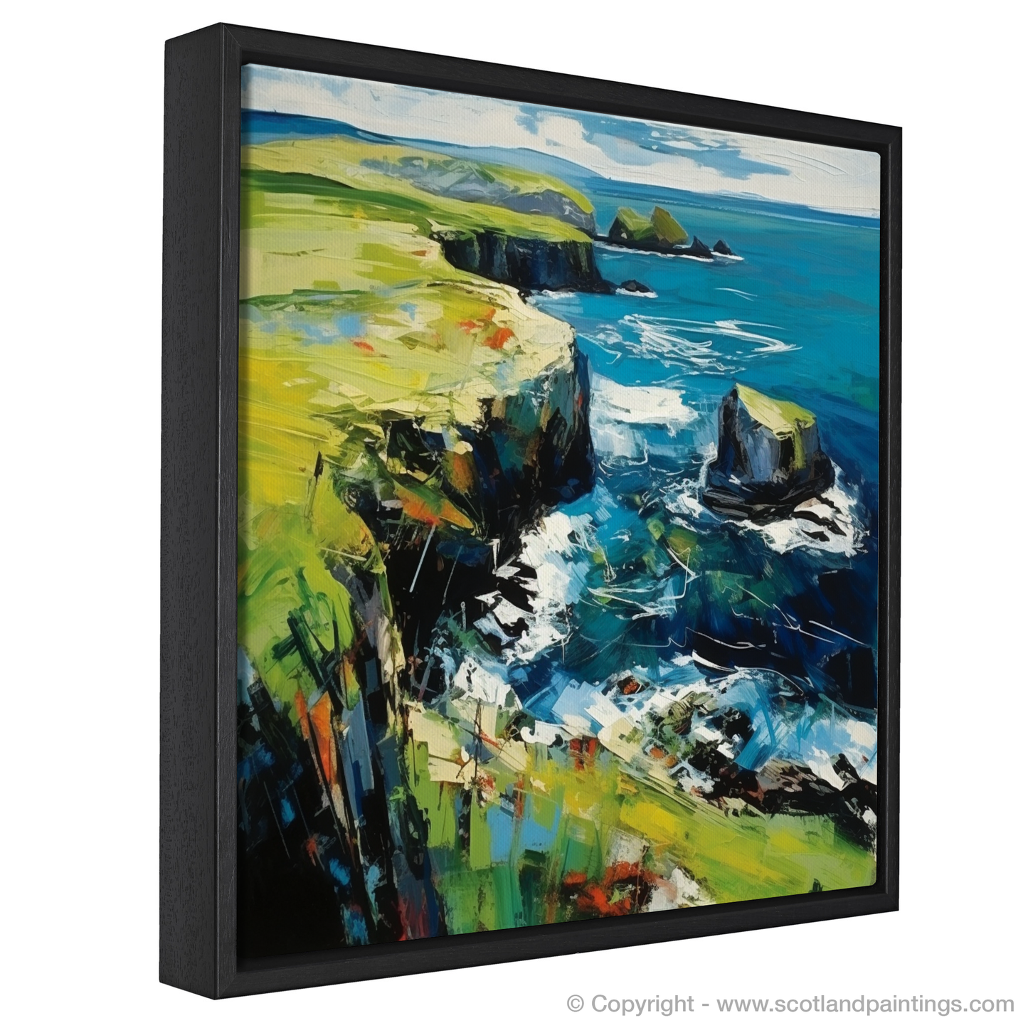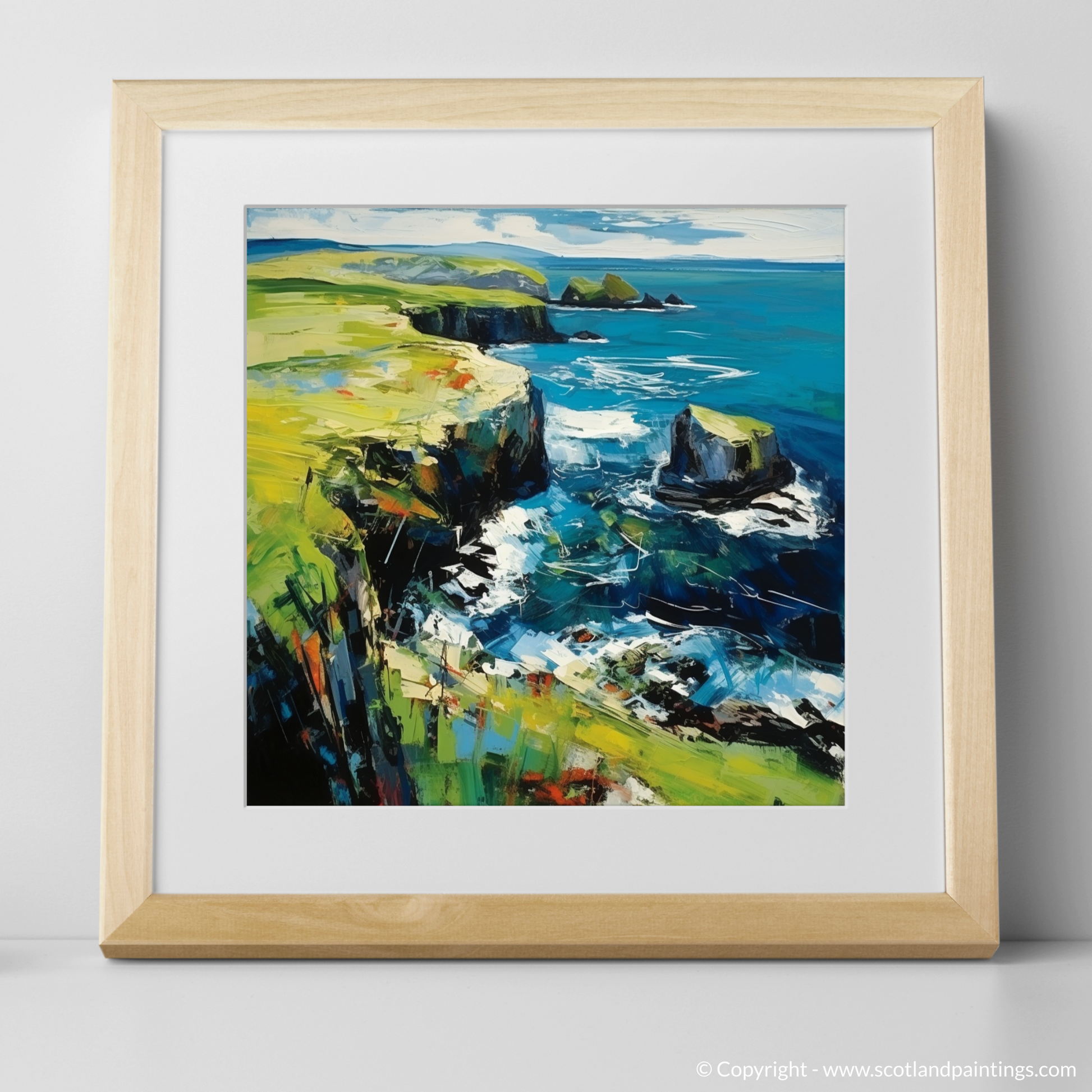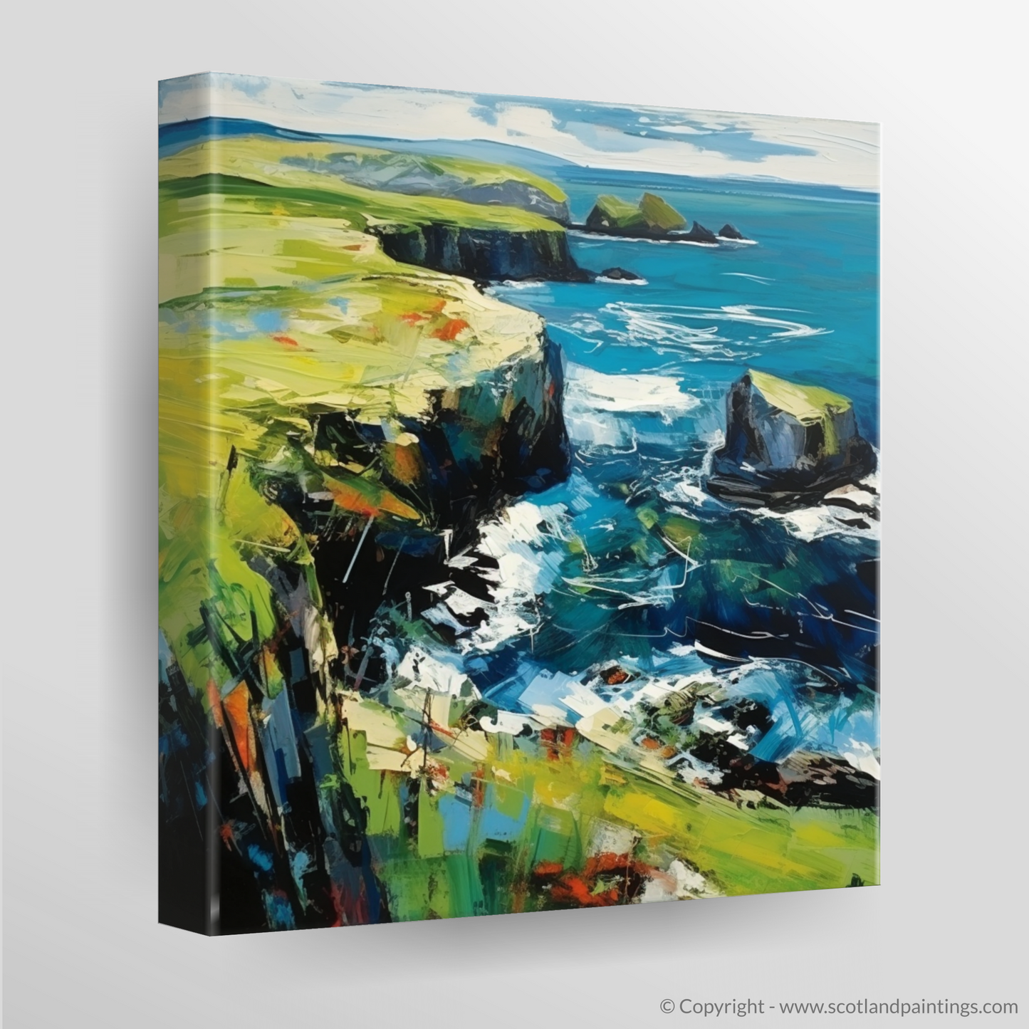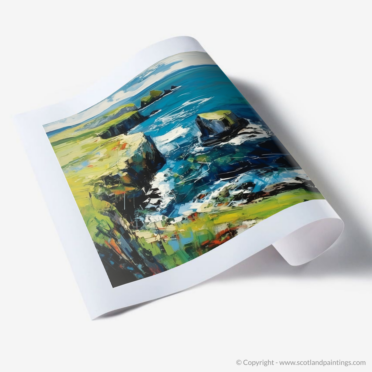 Capture the raw, untamed beauty of the Shetland isles with this evocative expressionist piece. The artwork conveys the rugged coastal landscape through bold, impasto brushstrokes that brim with life and motion. Vivid blues and teals meld with the frothy whites of the sea, representing the dynamic interplay between the ocean and the wind-whipped shorelines. The cliff faces rise steeply, daubed with dark shadows and bright highlights, suggesting the play of sunlight and the stark contrasts inherent to this northern locale.