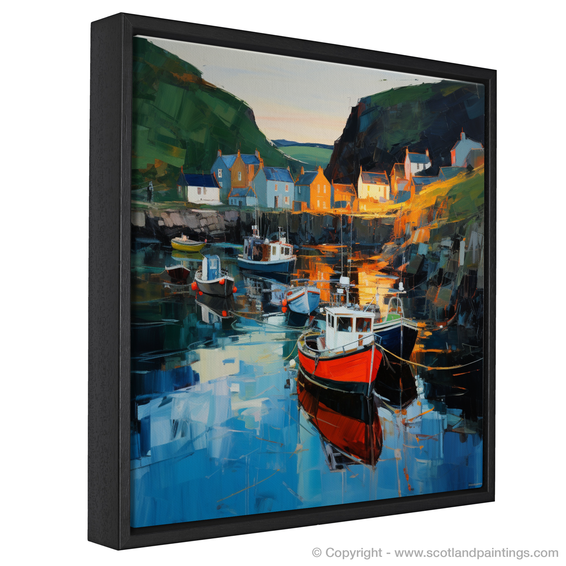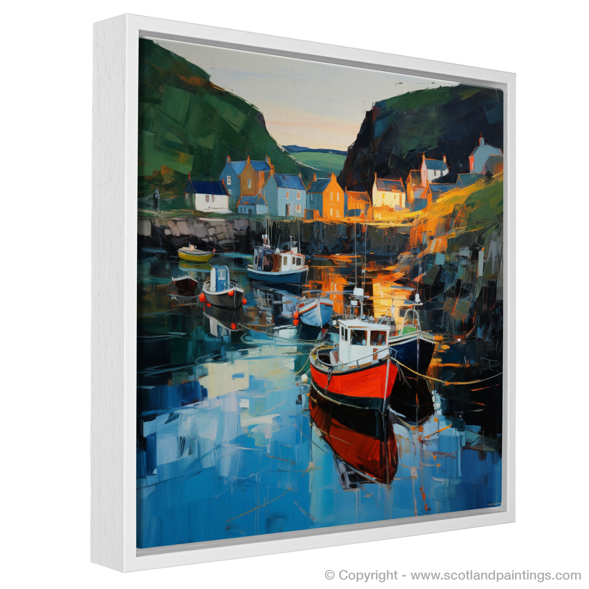 Capturing the serene essence of a Scottish harbour at the enchanting hour of dusk, this evocative print presents the quaint and picturesque Gardenstown Harbour in an expressionist style that brims with emotion and vibrancy. Bold brushstrokes and a rich palette evoke the fading light of day as it dances across the tranquil waters and the charming harbourside dwellings.