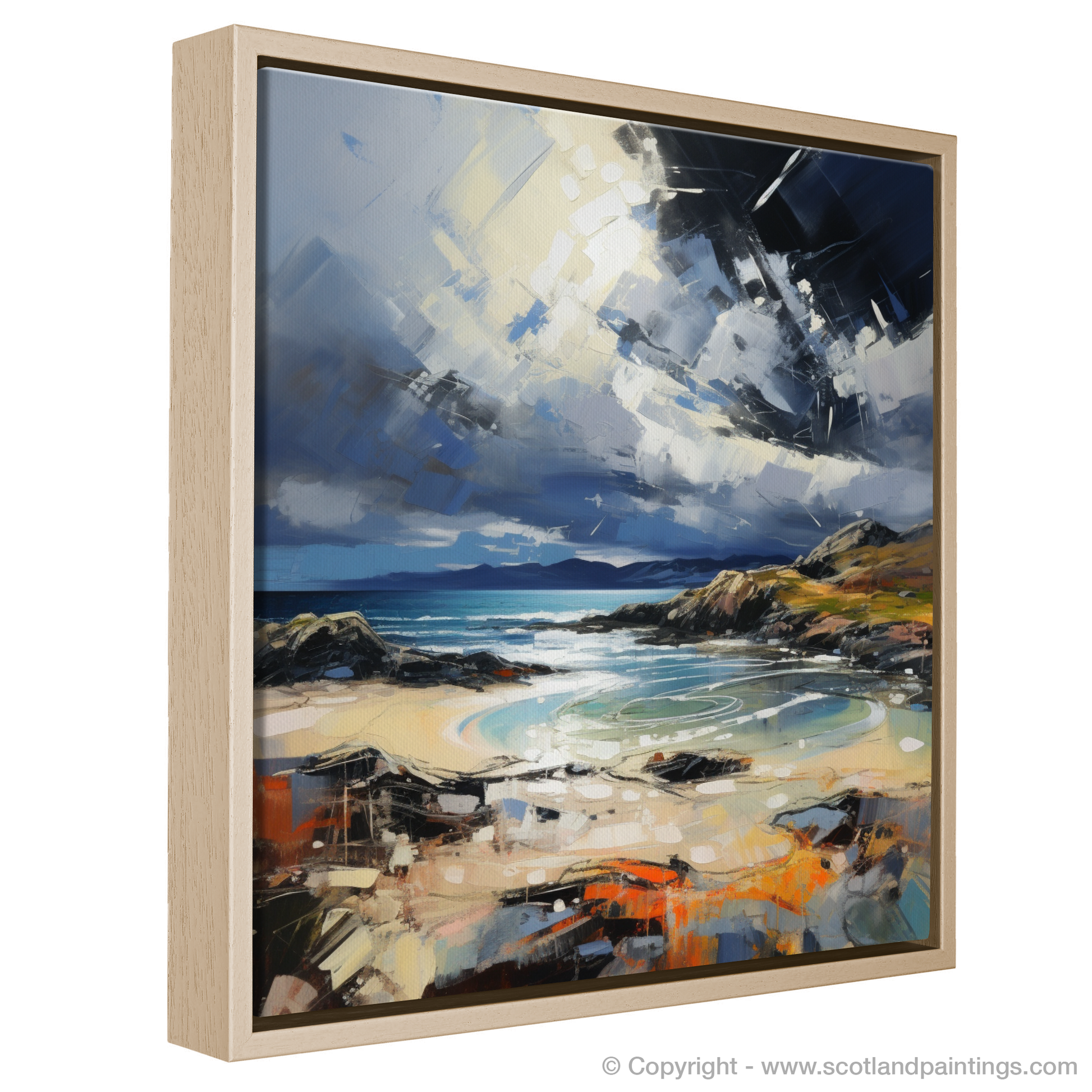 Capturing the raw and tumultuous beauty of Scotland's coast, this evocative piece brings the seething energy of Achmelvich Bay's stormy atmosphere into your space. Broad, impasto strokes of white and grey clash across the canvas, the sky an uproar of expressive brushwork that conveys the intensity of the elements. A burst of light through the tempest suggests the fleeting hope of sunshine amidst the prevailing gales.