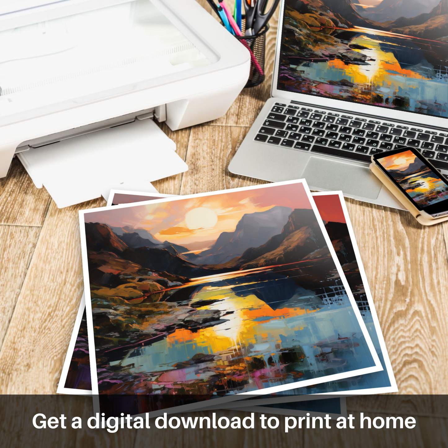 Capture the raw emotion and dramatic beauty of Scotland's rugged landscapes with this exquisite print inspired by the tranquil yet imposing Loch Coruisk. This piece is a vivid testament to the power of Expressionism, where the artist's passionate brushstrokes and bold use of colour convey the sublime energy of nature.