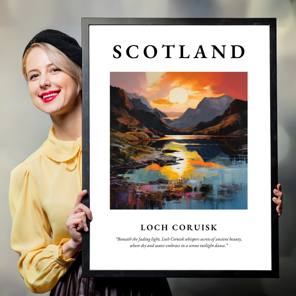 The bold lettering of “SCOTLAND” crowns this stunning visual piece, drawing your eye to the heart of the artwork—a vivid expressionist rendering of Loch Coruisk. The painting encapsulates the mystical allure of one of Scotland’s most remote and breathtaking lochs, where dramatic hues blend with dynamic brushstrokes to depict the ethereal landscape. The quote below captures the loch’s essence: “Beneath the fading light, Loch Coruisk whispers secrets of ancient beauty, where sky and water embrace in a serene twilight dance.”