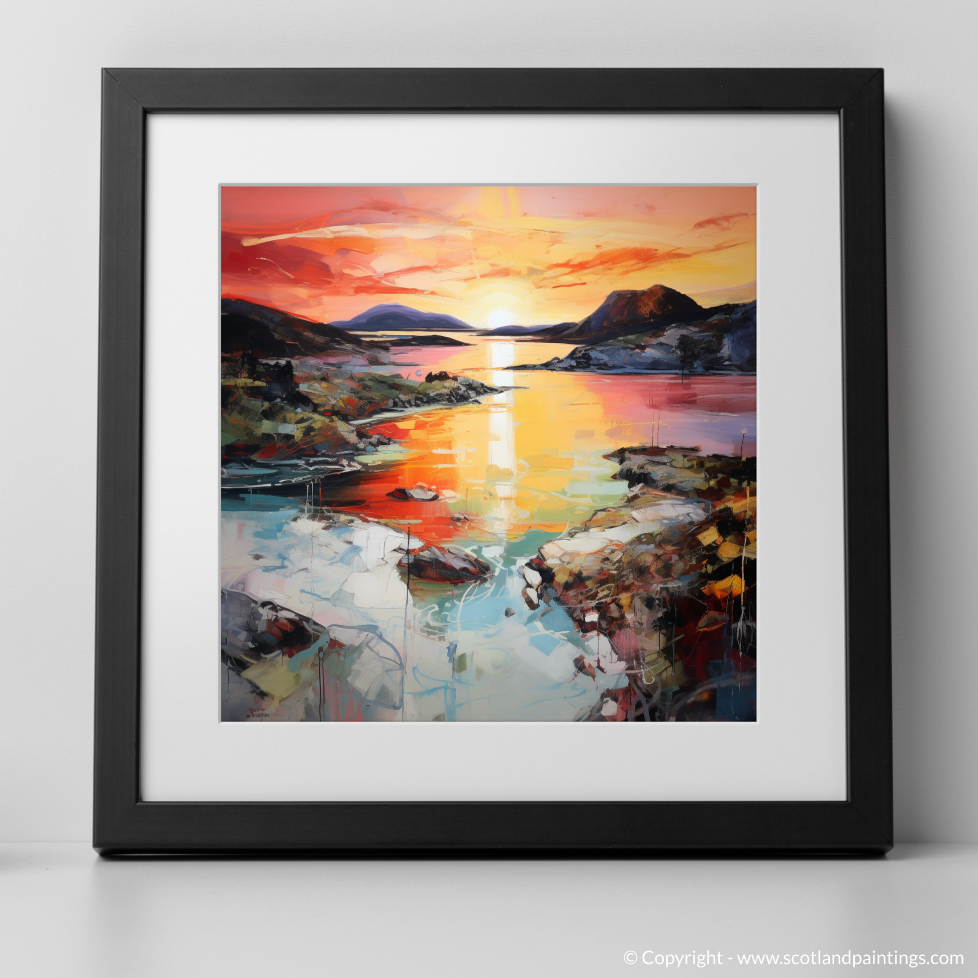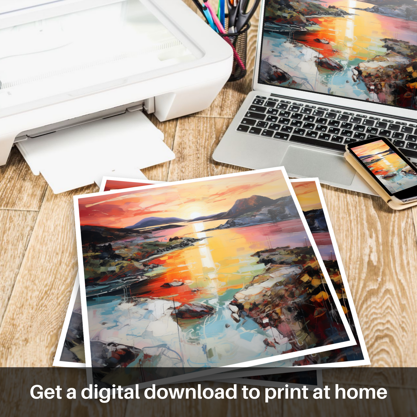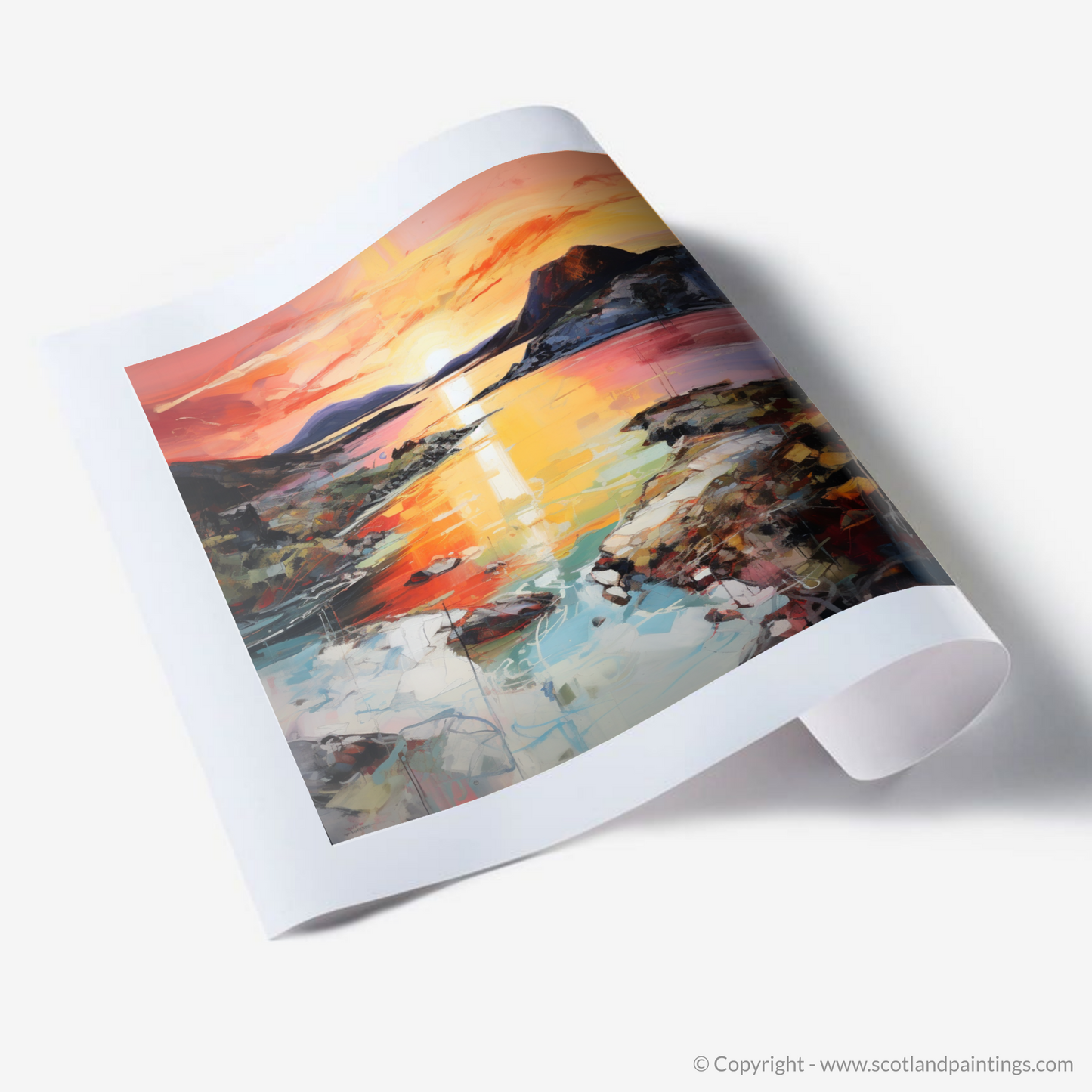 Amidst this dance of colour and texture, the cool serenity of the bay reflects the warm sky, with the painterly treatment infusing the scene with a dream-like quality that verges on the abstract. This print invites viewers to revel in the emotional resonance of a Scottish sunset, a moment suspended between the wildness of nature and the introspective gaze of the beholder.
