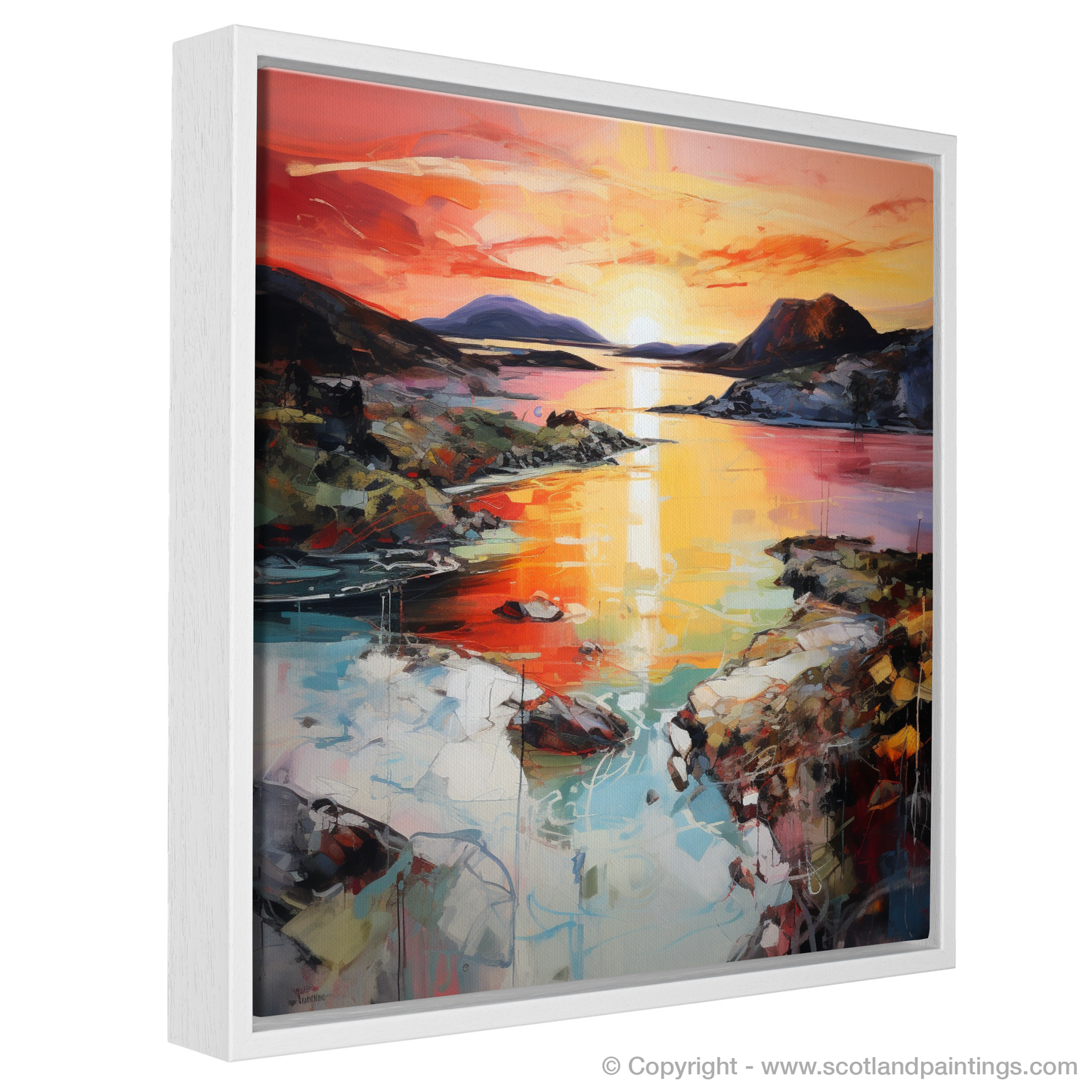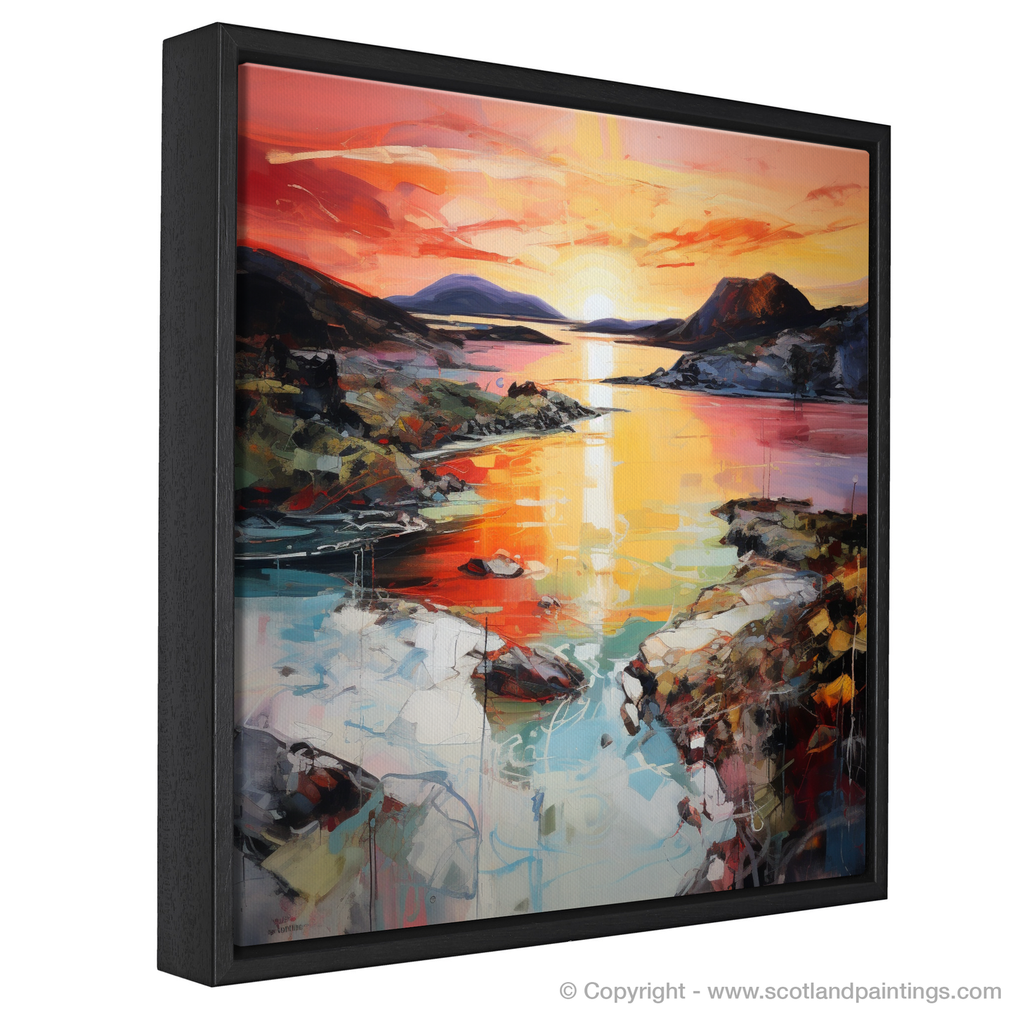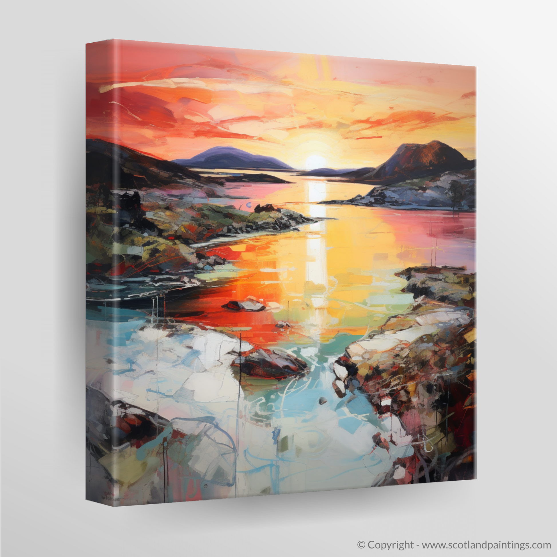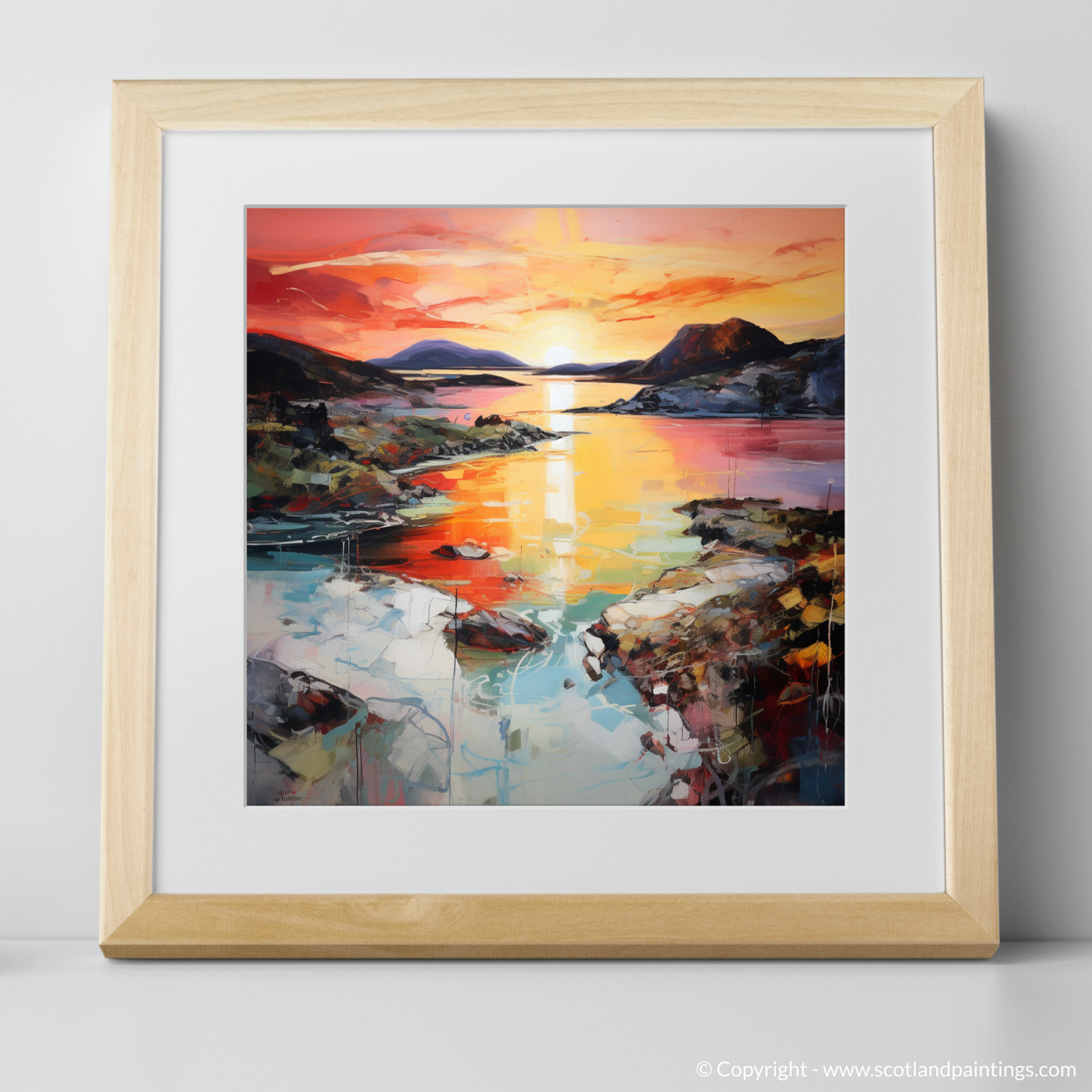 Amidst this dance of colour and texture, the cool serenity of the bay reflects the warm sky, with the painterly treatment infusing the scene with a dream-like quality that verges on the abstract. This print invites viewers to revel in the emotional resonance of a Scottish sunset, a moment suspended between the wildness of nature and the introspective gaze of the beholder.