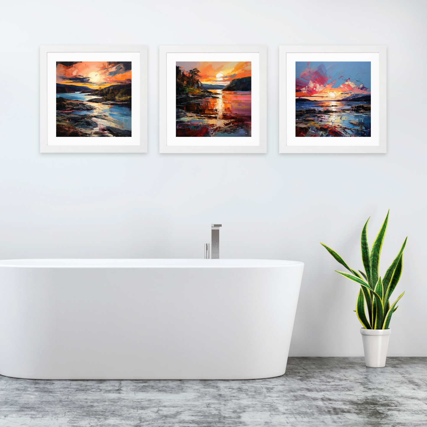 This versatile set is designed to enhance a variety of spaces within your home. Whether adorning a kitchen wall, nestled above a cosy fireplace, enhancing a bedroom, climbing a staircase, or complementing a gallery wall, the prints add a refined touch of elegance and charm to your décor. Available in classic black or white frames, with bespoke colour options by request to hello@scotlandpaintings.com, these prints measure 40cm each. Arranged side by side, the set spans an impressive 150cm, offering a stylish and budget-friendly way to fill a large wall space without the need for an oversized piece.