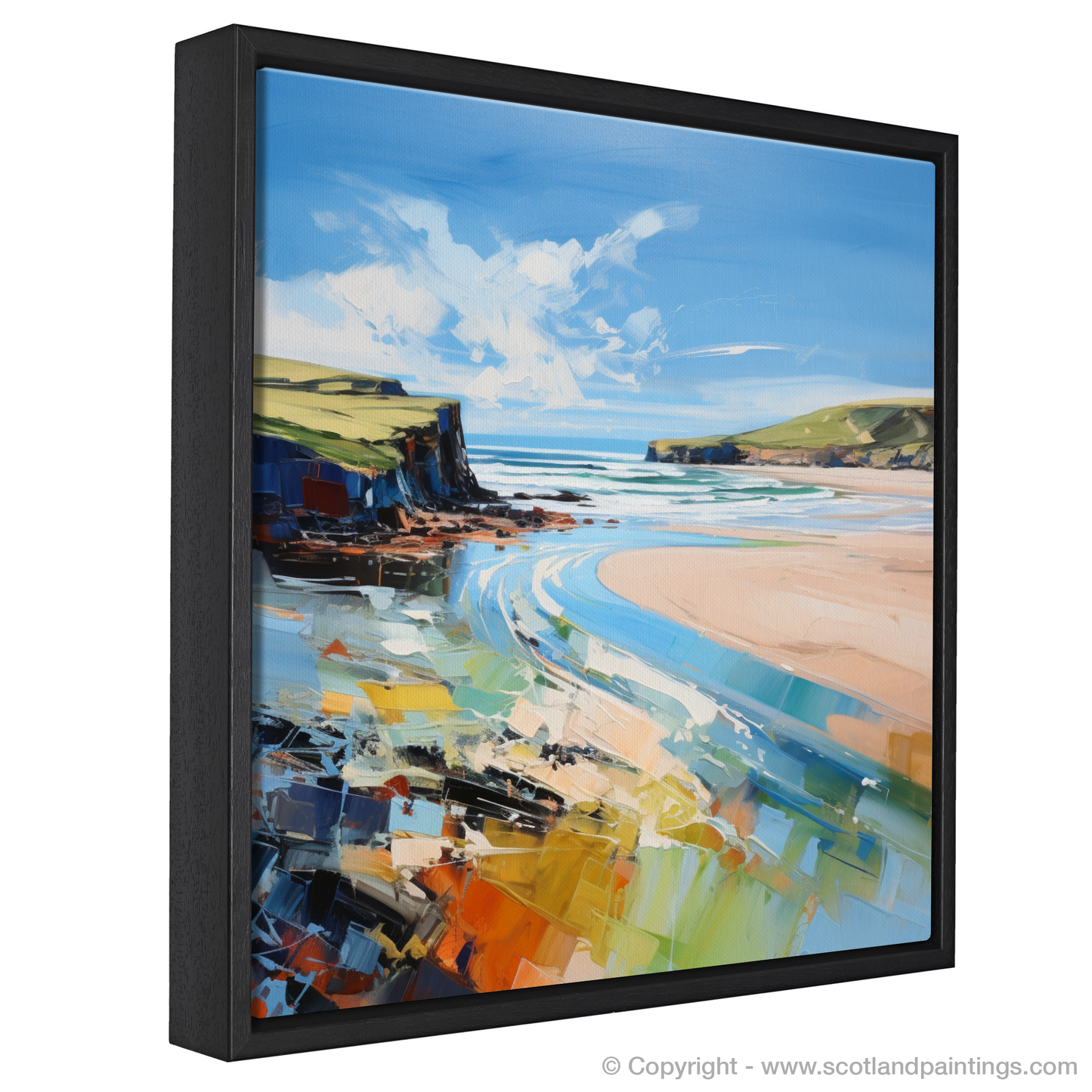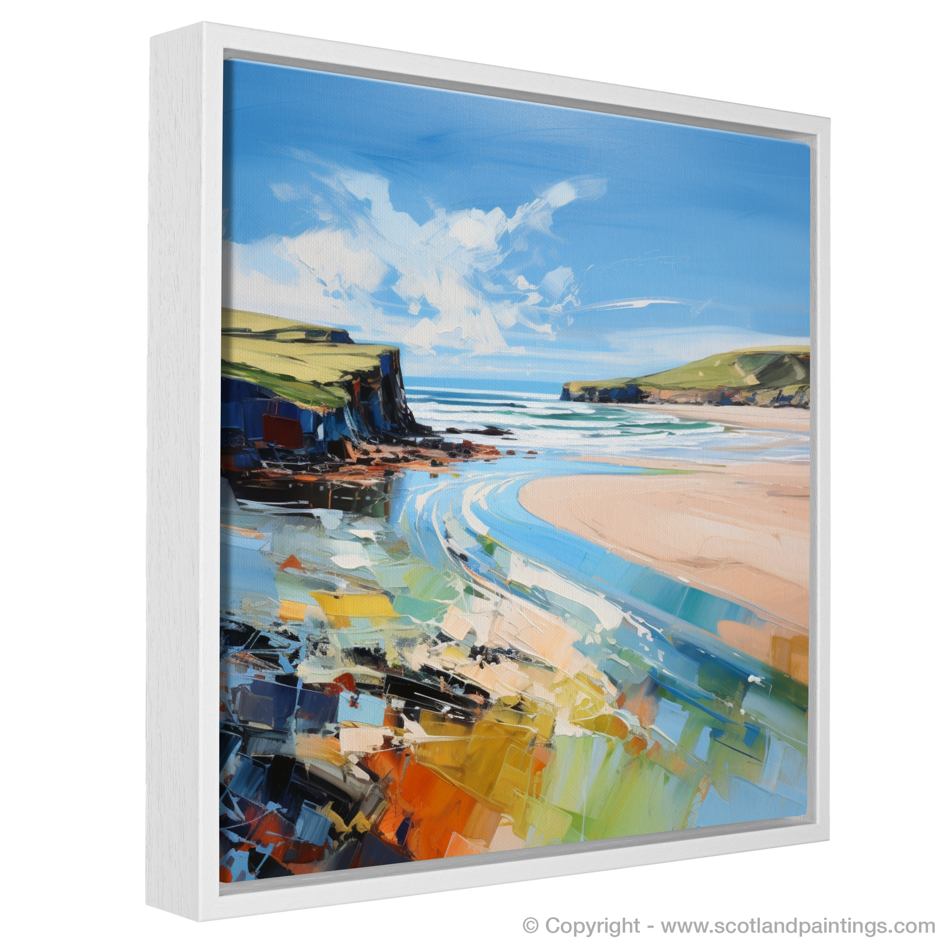 Captured in the evocative and emotionally charged strokes characteristic of Expressionism, this painting celebrates the raw beauty of Lunan Bay, Angus. The artwork is rich with vibrant, sweeping hues that encapsulate the wild spirit of this Scottish beach. Bold, impasto brushwork brings the seascape to life, conveying movement in the clouds billowing across a cerulean sky and in the tumultuous waves that kiss the shore.