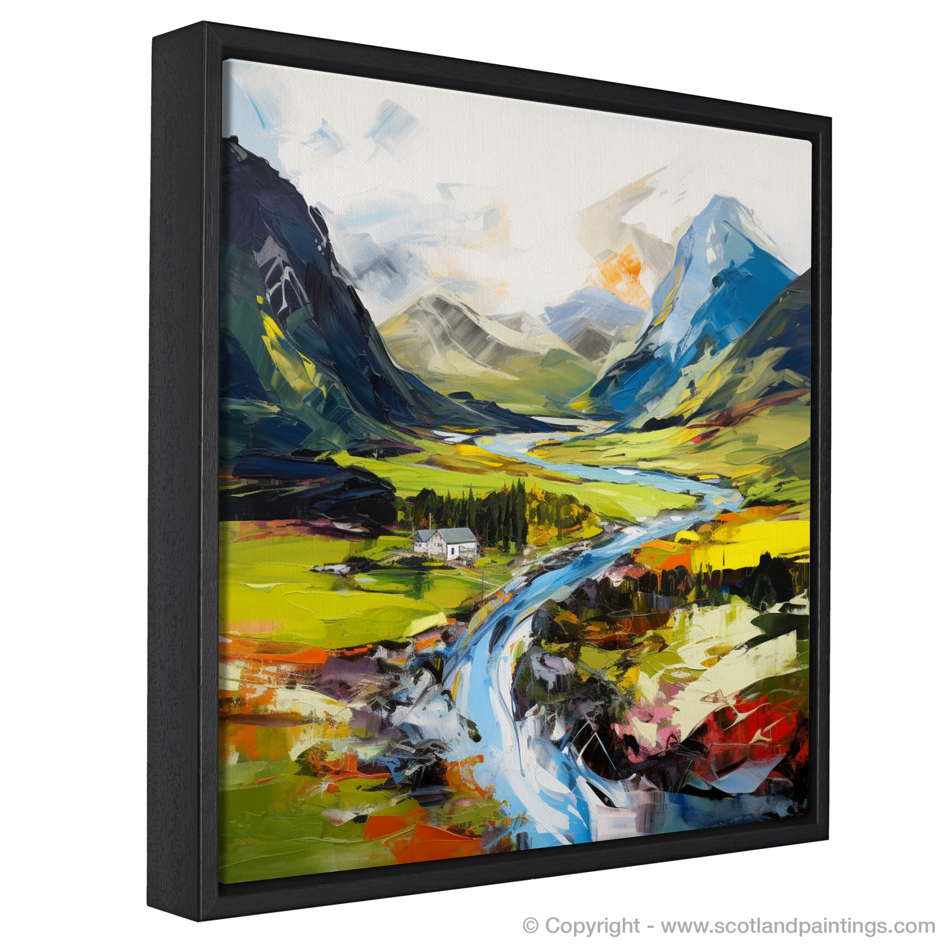Capturing the turbulent beauty of the Scottish Highlands, this vivid print is a magnificent tribute to the raw and untamed landscape of Glencoe in Argyll and Bute. Rendered in a palette that is at once both wild and harmonious, the expressionist strokes convey the sweeping drama of the glen with vibrant intensity. The meandering river, depicted in an array of blues, anchors the composition, drawing the eye across the verdant valley floor, punctuated with bright yellows and deep greens that suggest the lush terrain and patchwork fields.
