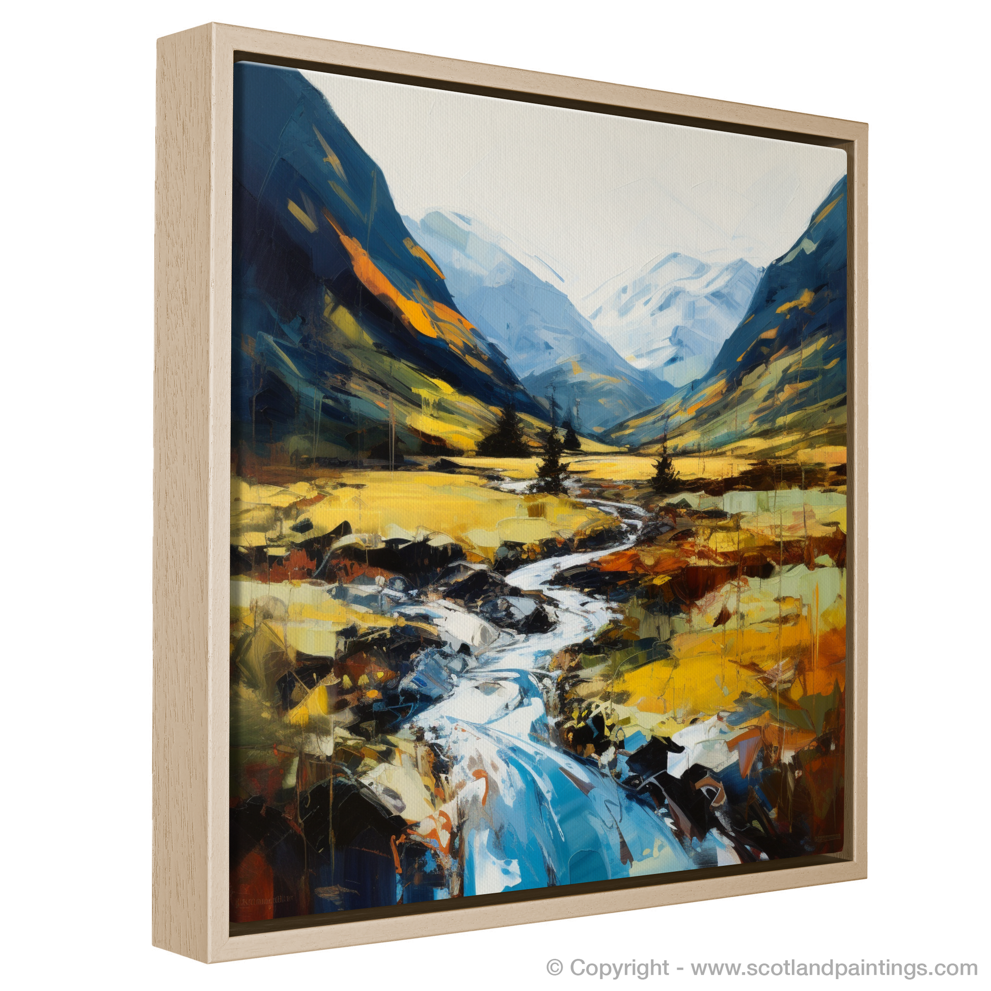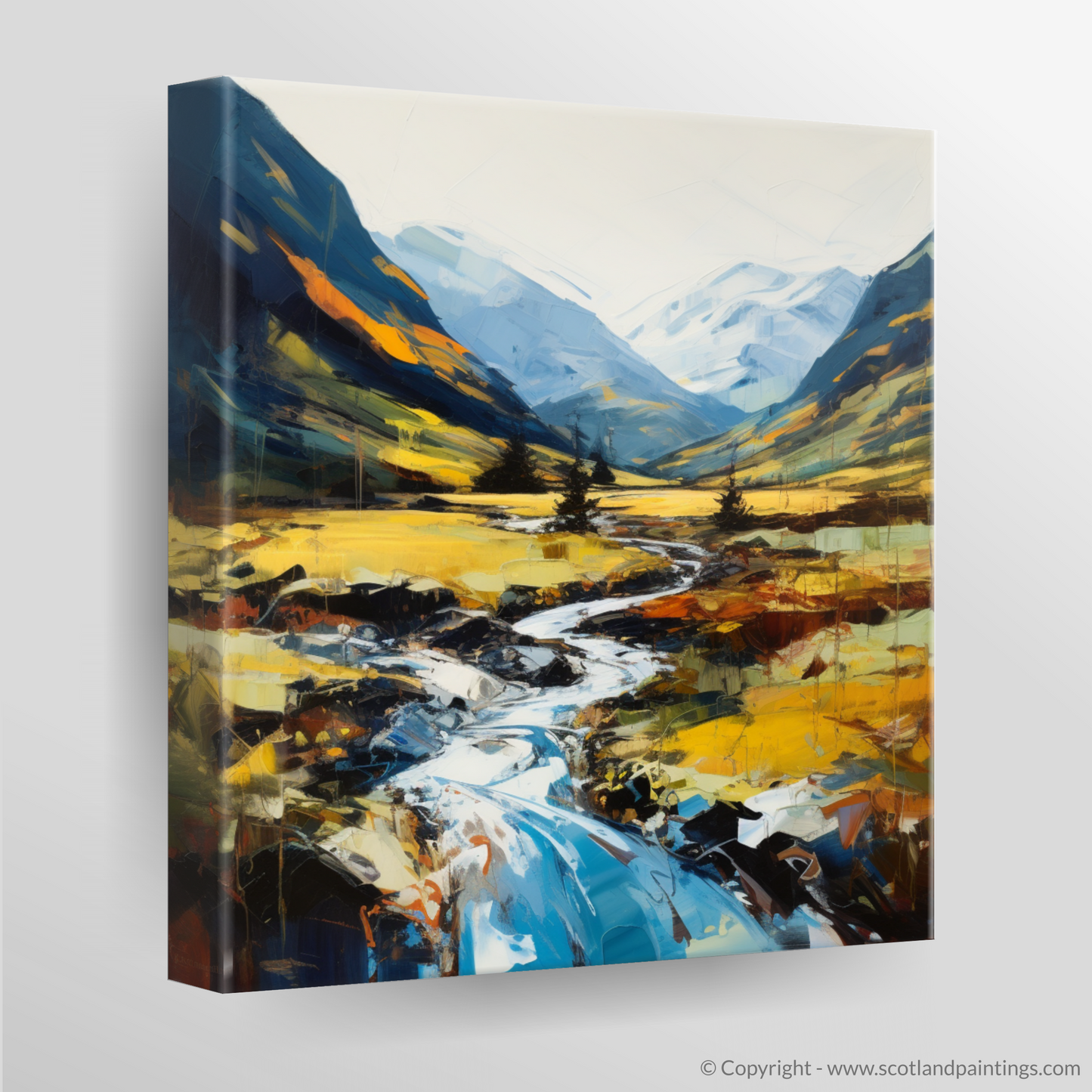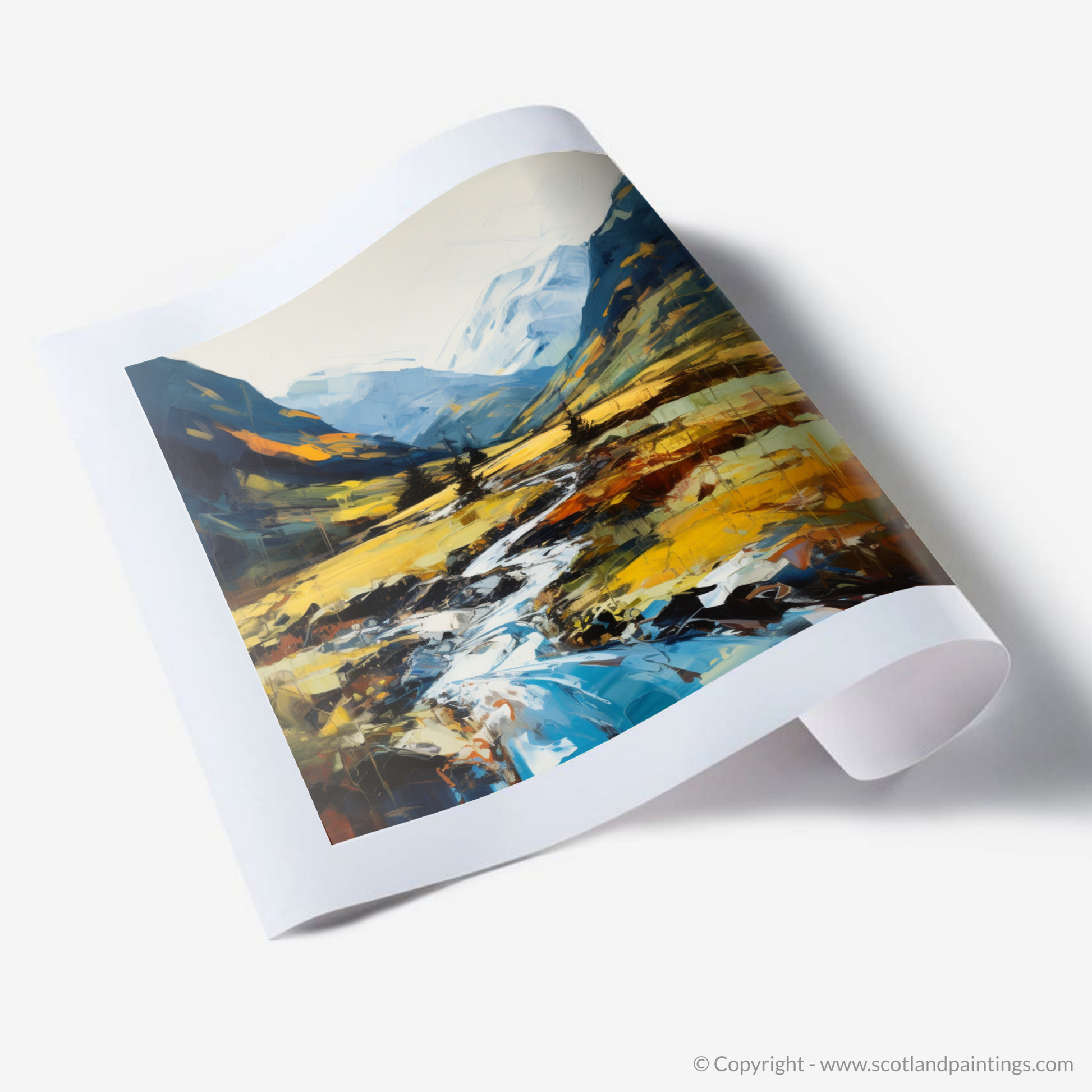 Capturing the raw, untamed beauty of the Scottish Highlands, this expressionist print transports viewers into the heart of Glen Nevis. Vivid, dynamic strokes of paint vividly depict the sweeping landscape, where the rugged tranquillity of nature is manifest in every brushstroke.