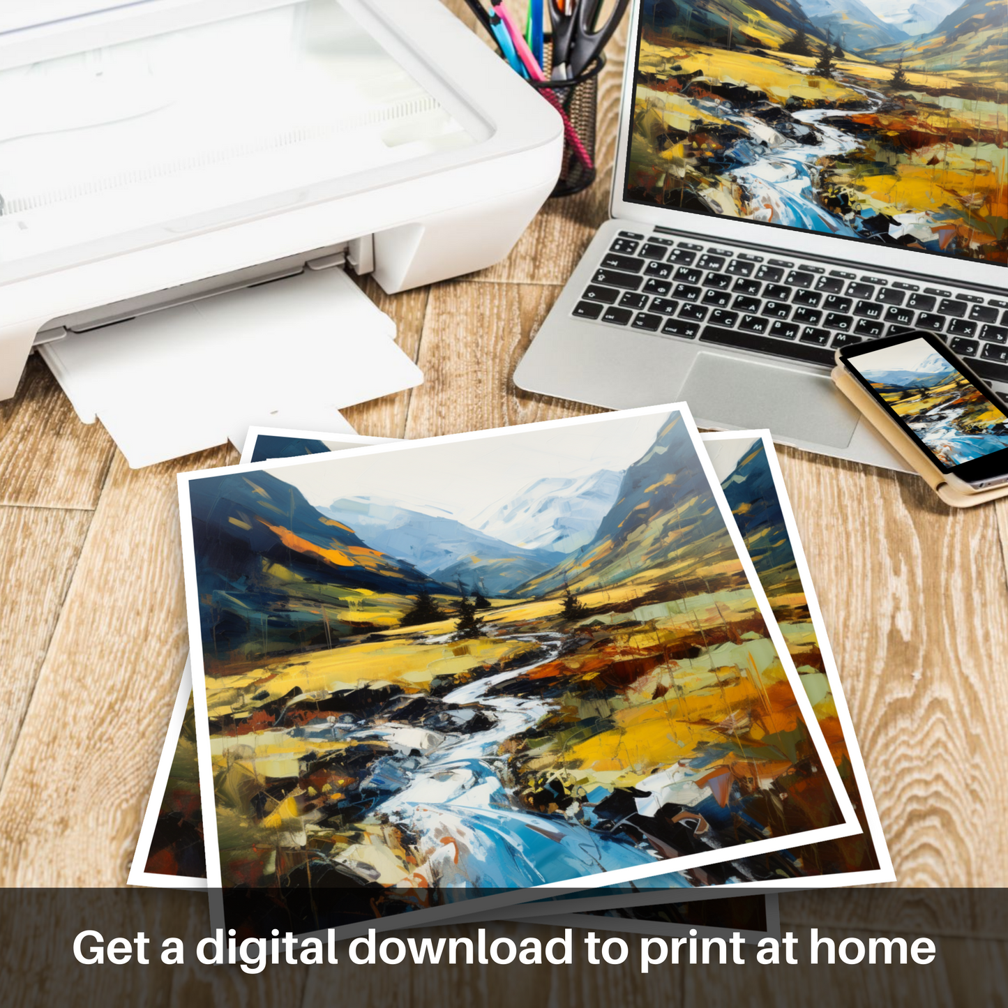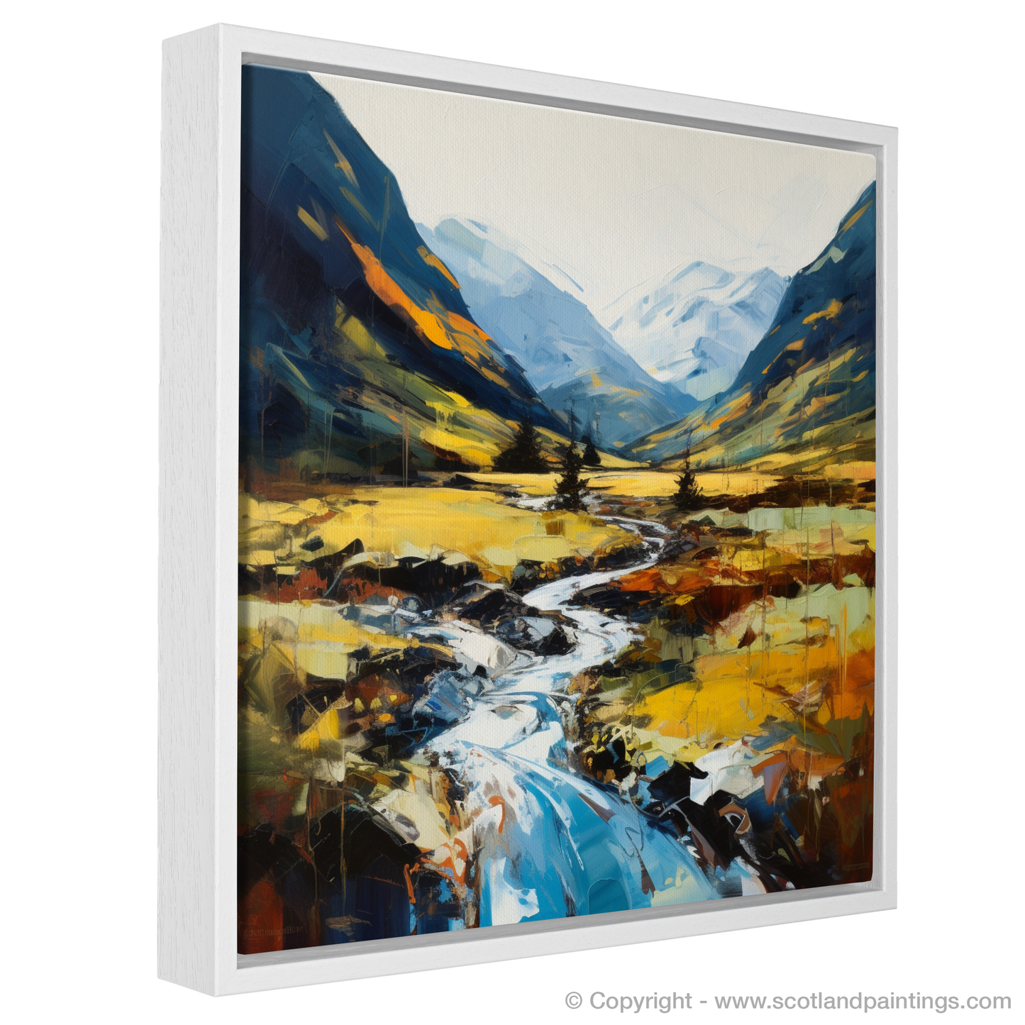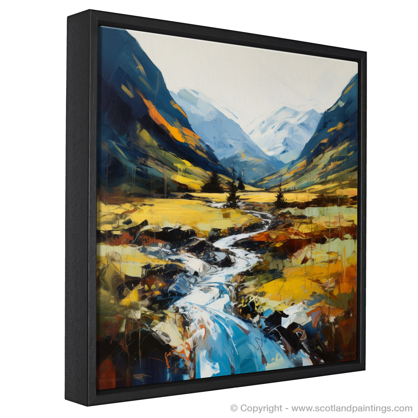 Capturing the raw, untamed beauty of the Scottish Highlands, this expressionist print transports viewers into the heart of Glen Nevis. Vivid, dynamic strokes of paint vividly depict the sweeping landscape, where the rugged tranquillity of nature is manifest in every brushstroke.