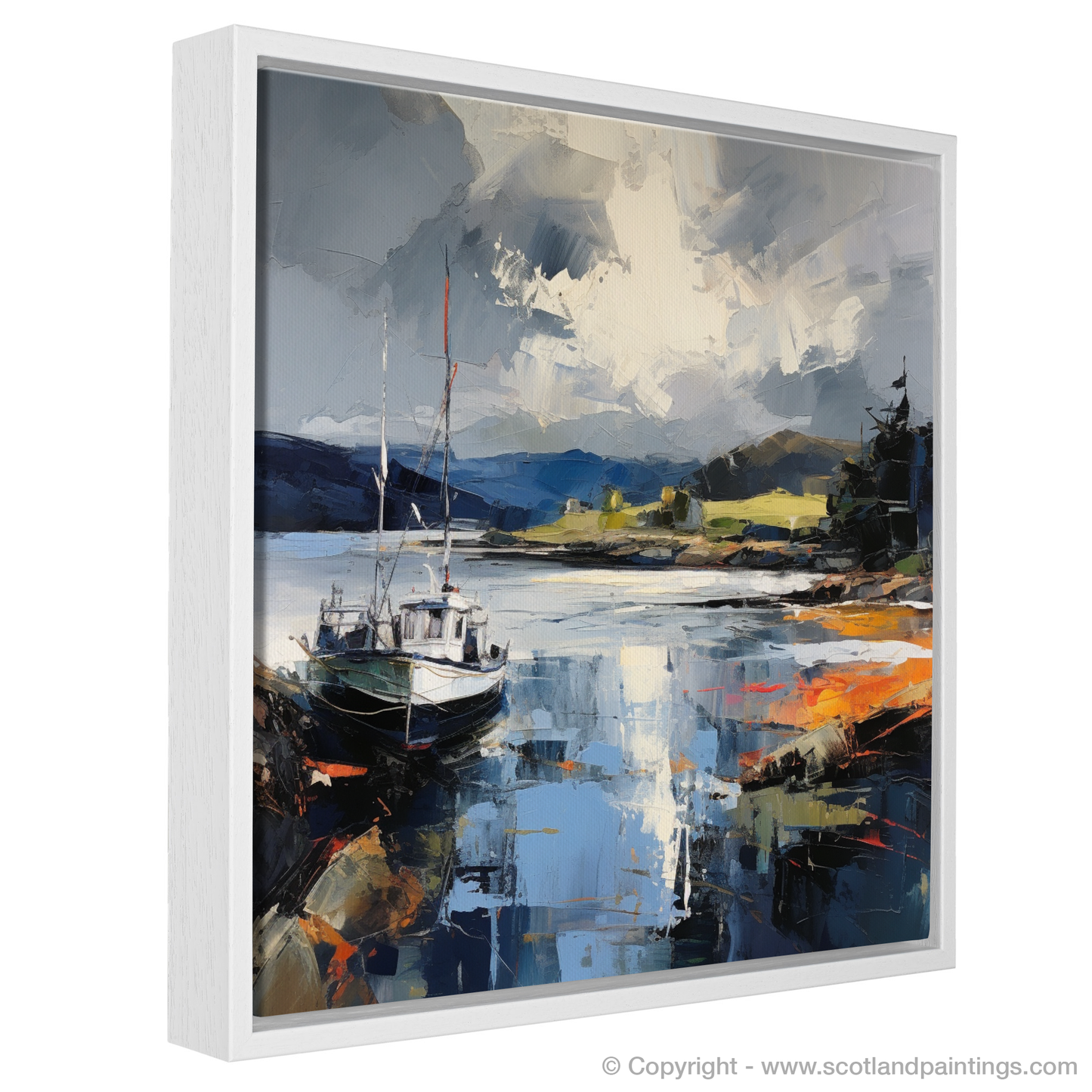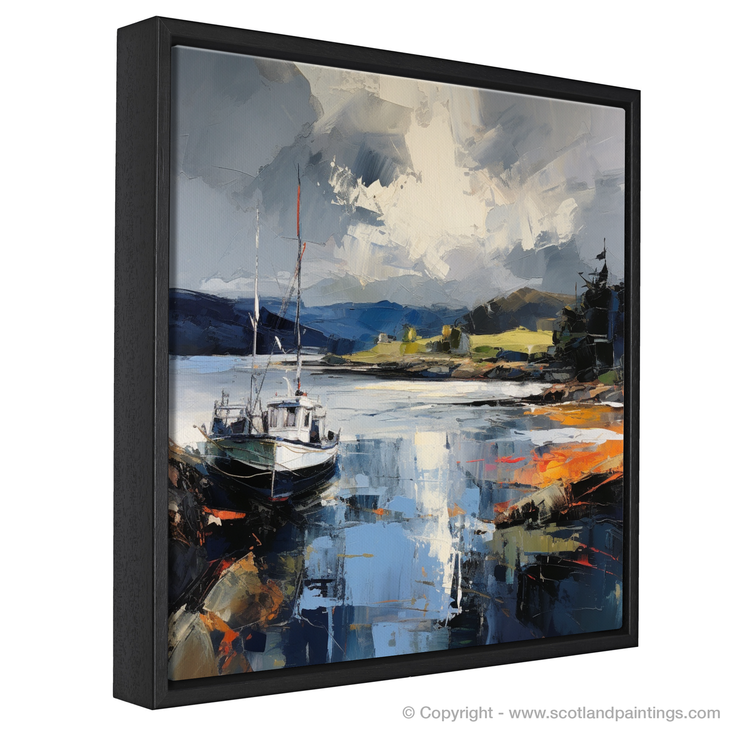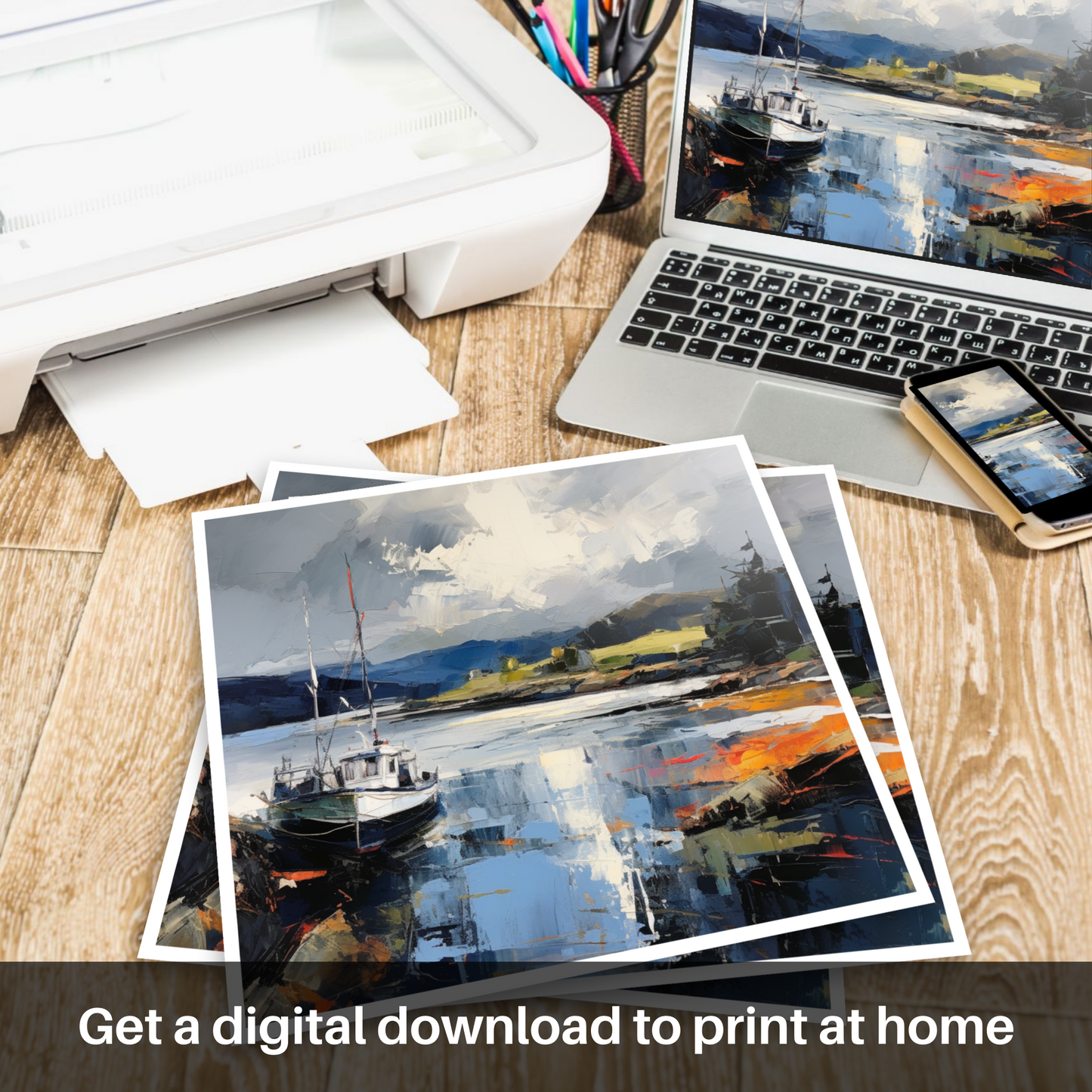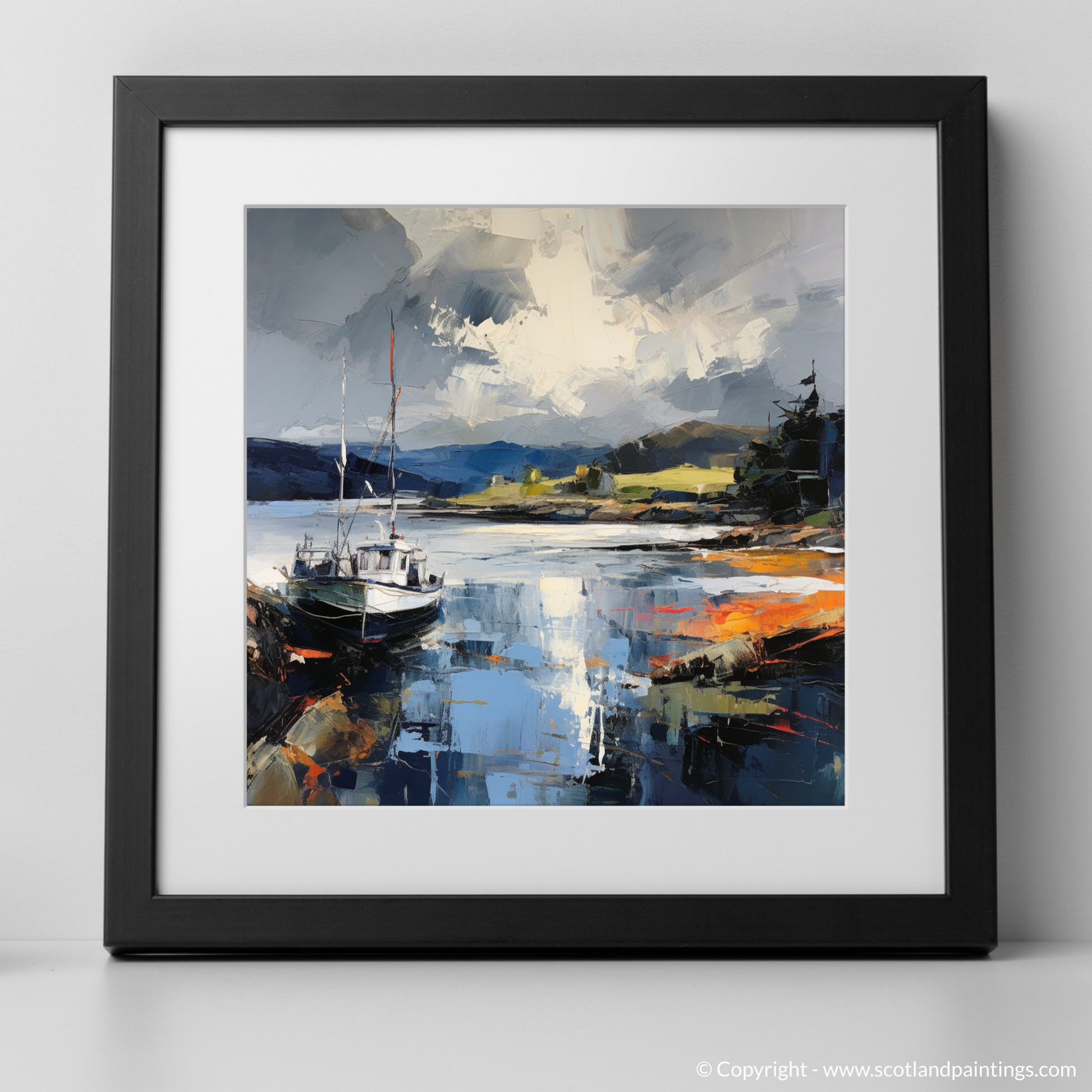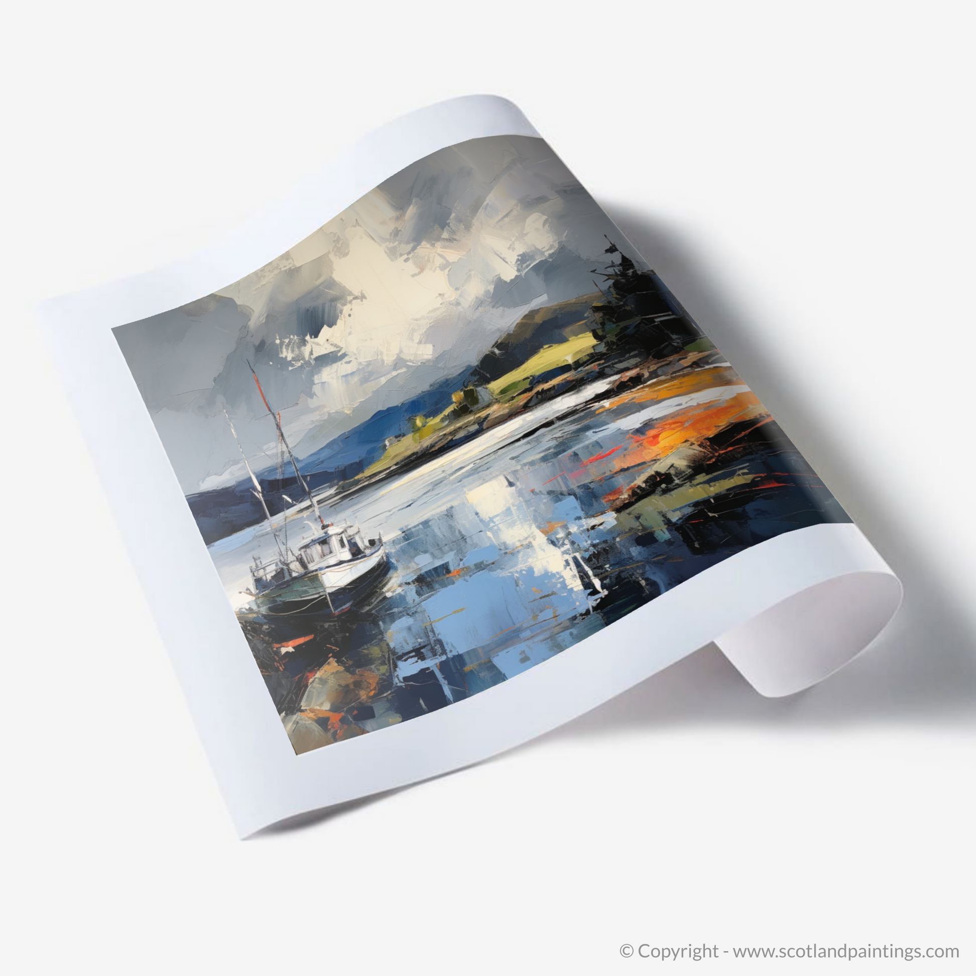 Capturing the raw emotion of nature's drama, this evocative print presents an emotive interpretation of Tayvallich Harbour under a tempestuous sky. The artwork, deeply rooted in the Expressionist tradition, communicates the intense energy and movement of an oncoming storm rolling over the serene landscape.