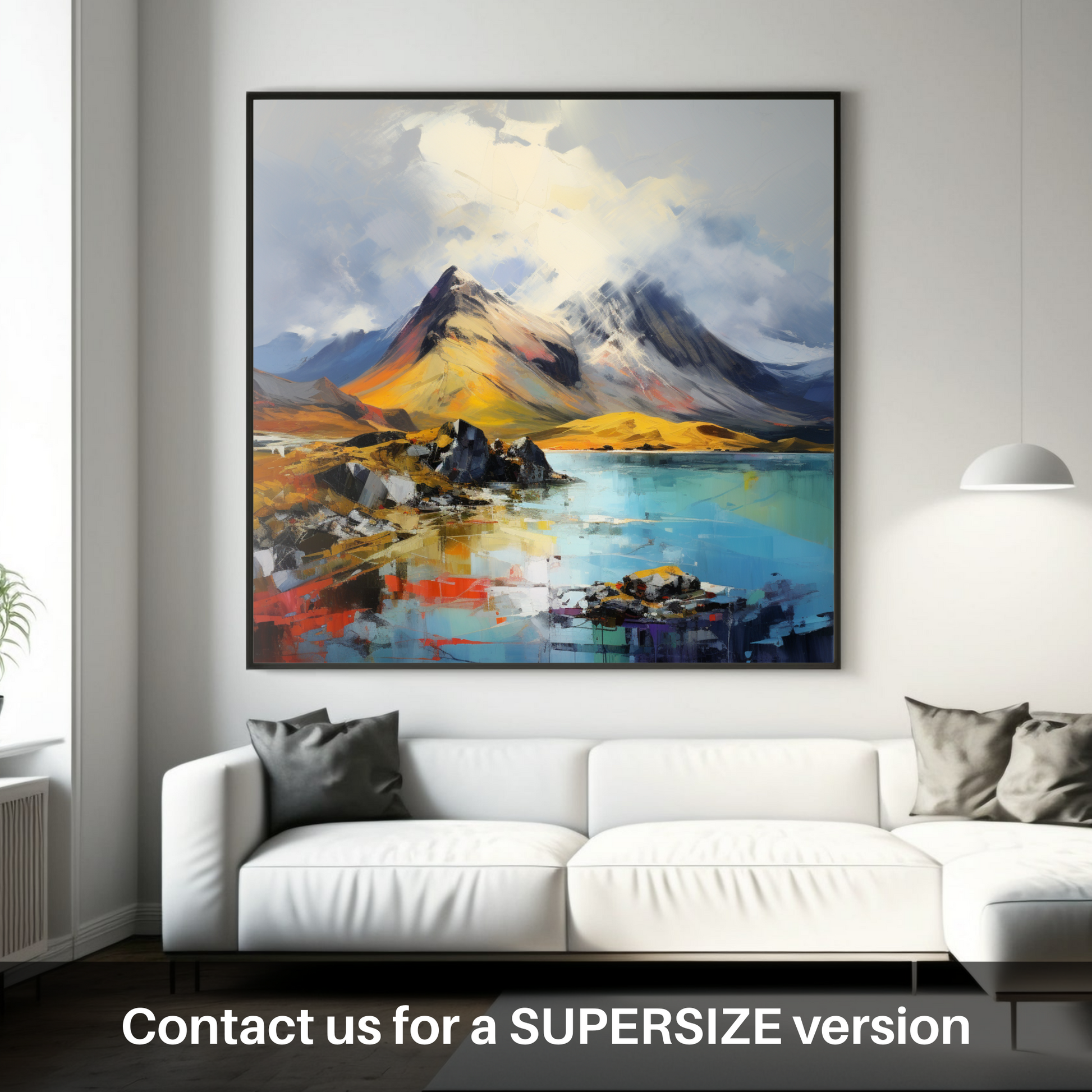 This artwork masterfully interprets the striking contrast between the steadfast mountains and the ephemeral quality of light unique to the Scottish terrain. Through powerful use of colour and form, the print offers an emotional journey through one of Scotland’s most iconic ranges, promising to stir the soul and inspire the imagination of any viewer.