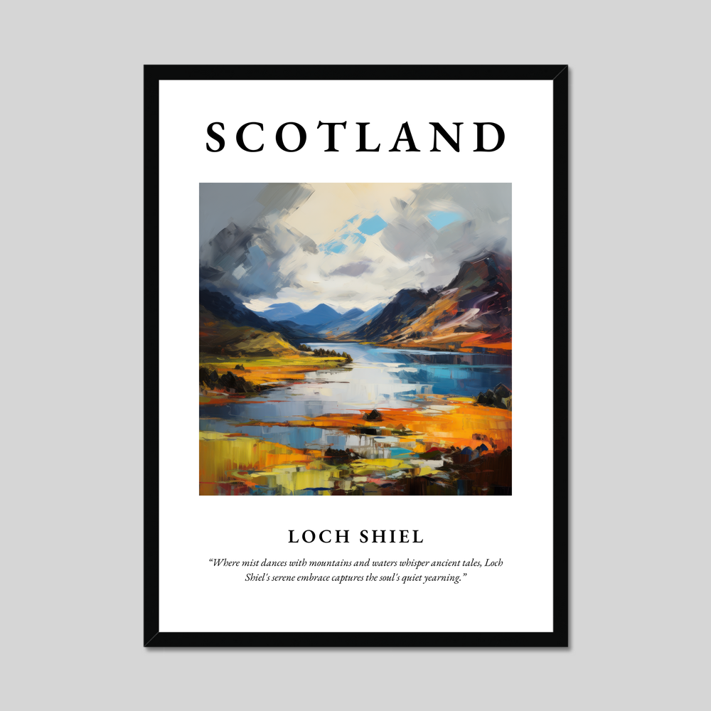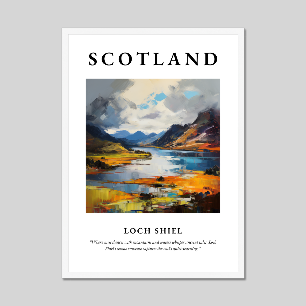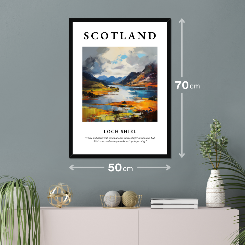 Immerse yourself in the captivating landscape of Scotland with our stunning Expressionism-style framed poster print of Loch Shiel. Measuring an impressive 50cm x 70cm, this large artwork transforms any space with its alluring portrayal of Scotland's enchanting beauty, ideal for art enthusiasts or those with a fond connection to this magical place.