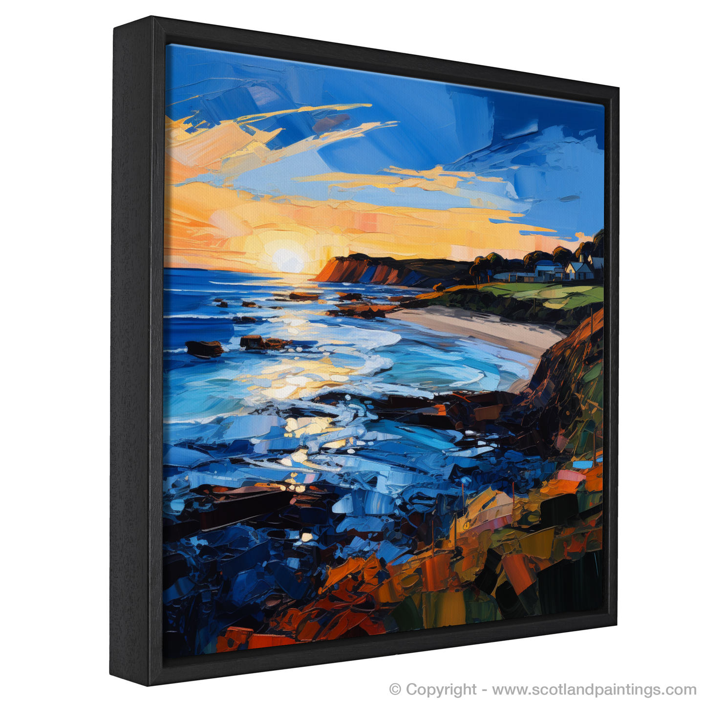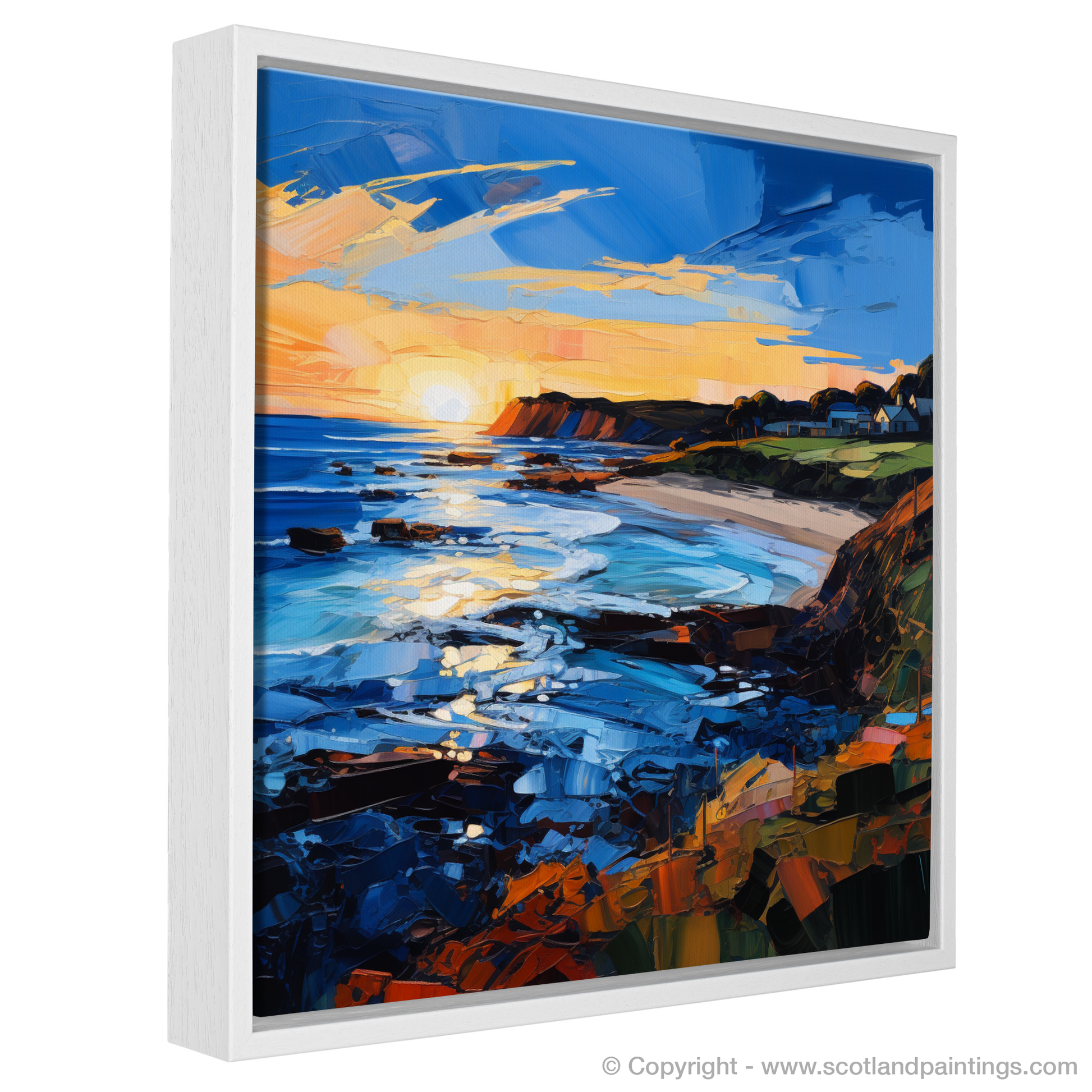 Envelop your senses in the raw, sublime beauty of Scotland's shoreline with this evocative print inspired by Coldingham Bay. The golden hour casts its ephemeral glow, transforming the sky into a palette of vibrant oranges, rich yellows, and serene blues, which beautifully juxtapose the deep shadows of evening. This Expressionism-influenced piece captures the dynamic essence of the coastal landscape with broad, confident brushstrokes that convey both motion and emotion.