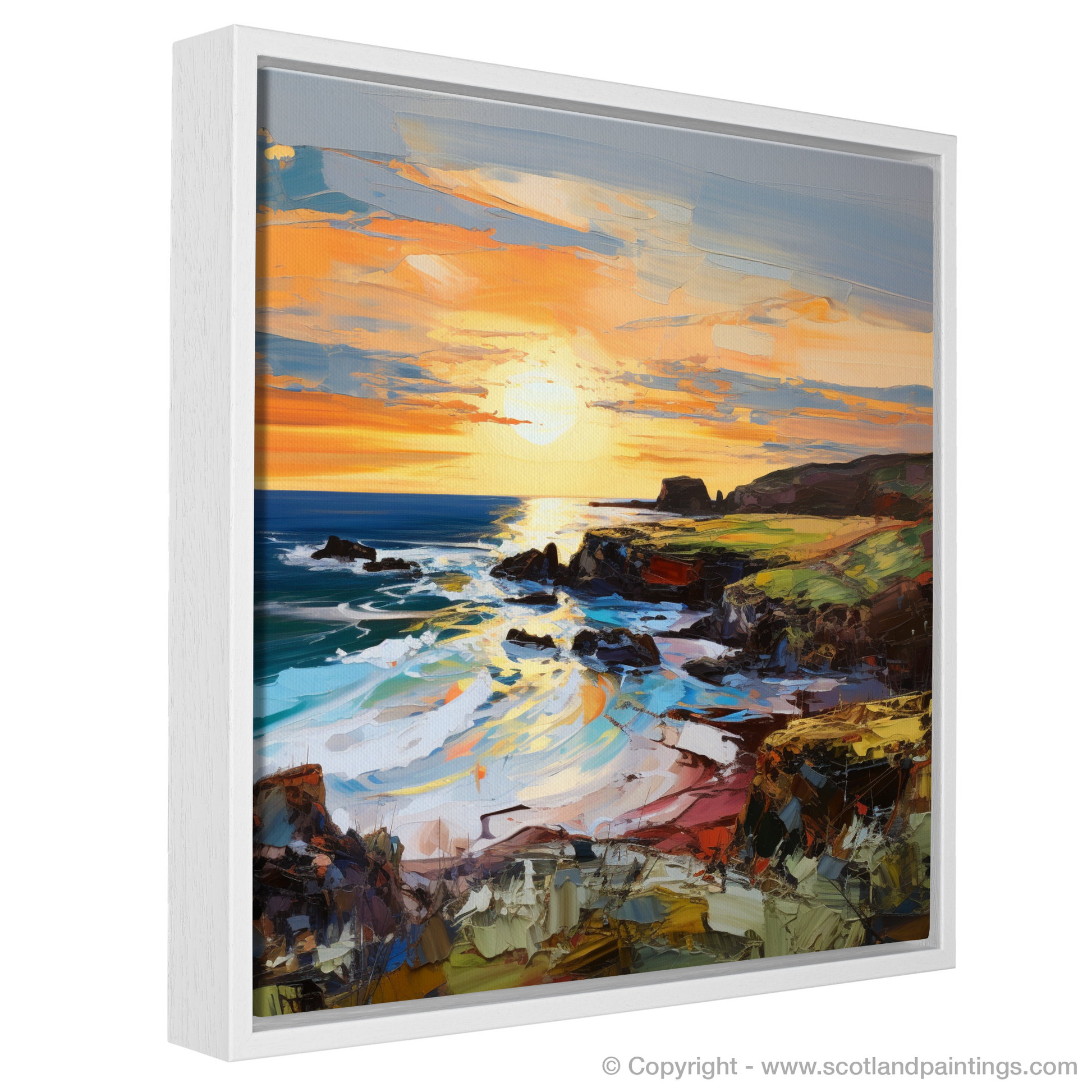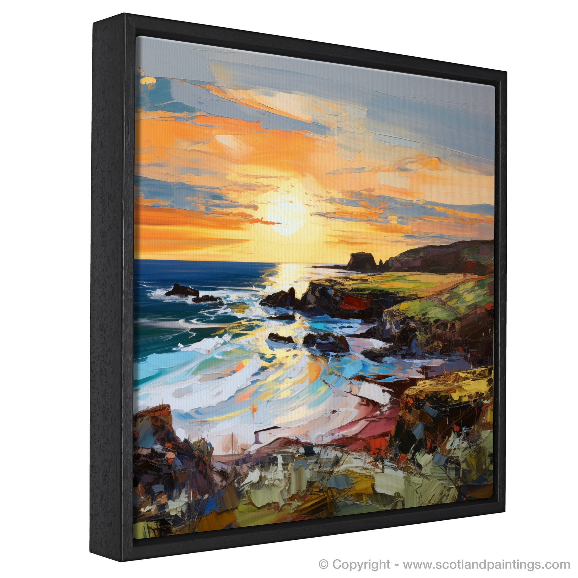 In the distance, the silhouette of the coastline etched against the setting sun provides a tranquil backdrop, a reminder of the enduring presence of nature's grandeur amidst the fleeting moments of dusk. The painting's evocative style transcends mere representation, inviting contemplation and a deep connection to the raw and rugged landscapes that characterise Scotland's shores.