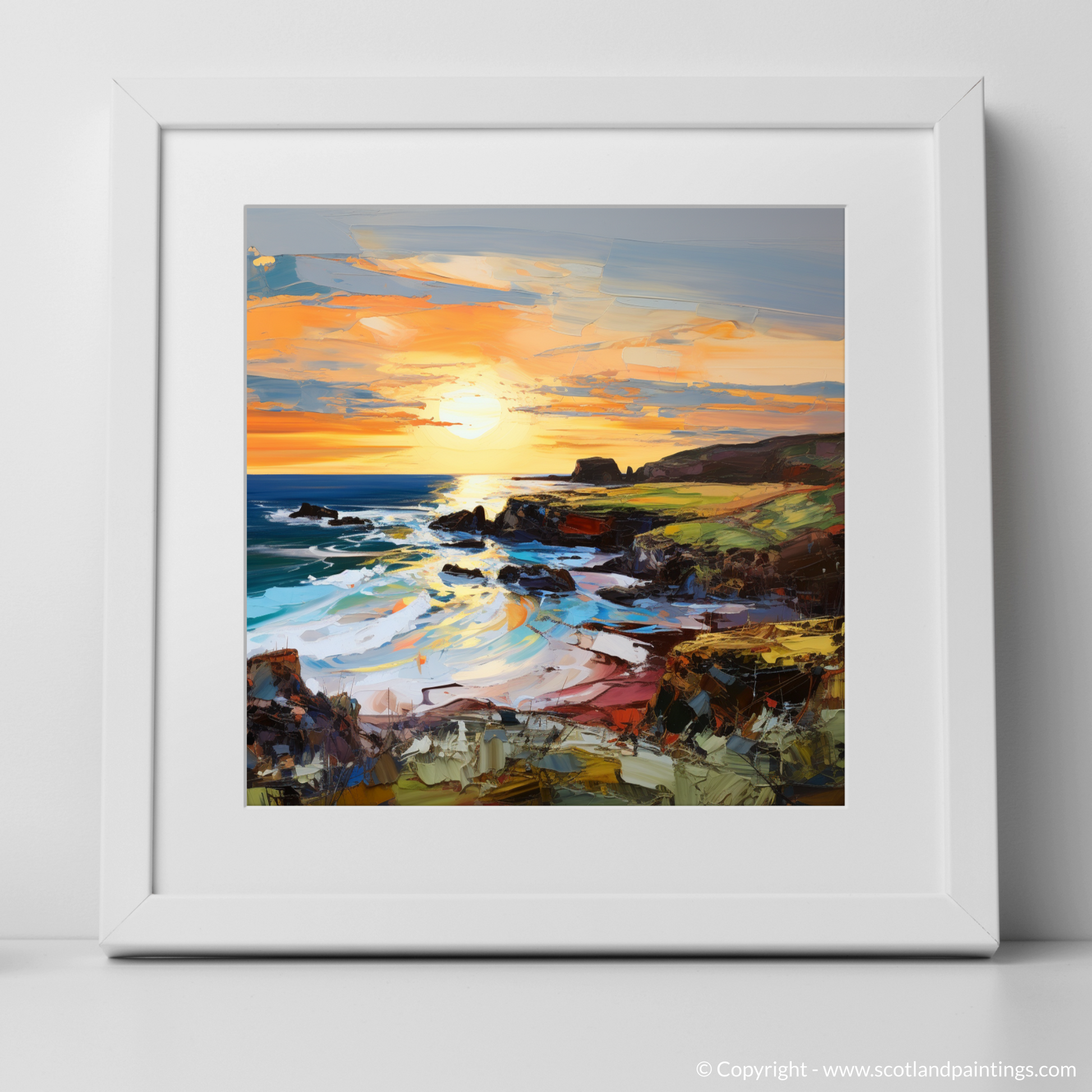 Captured at the enchanting hour when the sun graces the horizon with its descent, this expressionist interpretation of Coldingham Bay elevates the viewer to a realm of colour and emotion. The print exhibits a vibrant tapestry of the bay, where the sky, sea, and land converge in a symphony of golden hues. Swirling clouds are painted with an array of oranges, yellows and soft blues, hinting at the lingering warmth of the day mingled with the promise of a serene night ahead.