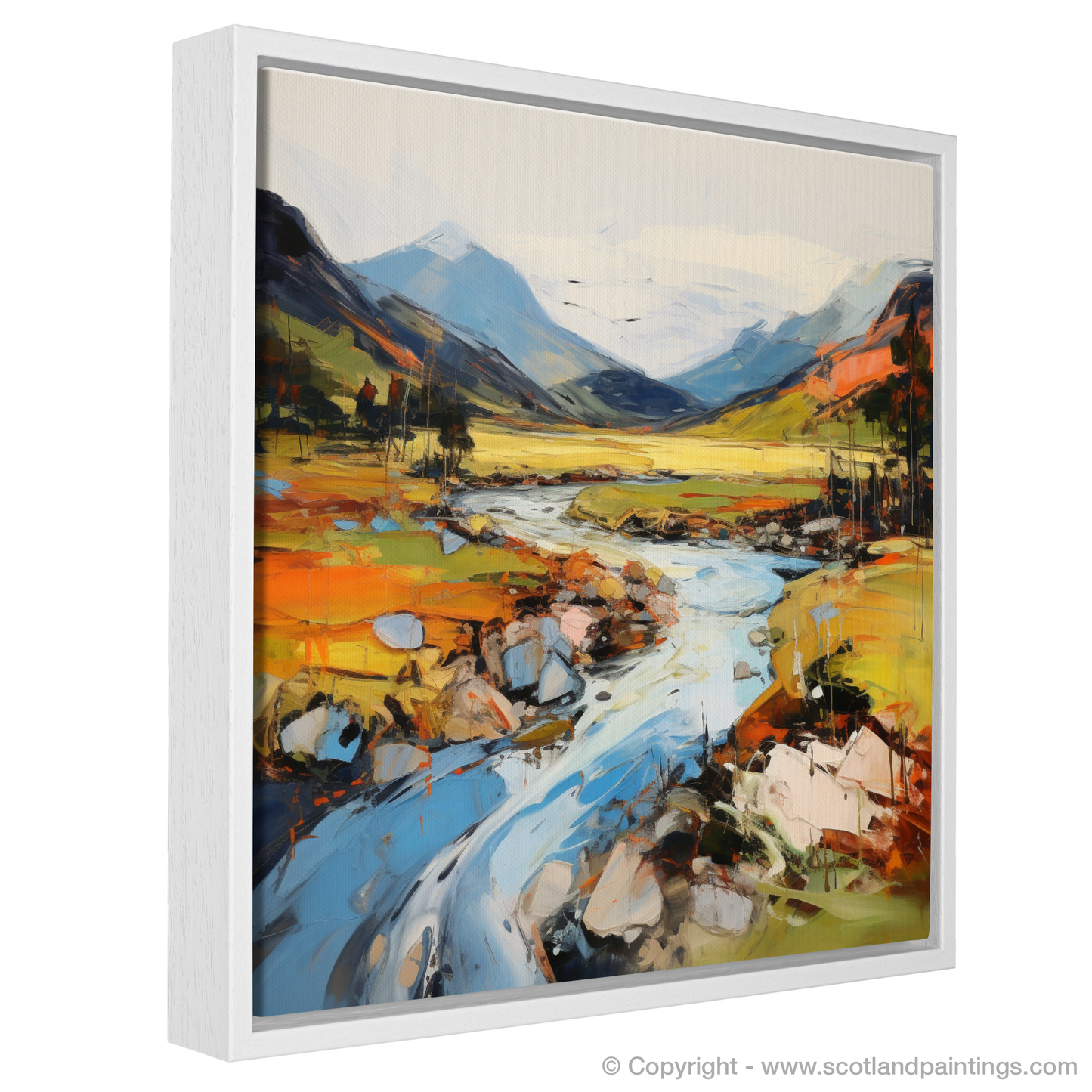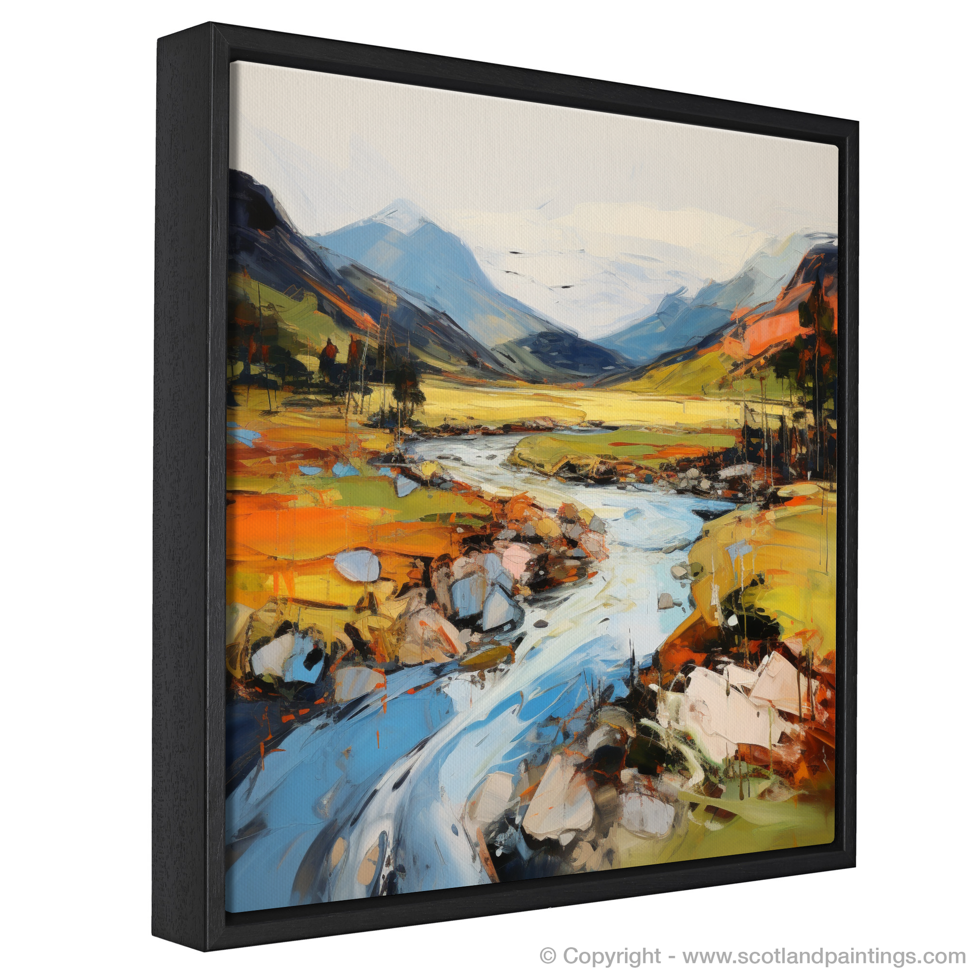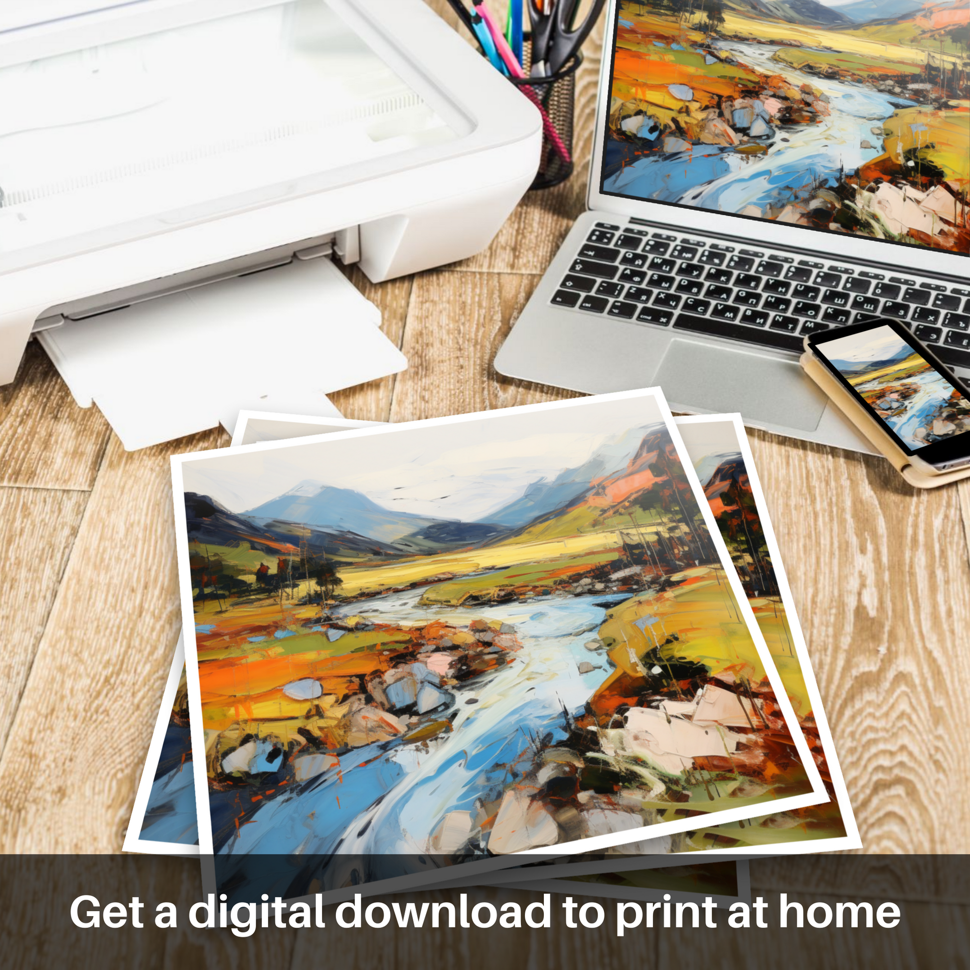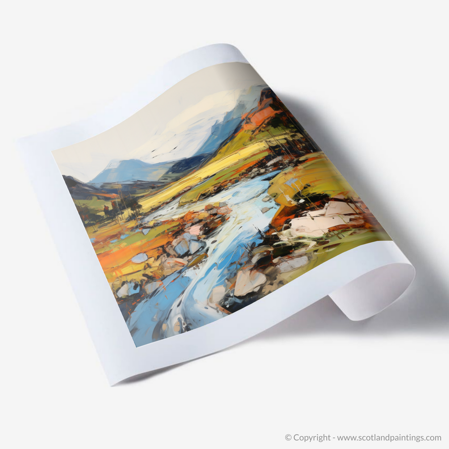 The image is alive with the suggestion of movement, where the sky seems to swirl with brisk strokes of white and blue, hinting at the fleeting nature of clouds racing overhead. The rugged terrain is abstracted into a tapestry of colour and form, with each stroke of the palette knife and brush contributing to a dynamic depiction of nature's splendour and complexity. This print is a celebration of the Scottish landscape, offering an immersive and sensory escape into the heart of Glen Esk, a jewel nestled within the country's rich and varied topography. It will undoubtedly serve as a statement piece, evoking contemplation and conversation, and bringing a piece of Scotland's wild elegance into any space.