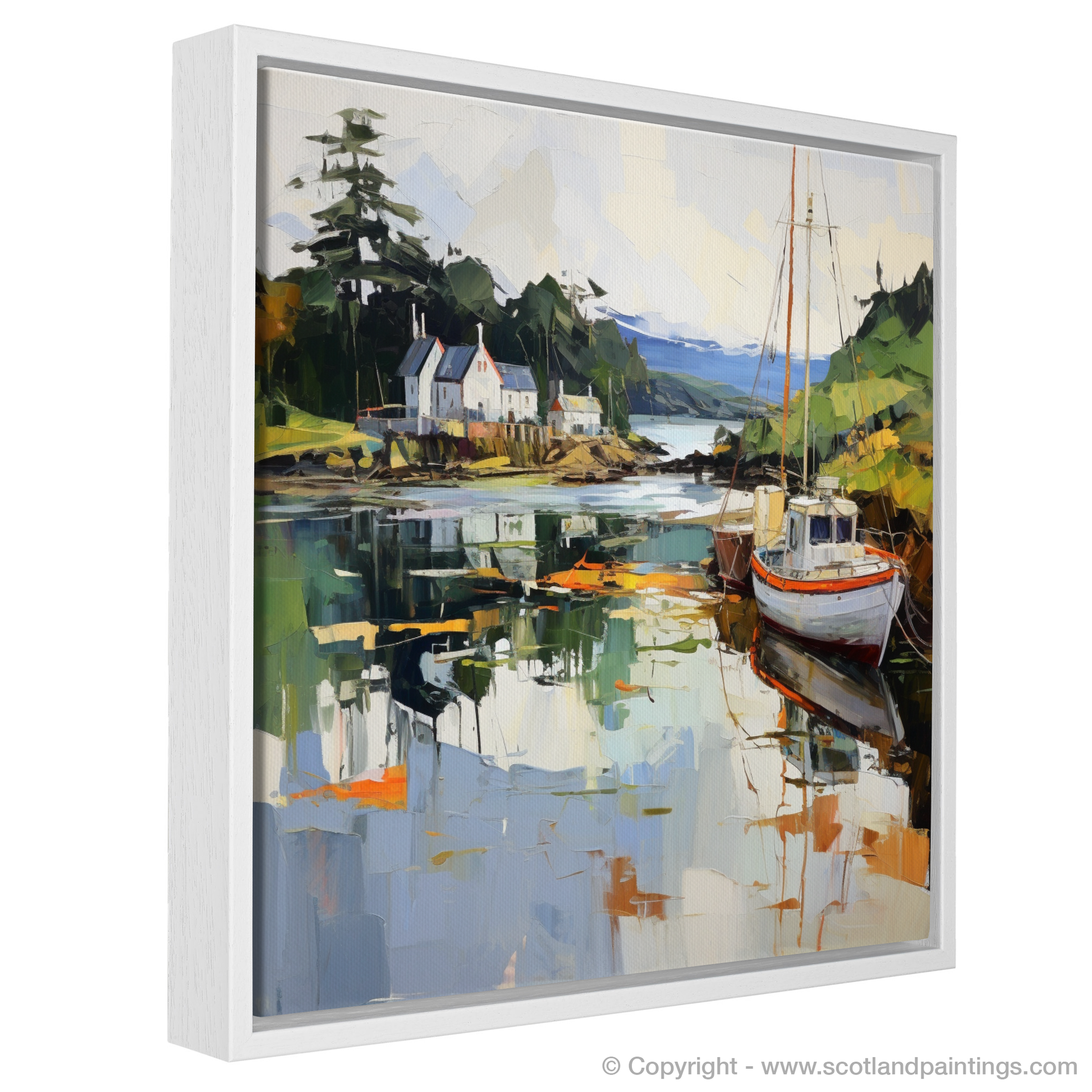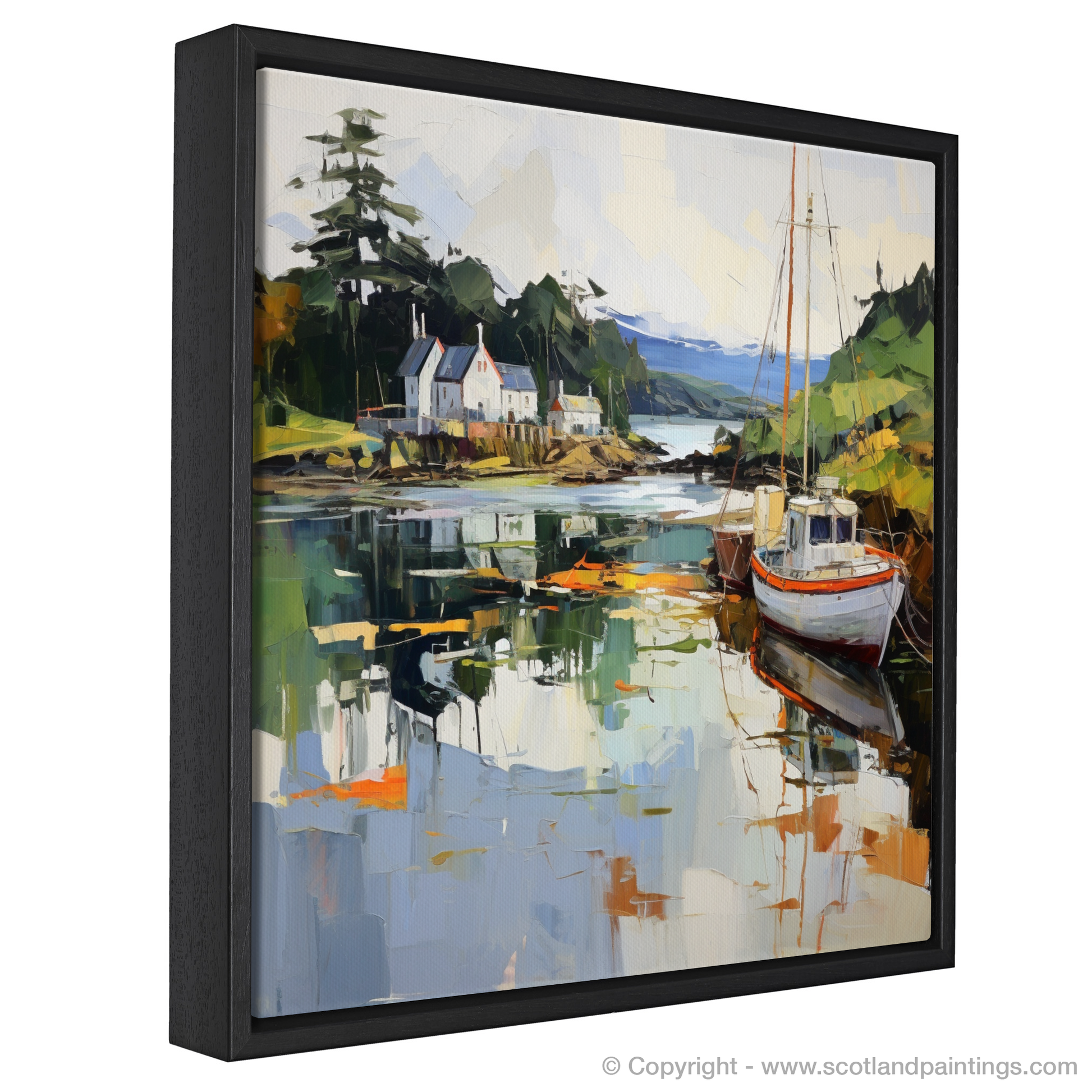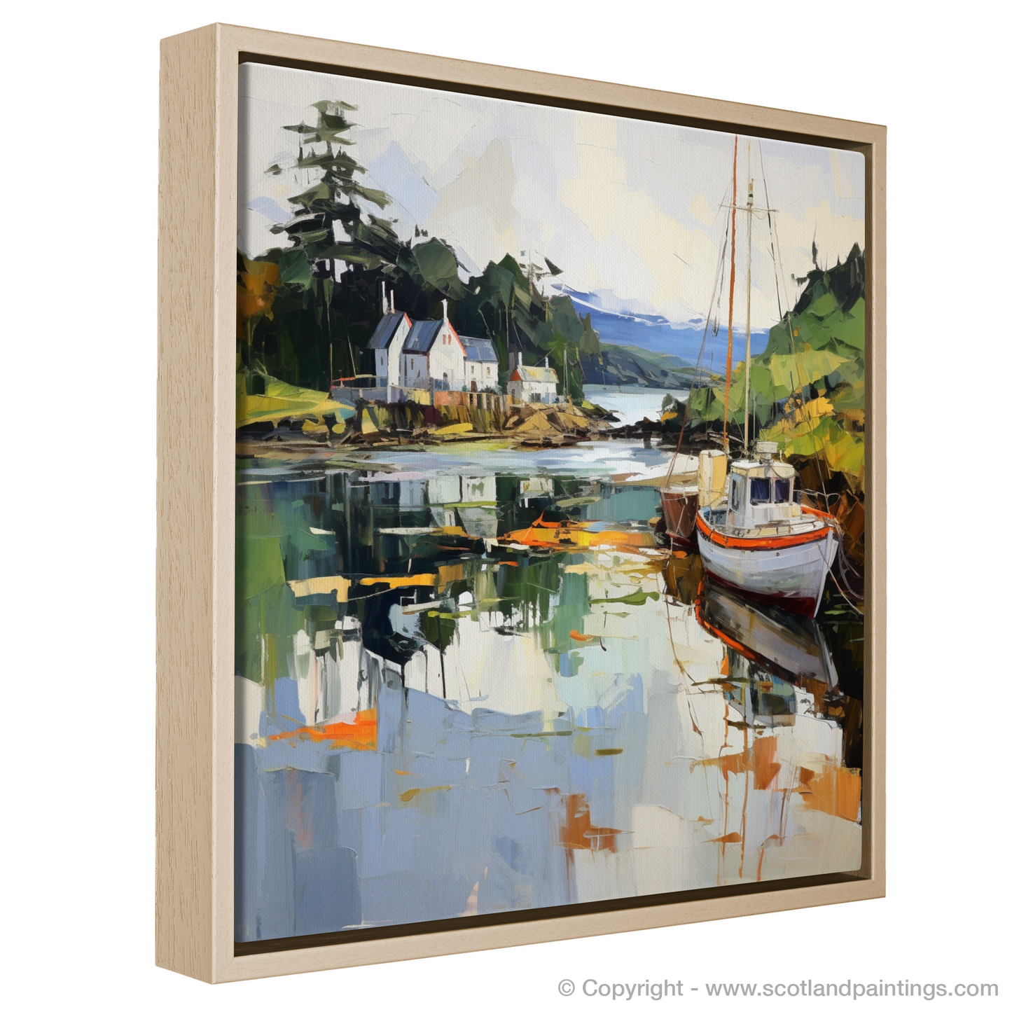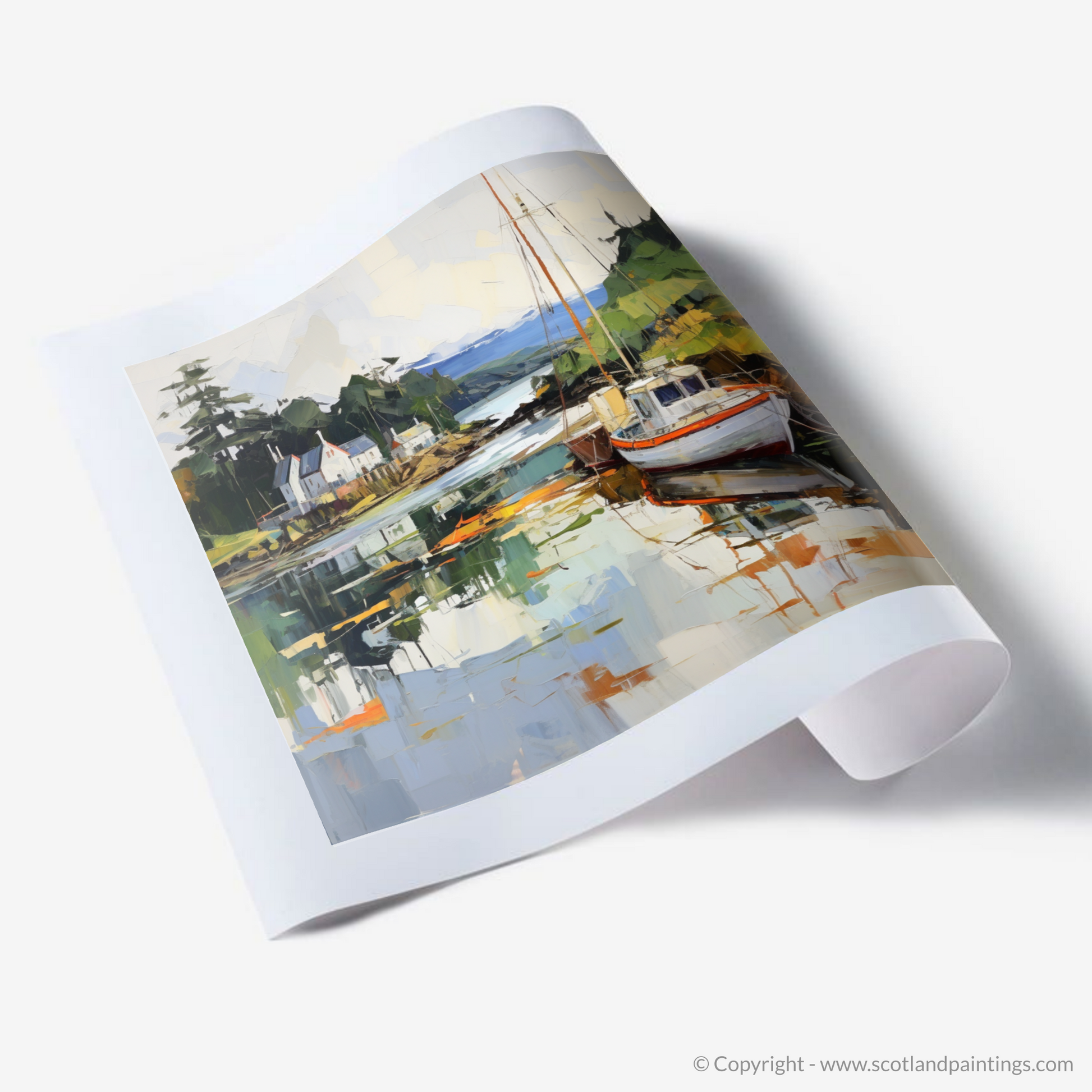 Captured within this evocative print is the quintessential charm of Tayvallich Harbour, nestled in the serene setting of Argyll. Cast your gaze upon the vibrant expressionistic strokes that bring this Scottish harbour to life, where the tranquillity of coastal living is vividly portrayed through rich, impasto textures and a harmonious palette.
