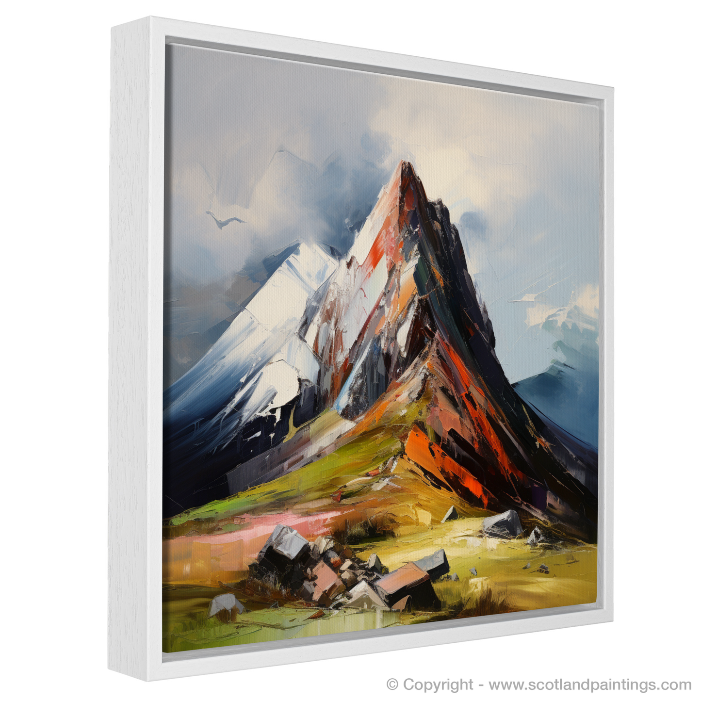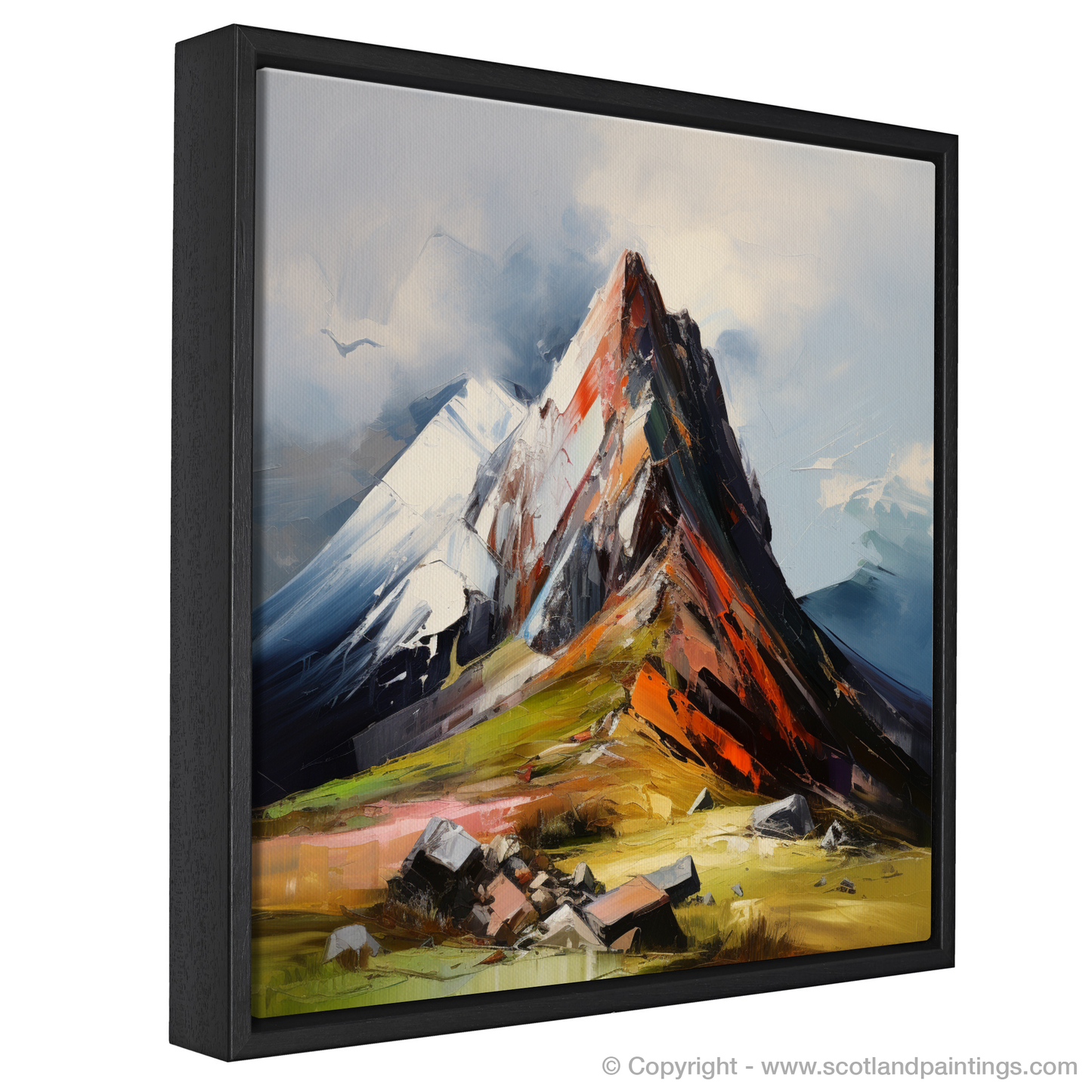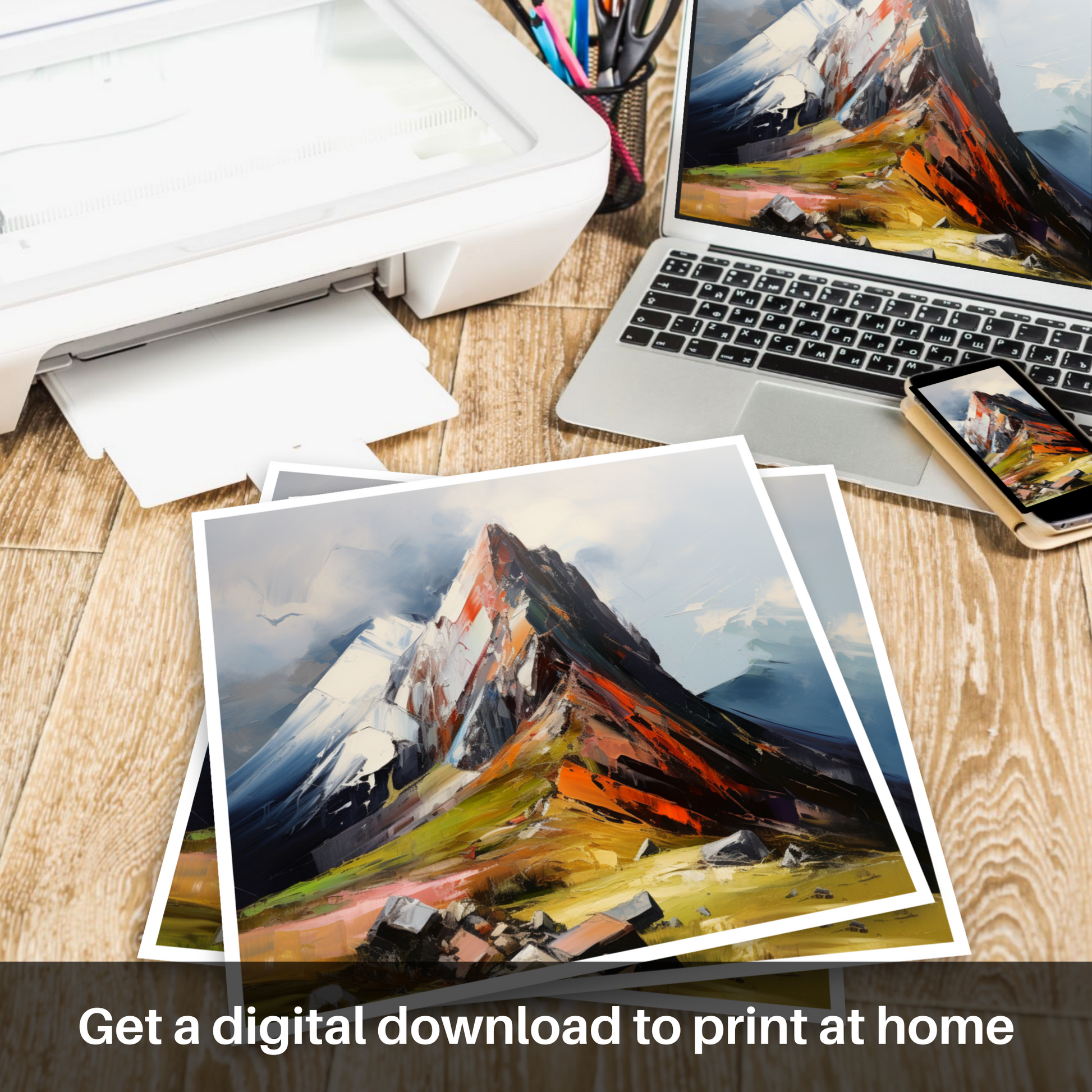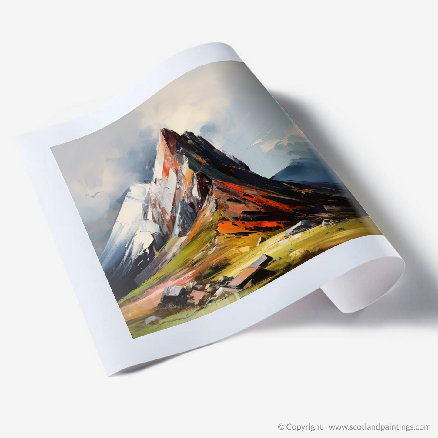 Captivating and emotive, this expressive print captures the raw essence of Cairn Gorm in the Scottish Highlands with a vivid interplay of colour and texture. The striking mountain peak rises majestically, rendered with bold strokes and a rich palette that reflects the dramatic lighting and shadow of the natural landscape.