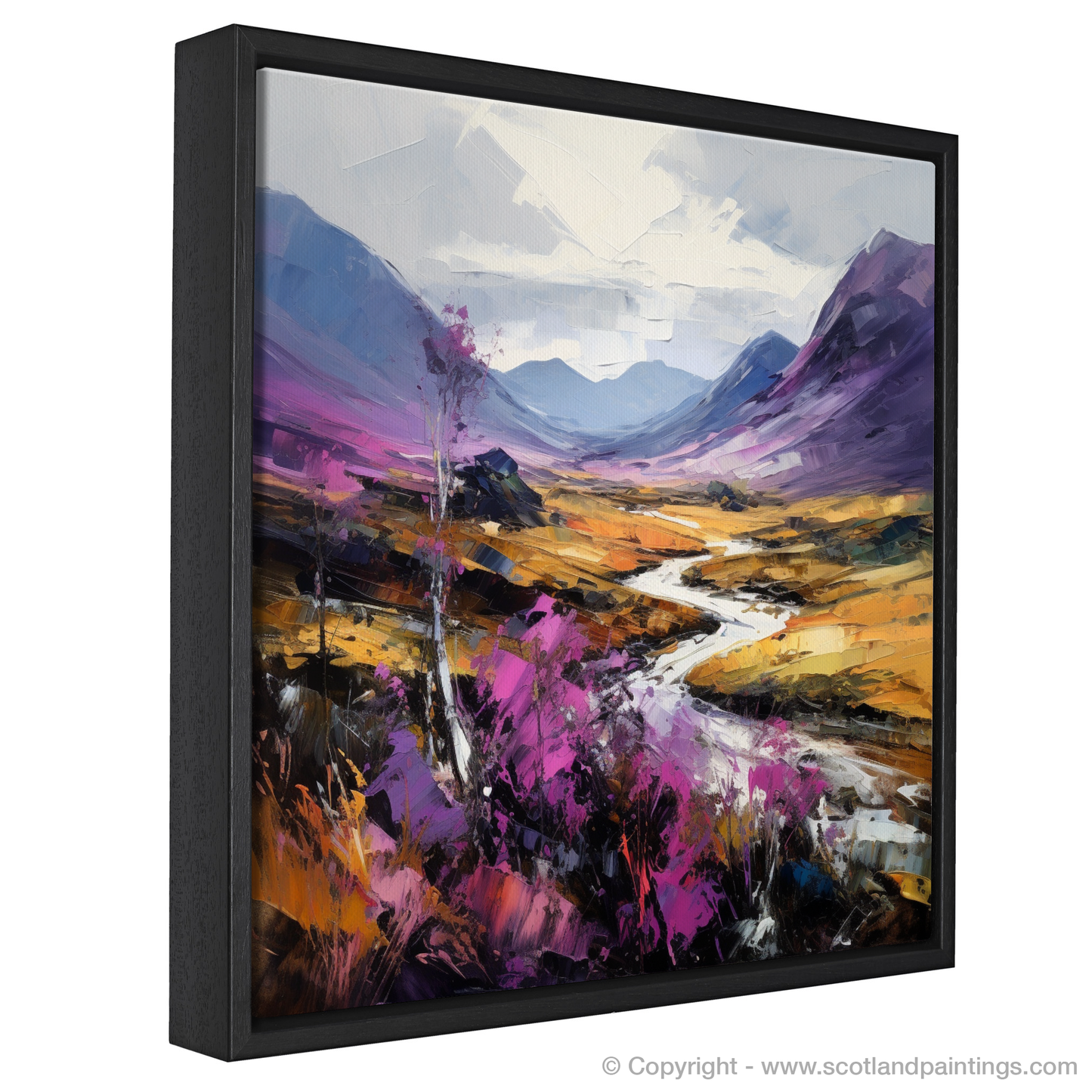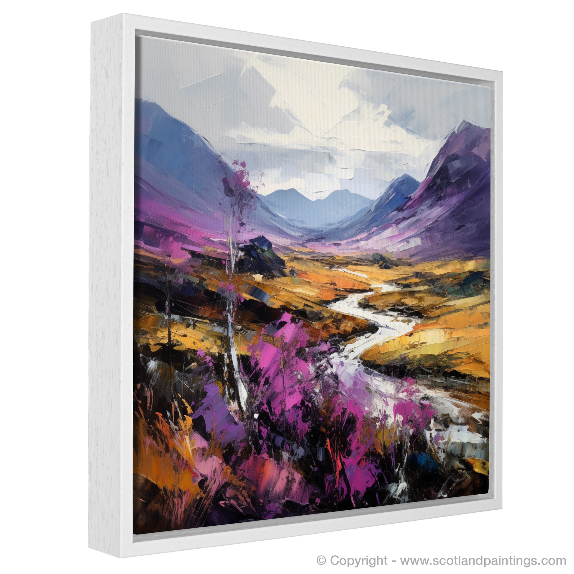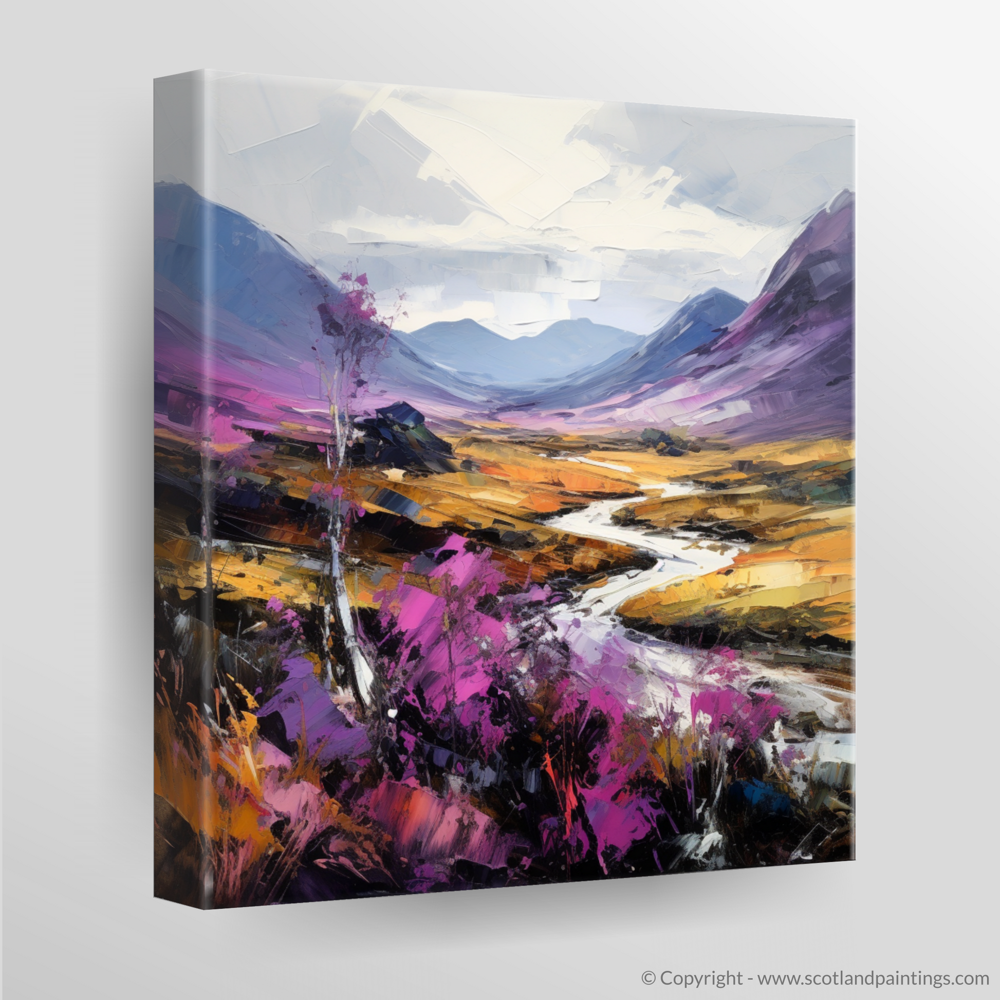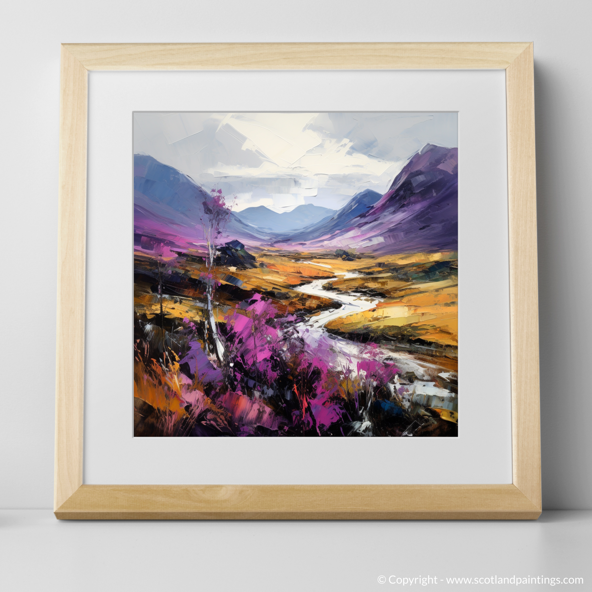 This captivating print brings to life the raw beauty of Glencoe through the vivid and emotive strokes characteristic of Expressionism. Upon a closer look, the viewer is transported to a landscape pulsating with the rich purples and heather tones that define the Scottish wilds. The foreground is ablaze with the passionate hues of purple, capturing the wild heather in its natural abundance. Bold, impasto strokes render the flora with a sense of movement and vitality, while smudges and dabs of white and pale blues convey the dynamic Scottish sky overhead.