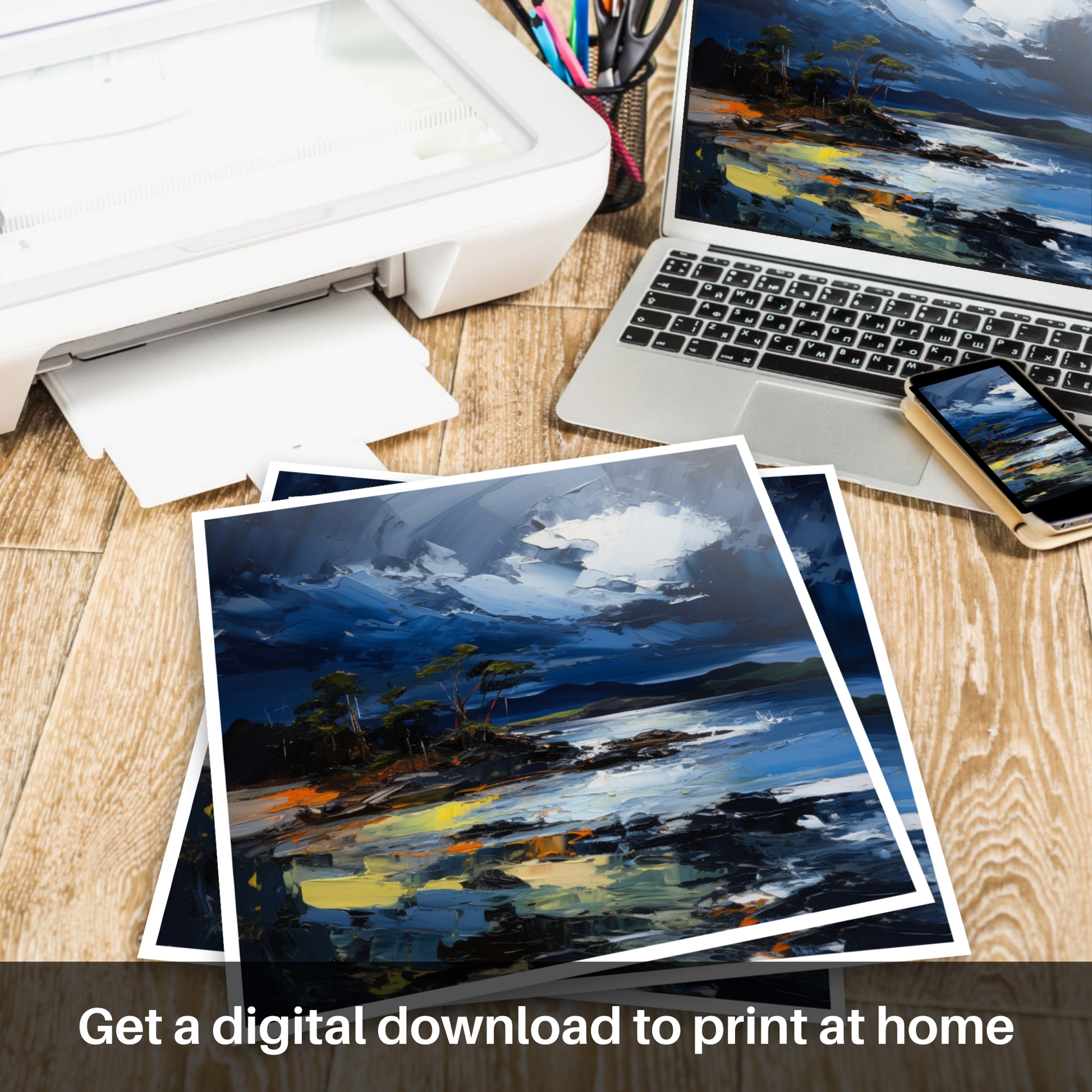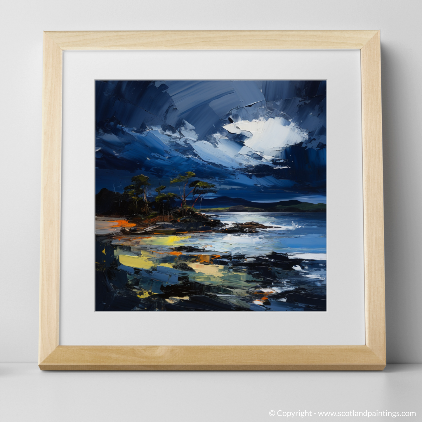 Captured in this evocative print is the untamed spirit of Ardalanish Bay, depicted with the passionate strokes and vibrant contrasts indicative of Expressionism. The piece conveys the tumultuous atmosphere of a stormy sky, where swathes of dark, brooding blues clash with fleeting patches of tranquil white, creating a canvas alive with dynamic movement. Below this chaos in the heavens, the cove itself is a mosaic of rich, dark hues, interspersed with bold reflections of orange and yellow cast by an unseen source, hinting at the fleeting warmth of a sunset against the cool tones of the surrounding landscape.