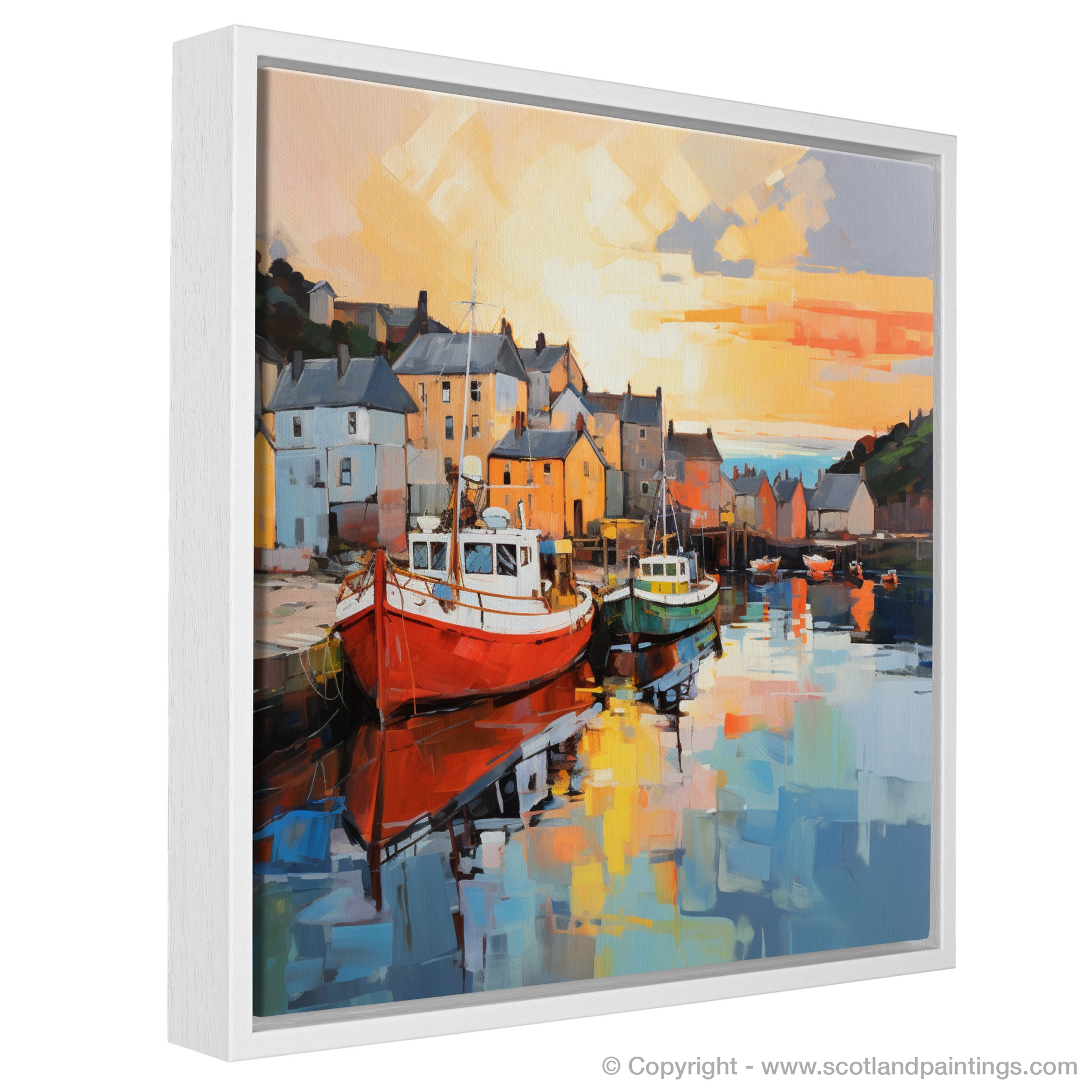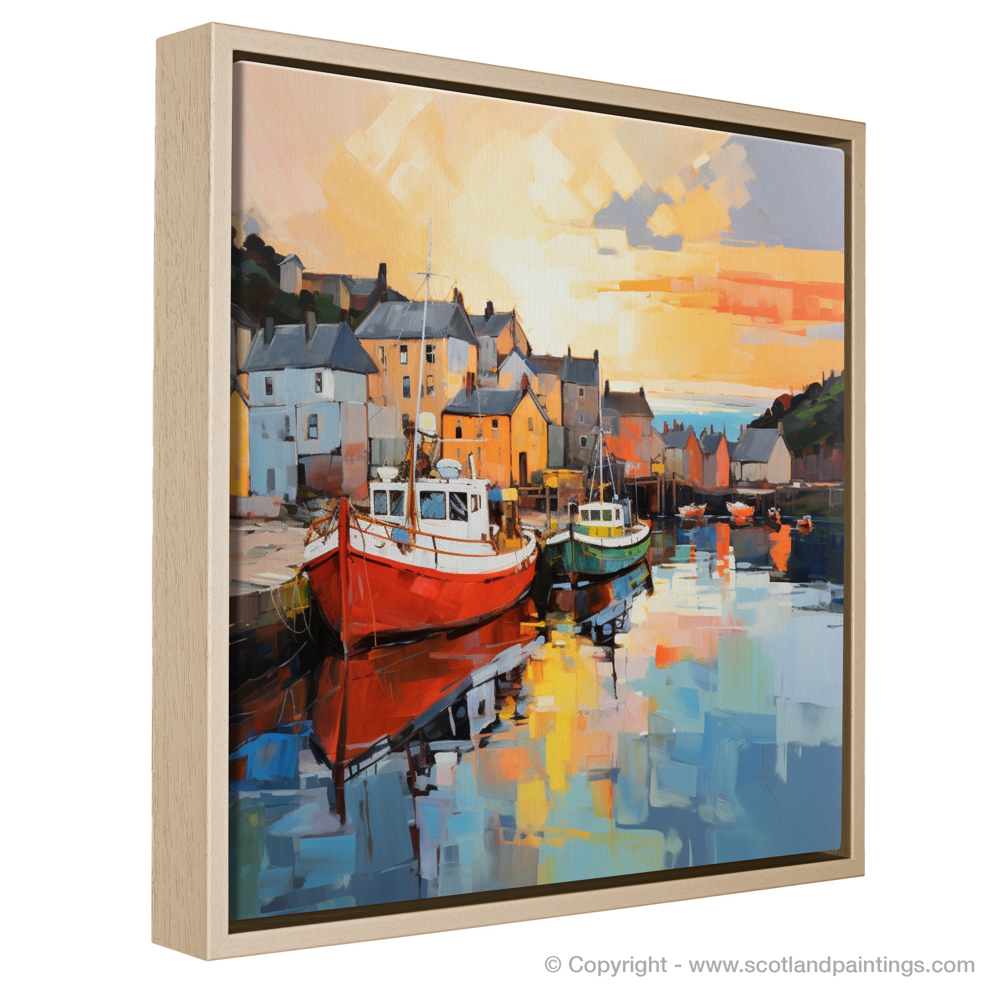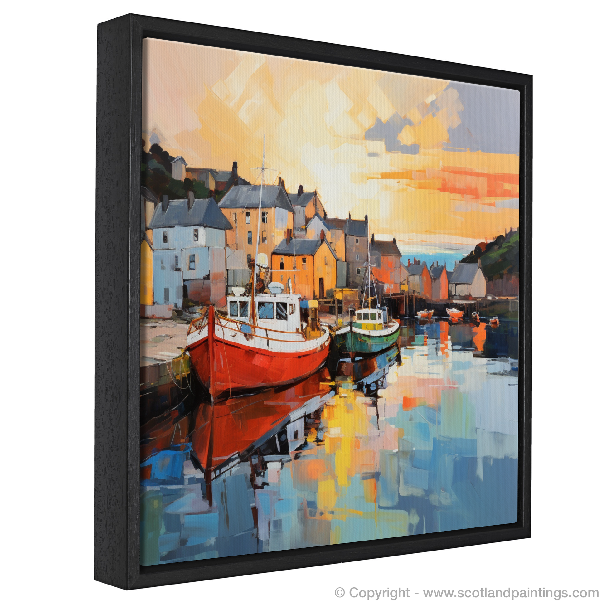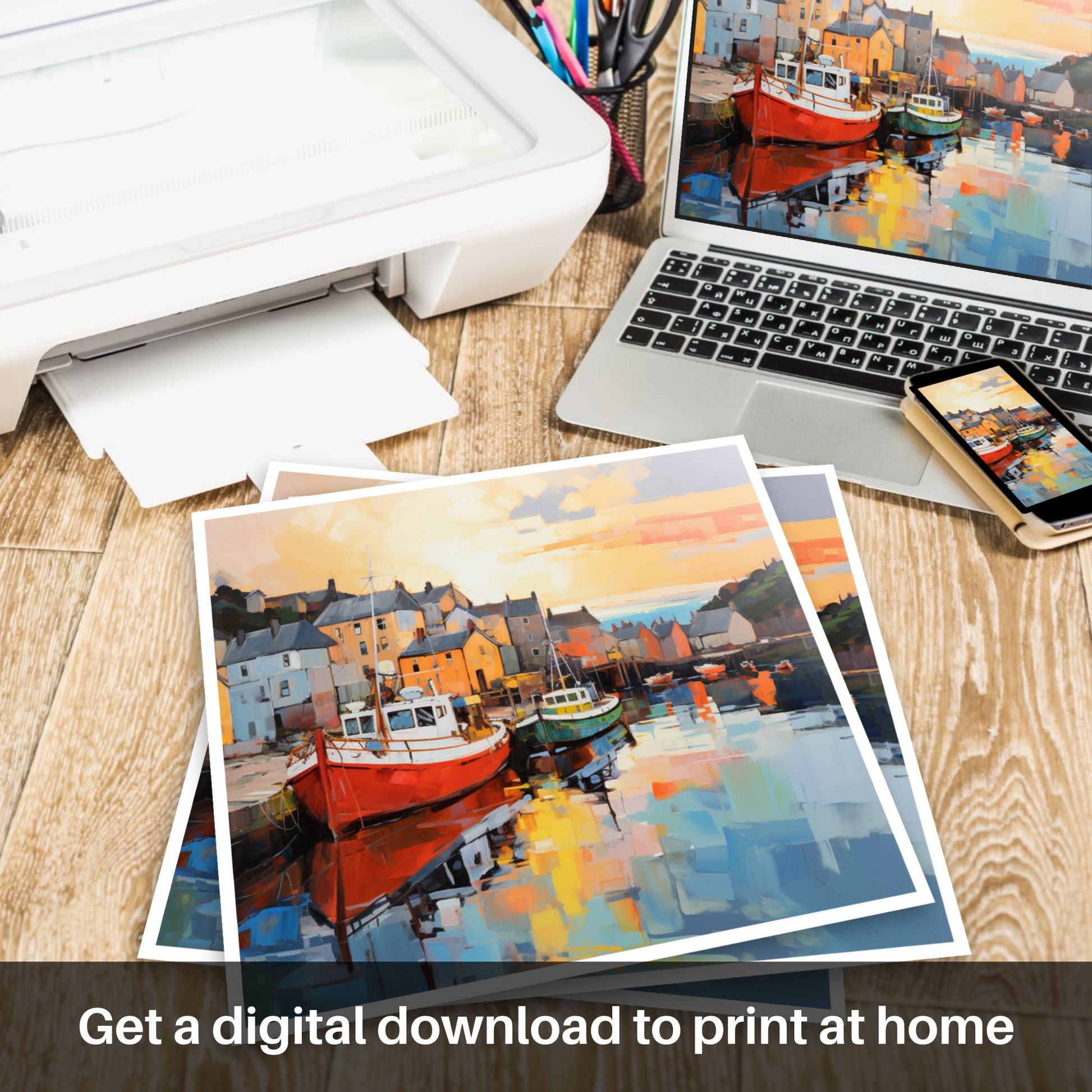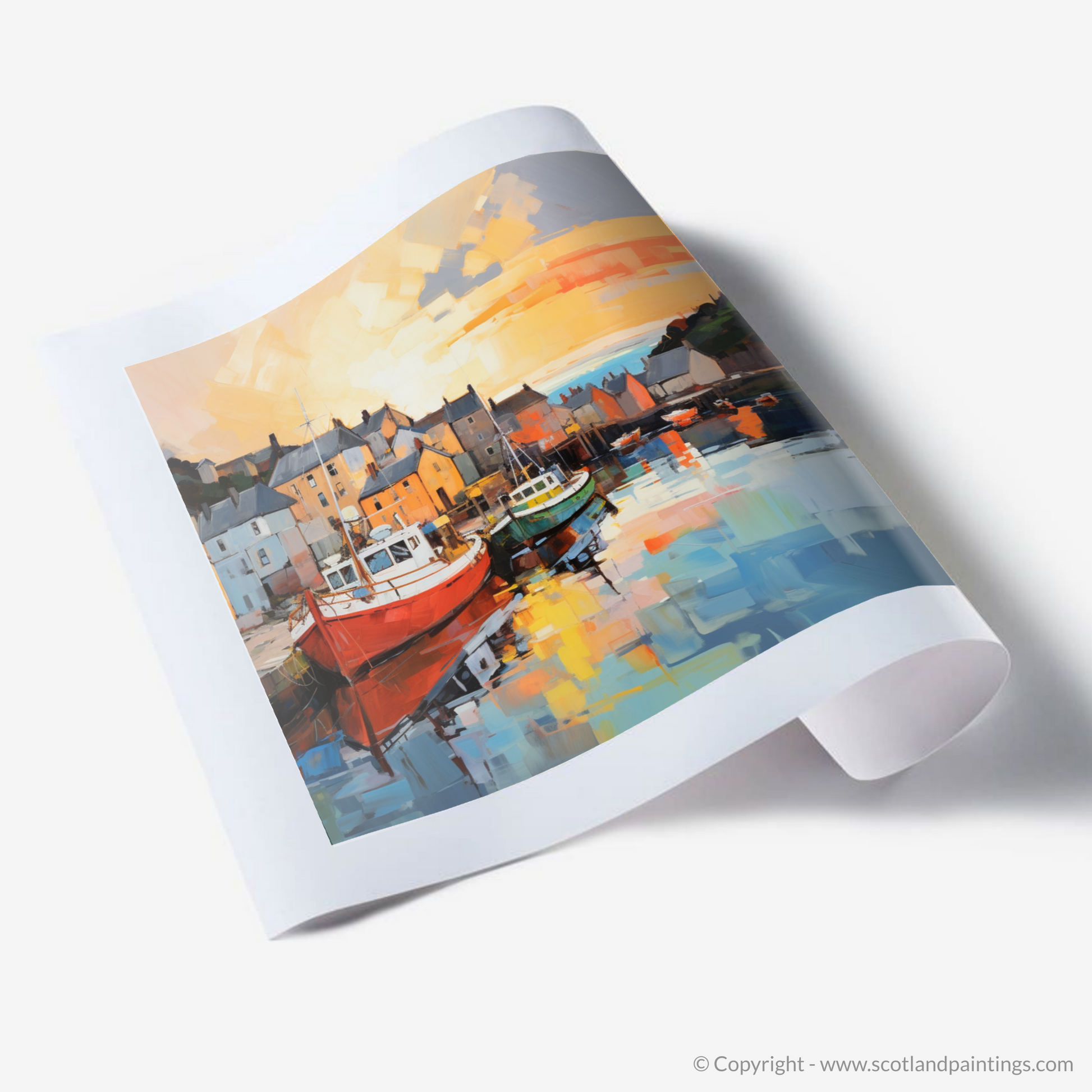 This print promises to bring the essence of Scotland's coastal splendour into any space, offering viewers a window to a moment forever paused at the precipice of nightfall—a celebration of colour, light, and the soothing cadence of harbour life at day's end.