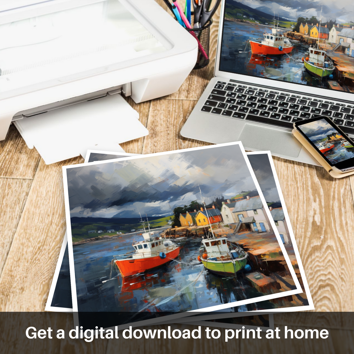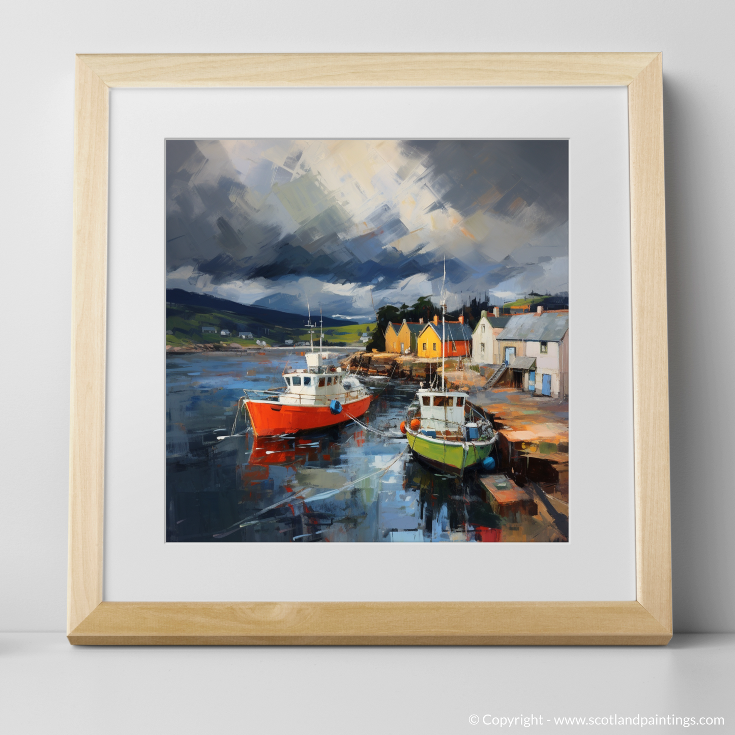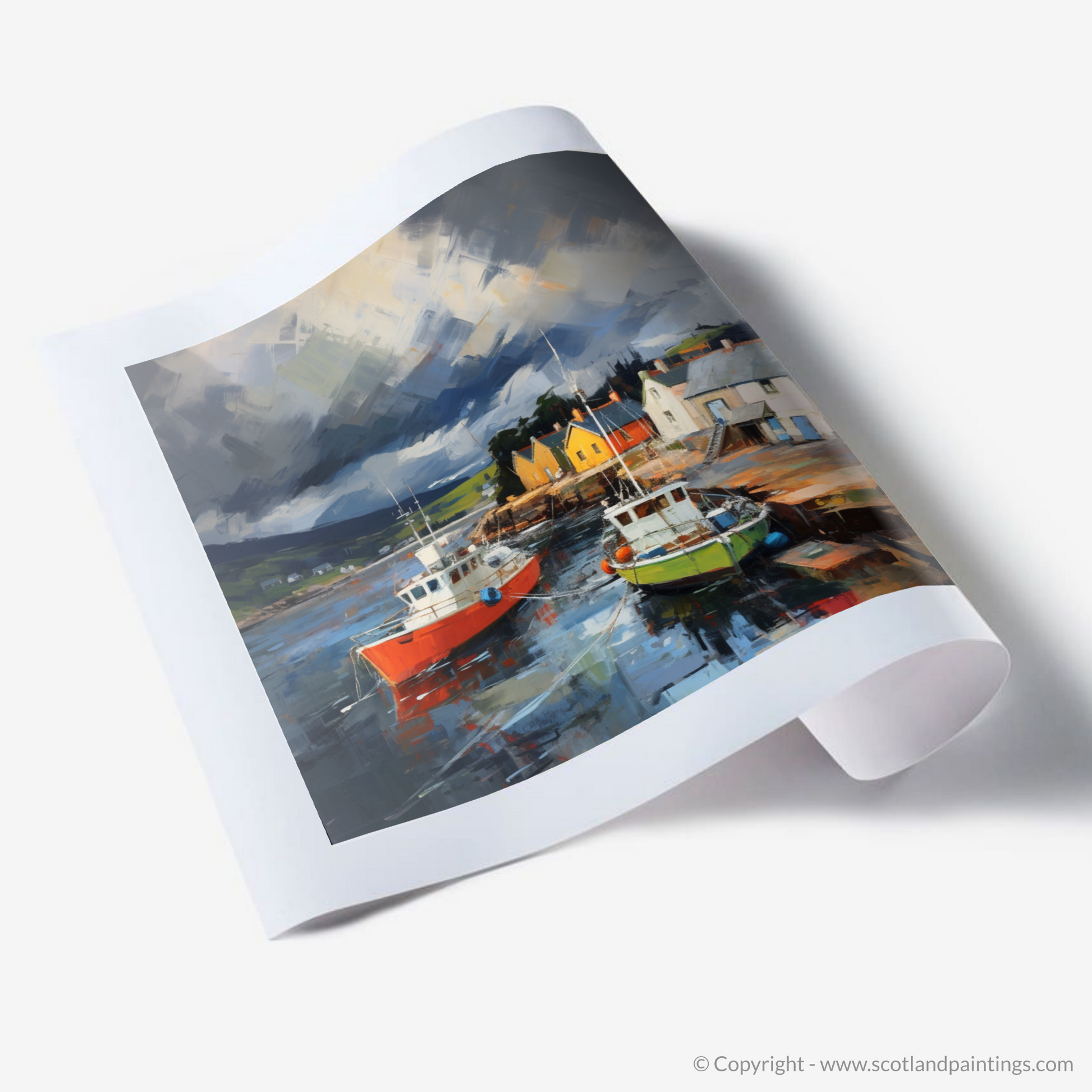 This piece, firmly rooted in the expressionist tradition, utilises a dynamic palette knife technique to imbue the scene with an impression of movement and raw emotion. The thick, impasto strokes carve into the canvas, creating a landscape that is as much about the fierce beauty of nature as it is about the resolute spirit of the coastal community it represents. This print, a part of the 'Scottish Harbours' collection, is a testament to the untamed allure of Scotland's maritime heritage, inviting viewers to experience the convergence of nature and human perseverance at the edge of the sea.
