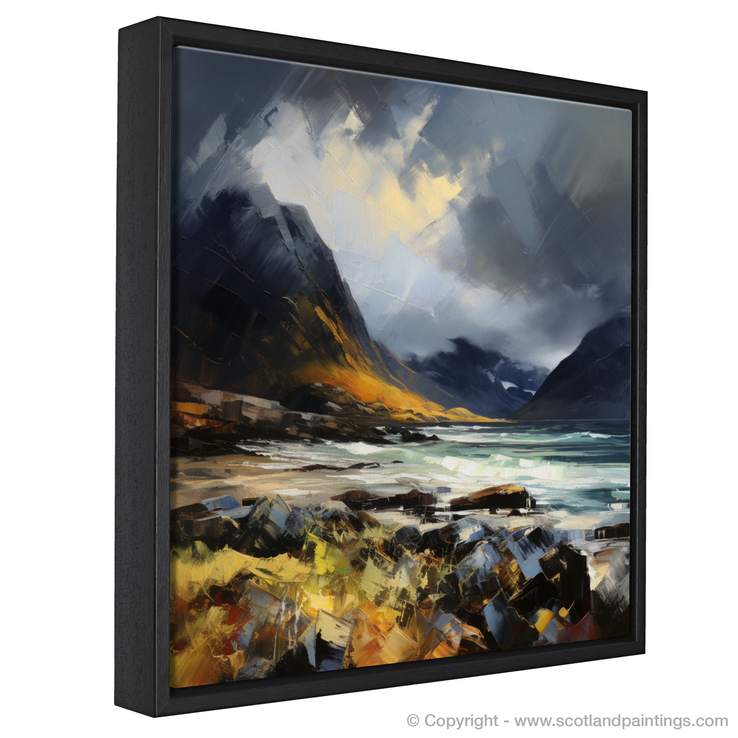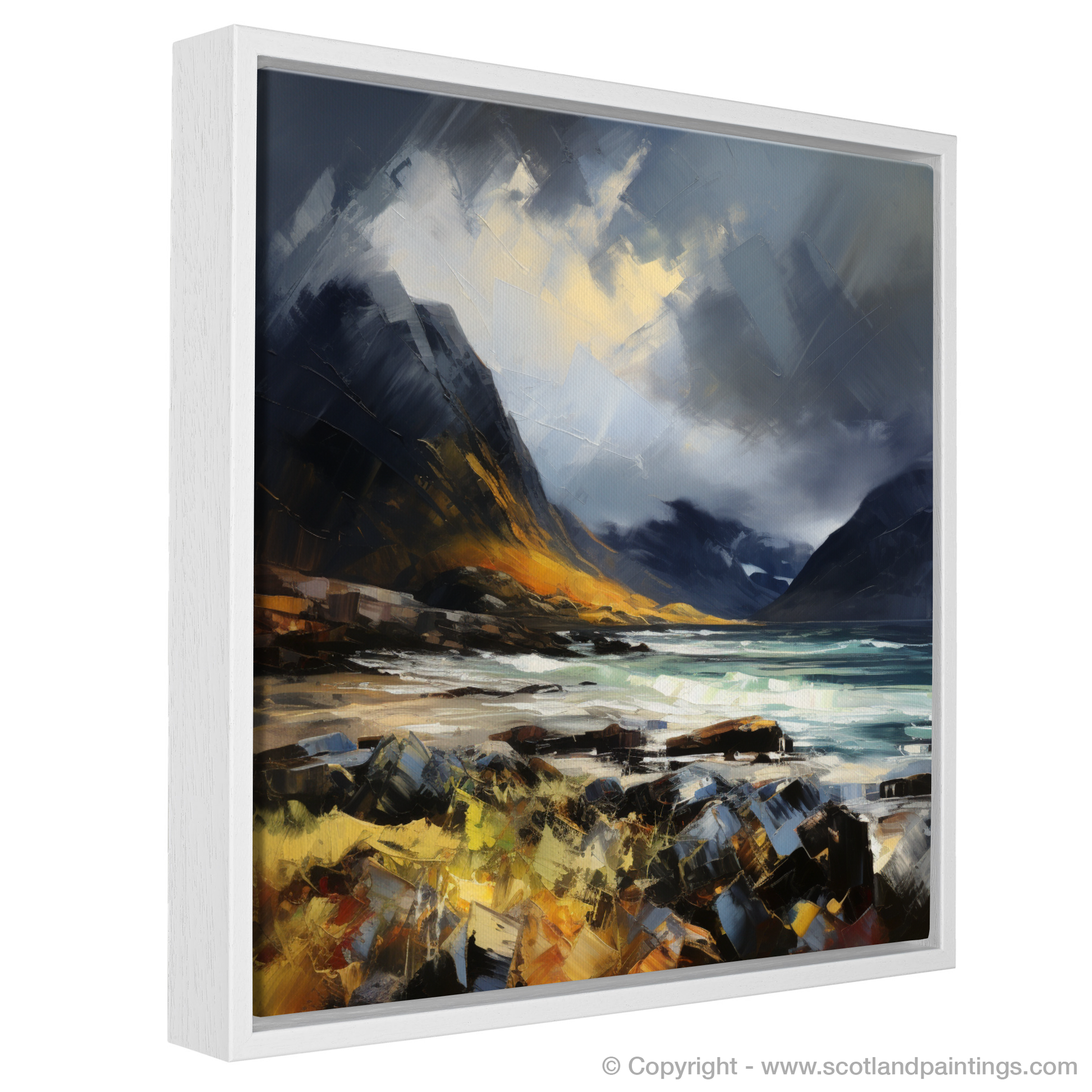 This print, part of the 'Scottish Coves' collection, not only captures the wild spirit of Elgol Bay but also encapsulates the emotional resonance and expressive power of the landscape. It finds the sublime in the storm, offering viewers a chance to connect with the raw and otherworldly beauty of Scotland's coastal scenes.