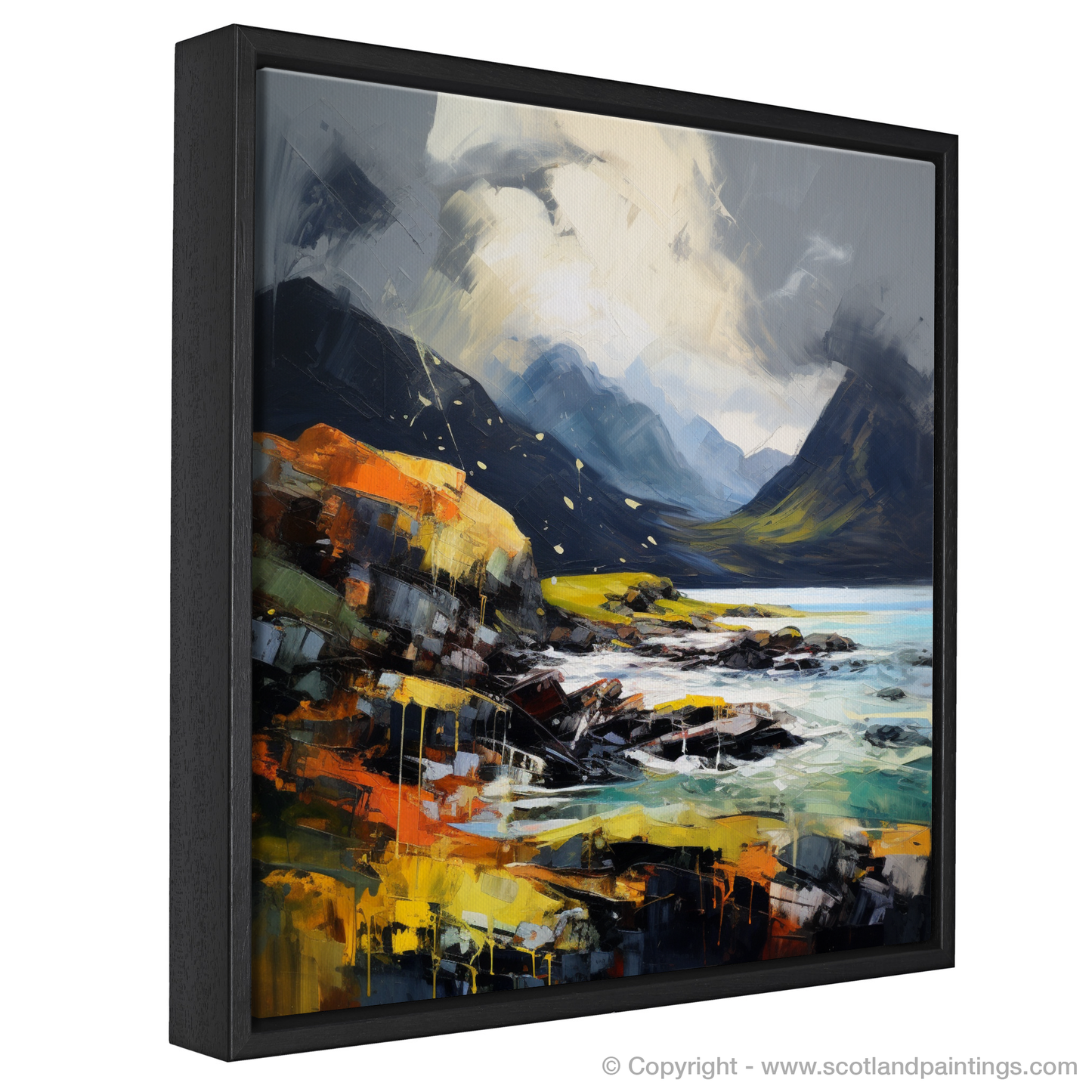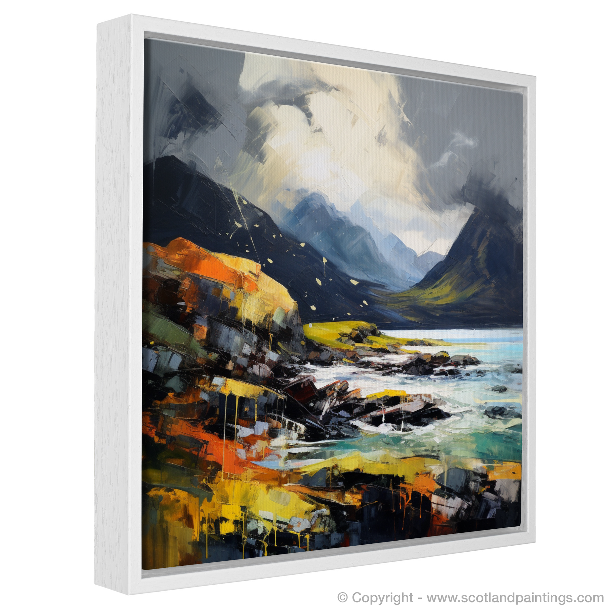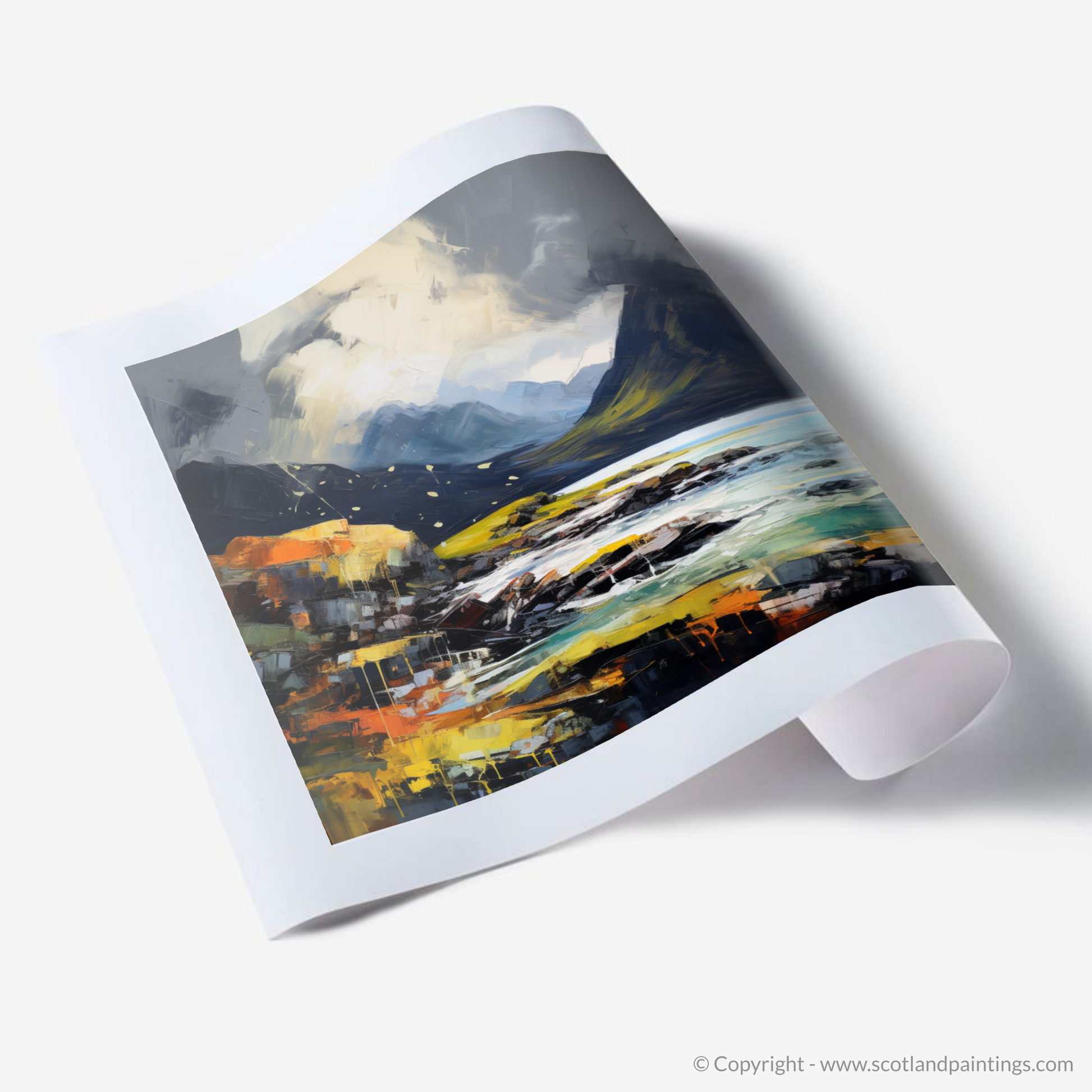 This evocative print captures the raw essence of Elgol Bay under a tempestuous sky, brought to life with impassioned brushwork and a vibrant expressionist style. The viewer is drawn into a moody landscape where the drama of the Scottish highlands unfolds, with brooding mountains rising sharply against the tumultuous sky. The sea churns with a dynamic palette of blues and greens, reflecting the intensity of the approaching storm.