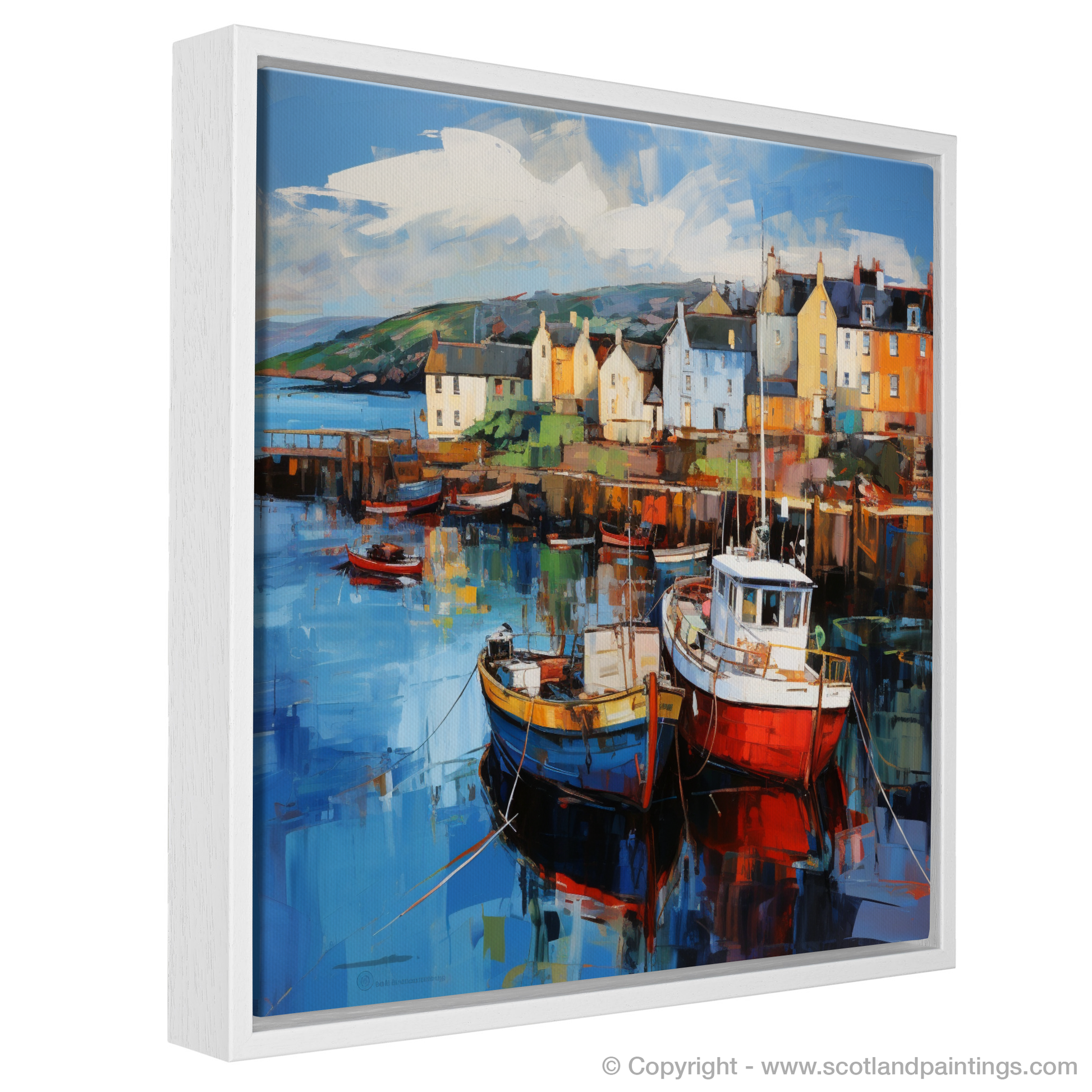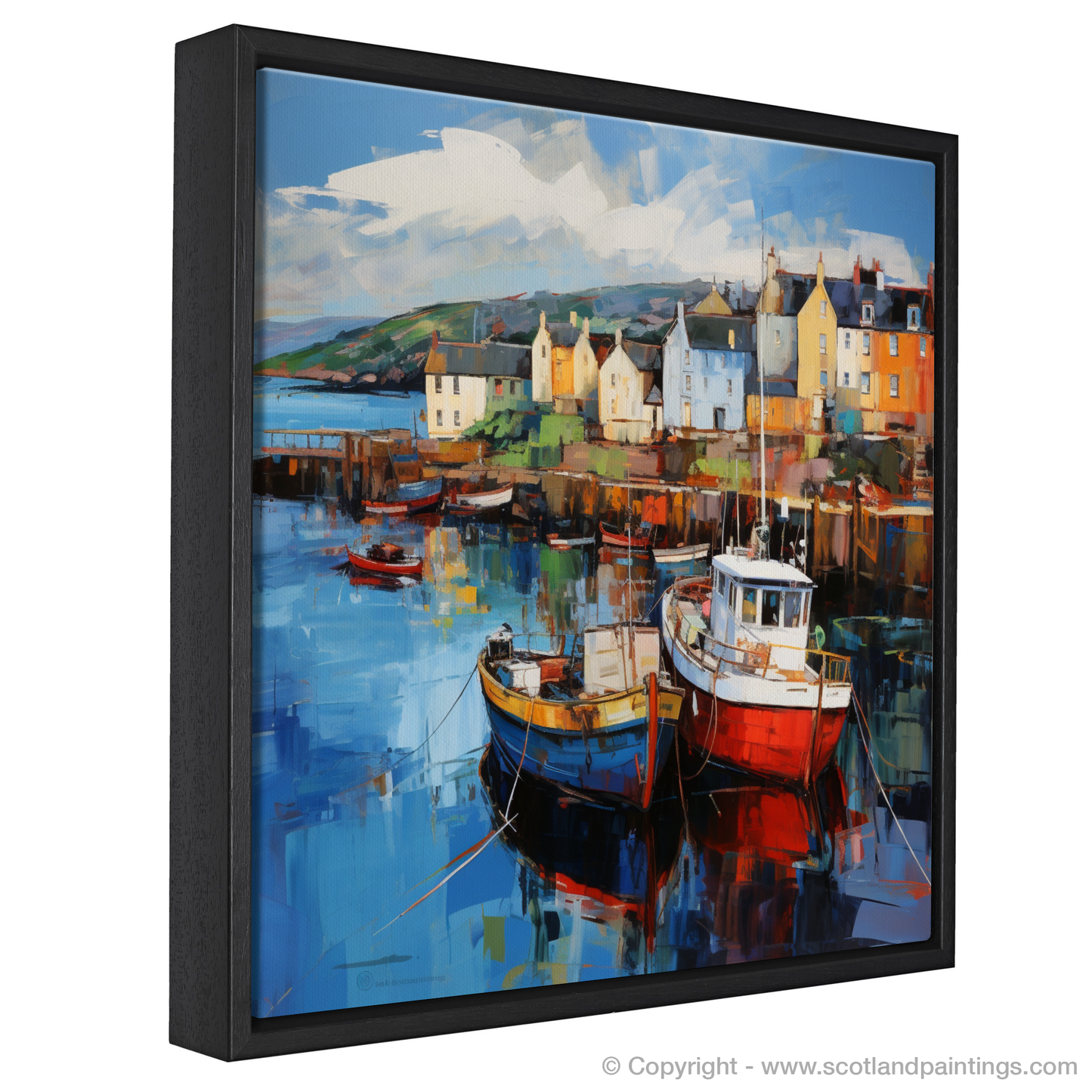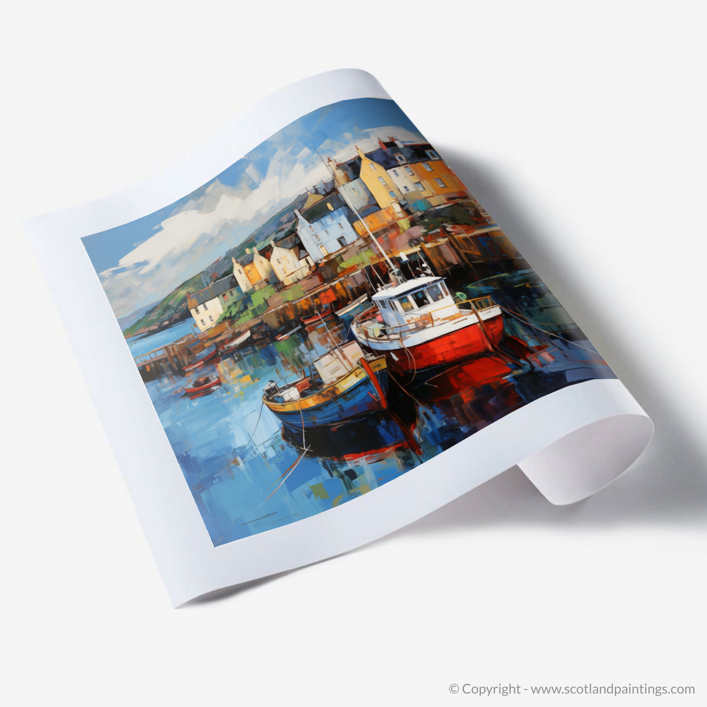 Captured with the vibrant juxtaposition of colour and emotion characteristic of Expressionist artwork, this evocative print brings to life the essence of Millport Harbour, Isle of Cumbrae. The scene is a symphony of vivid hues and dynamic brushstrokes that convey a sense of the location's bustling energy and quaint charm. Dominating the foreground, bold reds and deep blues clothe the moored boats, their reflections dancing on the water's surface with an almost musical rhythm. The boats are rendered with a sense of weight and solidity, yet their edges blend into the reflections, creating an interface between reality and its shimmering double.