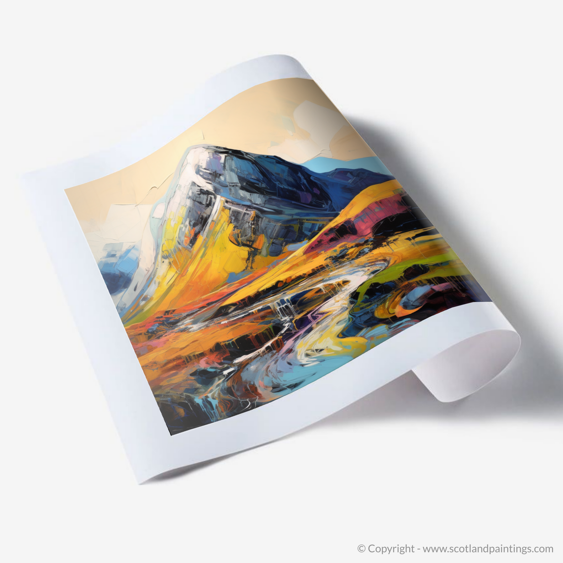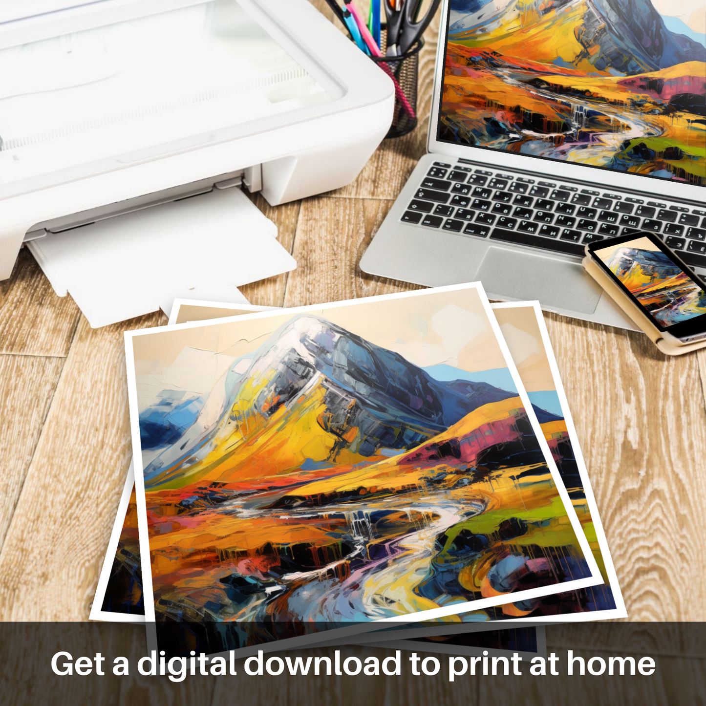 The dynamic interplay of light and shadow, characteristic of expressive artistry, breathes life into the scene. This print promises not only a visual journey through one of Scotland's most iconic landscapes but an emotional expedition into the heart of the Highlands. The spirited brushstrokes and vivid colours merge to create an image that is not just seen but felt, perfect for anyone wishing to add a touch of the untamed Scottish spirit to their surroundings.