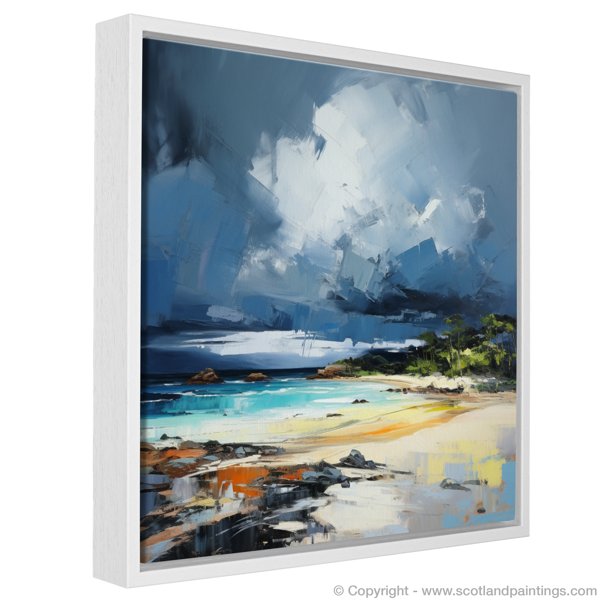 Captured with a tempestuous emotion, this evocative print portrays Largo Bay in the grip of a brewing storm. The expressive brushstrokes and bold palette enshrine the intense atmosphere of the Scottish coast, where the sky clashes with the sea in a dramatic interplay of colour. Swathes of deep blues and greys dominate the upper expanse, their chaotic forms encapsulating the ferocity of the encroaching weather front. Below this tumultuous canopy, the sea rests in a comparatively tranquil turquoise, hinting at the calm before the storm.