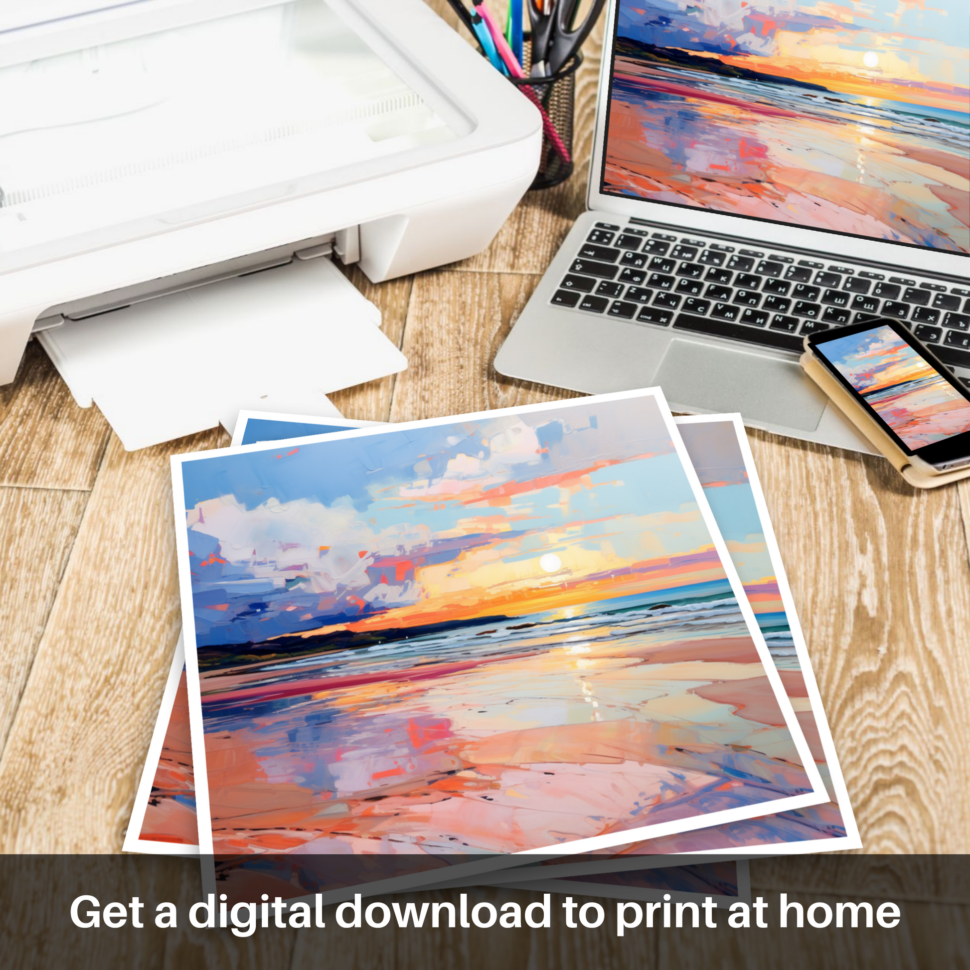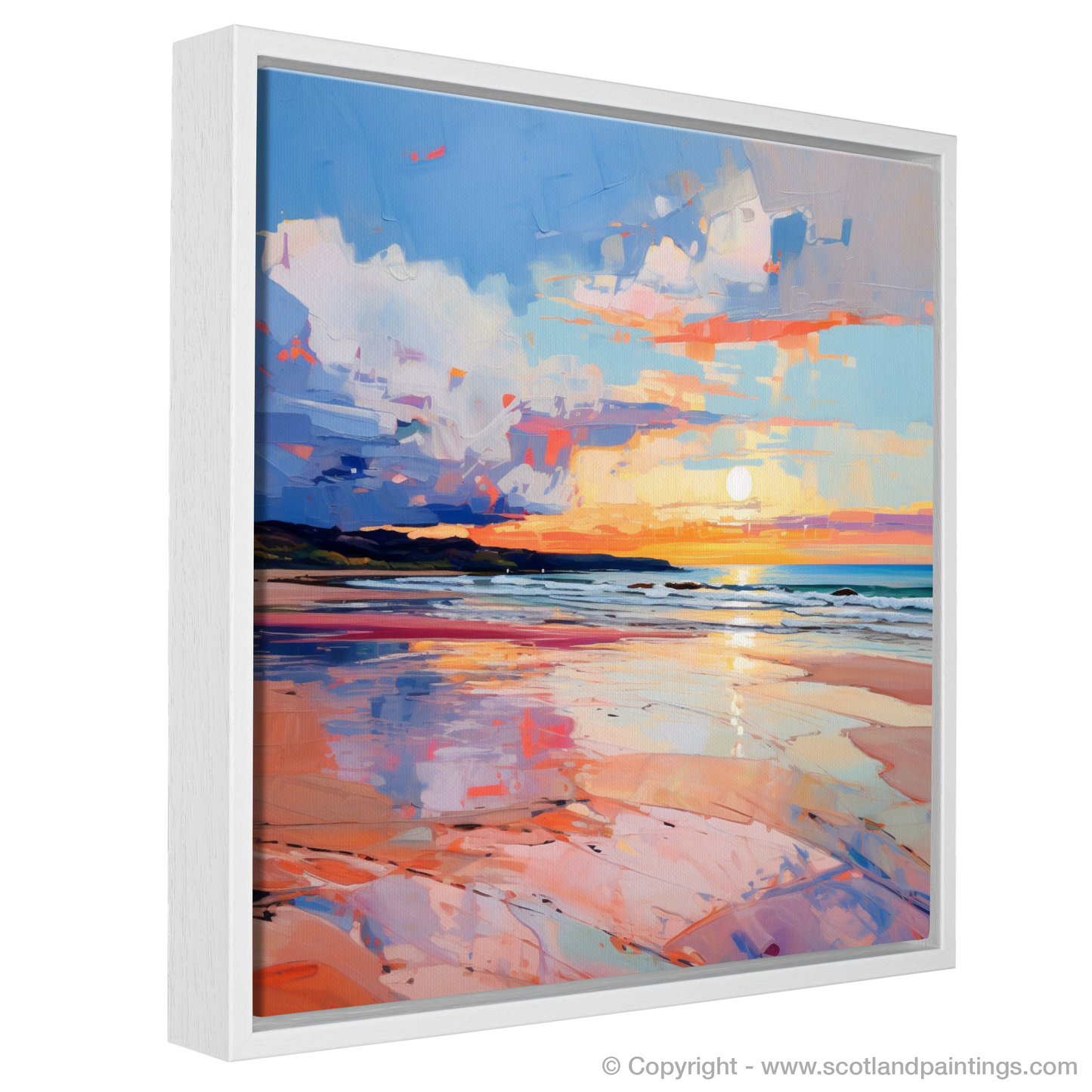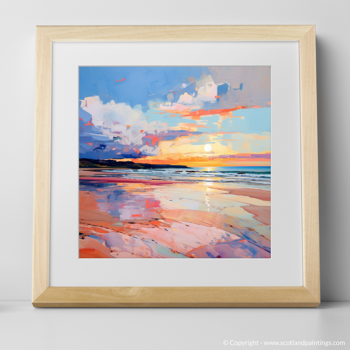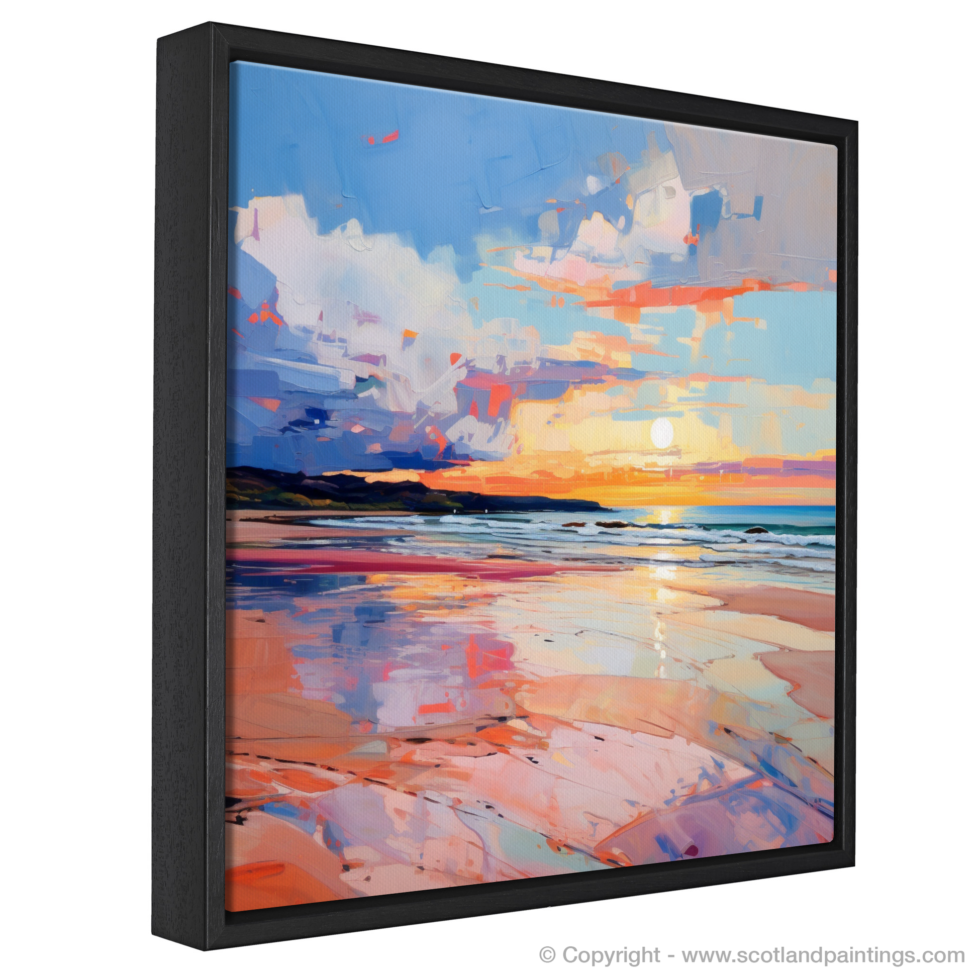 Capturing the ephemeral beauty of Gullane Beach at the magical hour of sunset, this evocative print is a treasure trove of colour and emotion, characteristic of the Expressionist style. The sweeping strokes of vivid blues and pinks dance across the canvas, depicting the dynamic sky as it is transformed by the setting sun. Bold, impressionistic brushwork conveys movement in the clouds, reflecting a symphony of oranges, purples, and reds that mimic the fleeting moments of twilight.