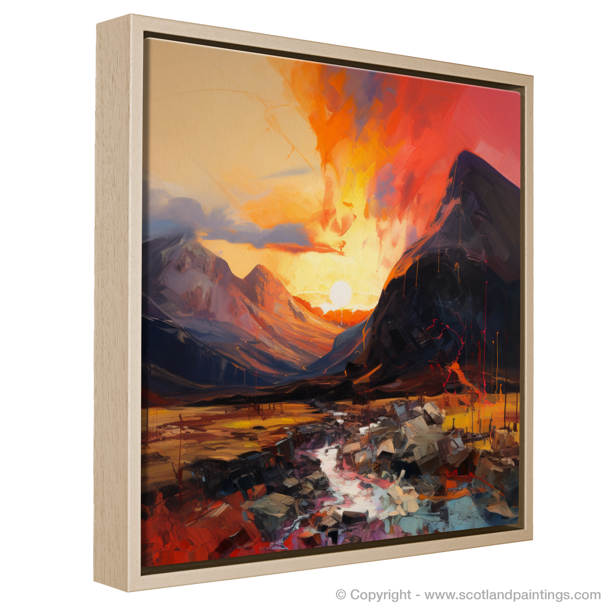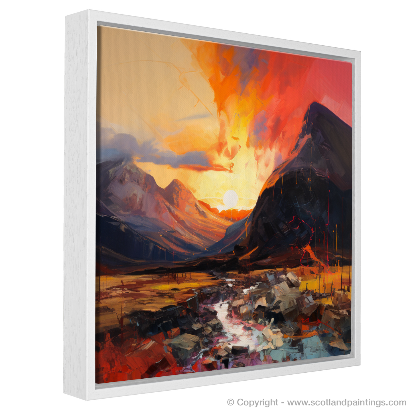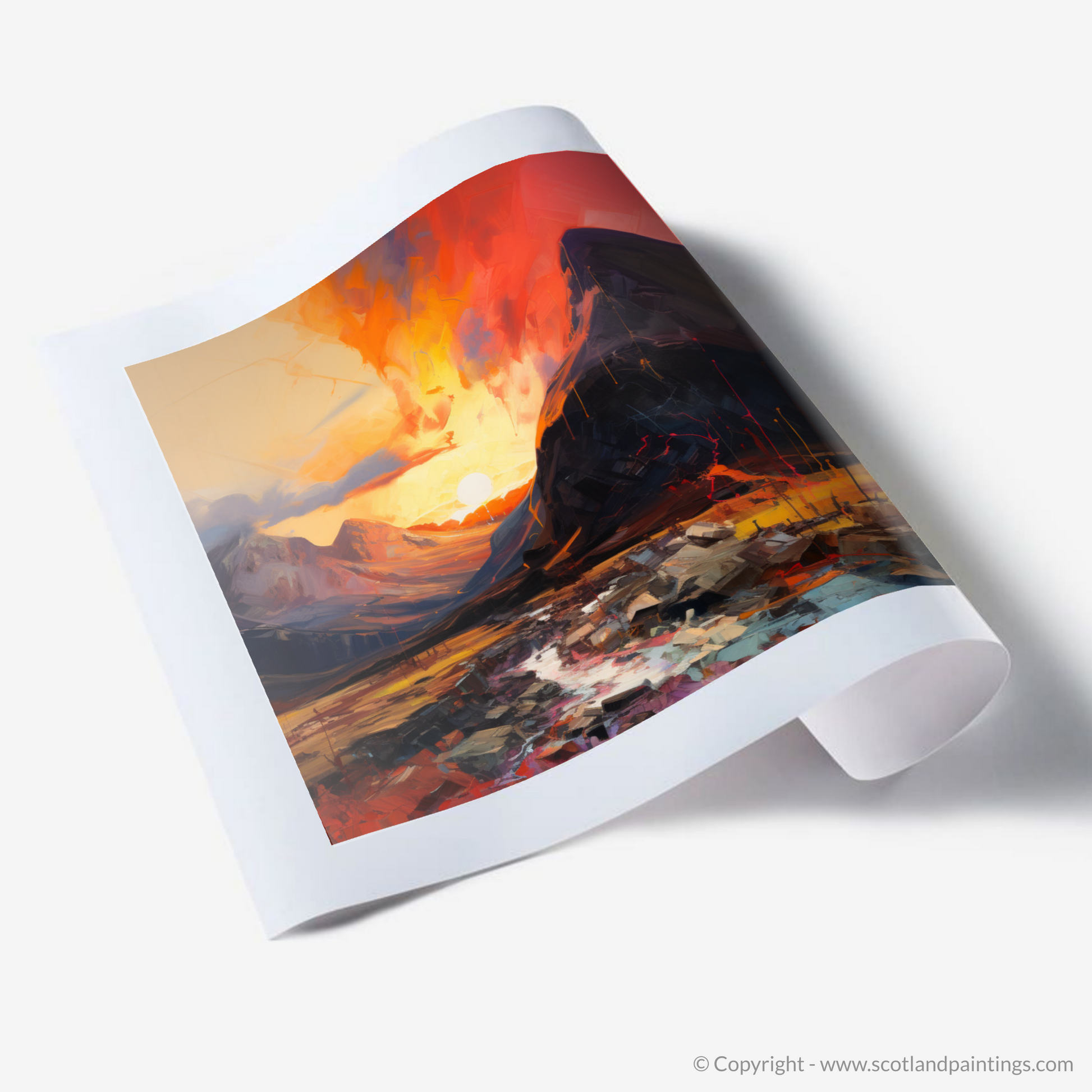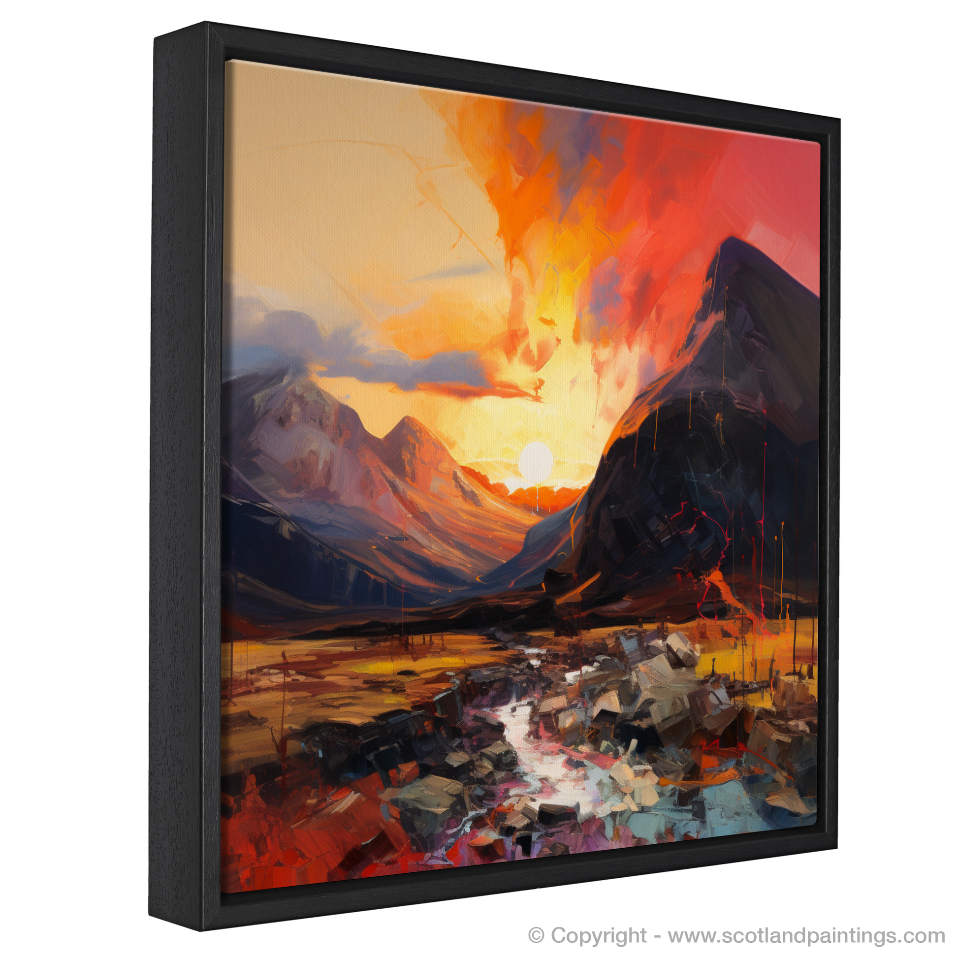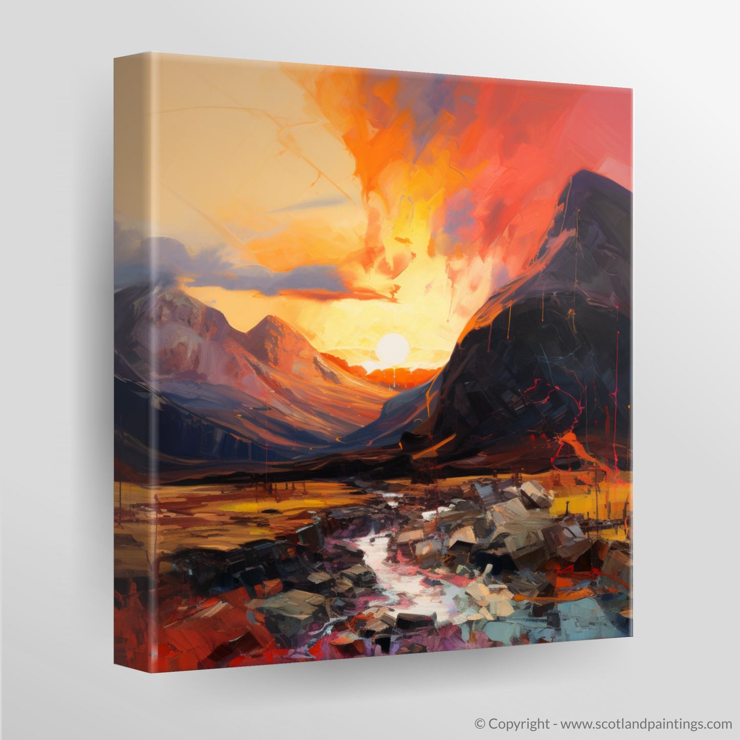Captured in a tumultuous symphony of colour and light, this expressionist-inspired print is a passionate ode to the rugged beauty of Glencoe. Vivid hues of a fiery sunset cascade over majestic peaks, imbuing the scene with a dynamic energy that seems to pulse within the very air. The sky explodes with a vibrant palette, ranging from deep crimsons to glowing oranges, punctuated by the golden orb of the setting sun nestled between the embracing mountains.