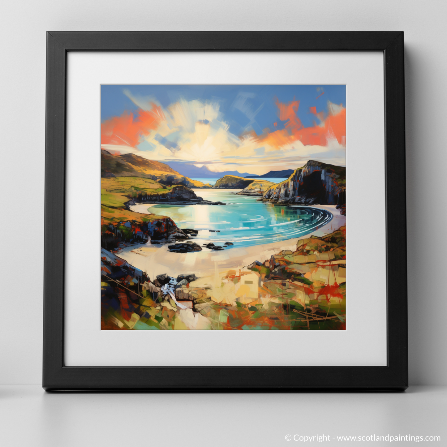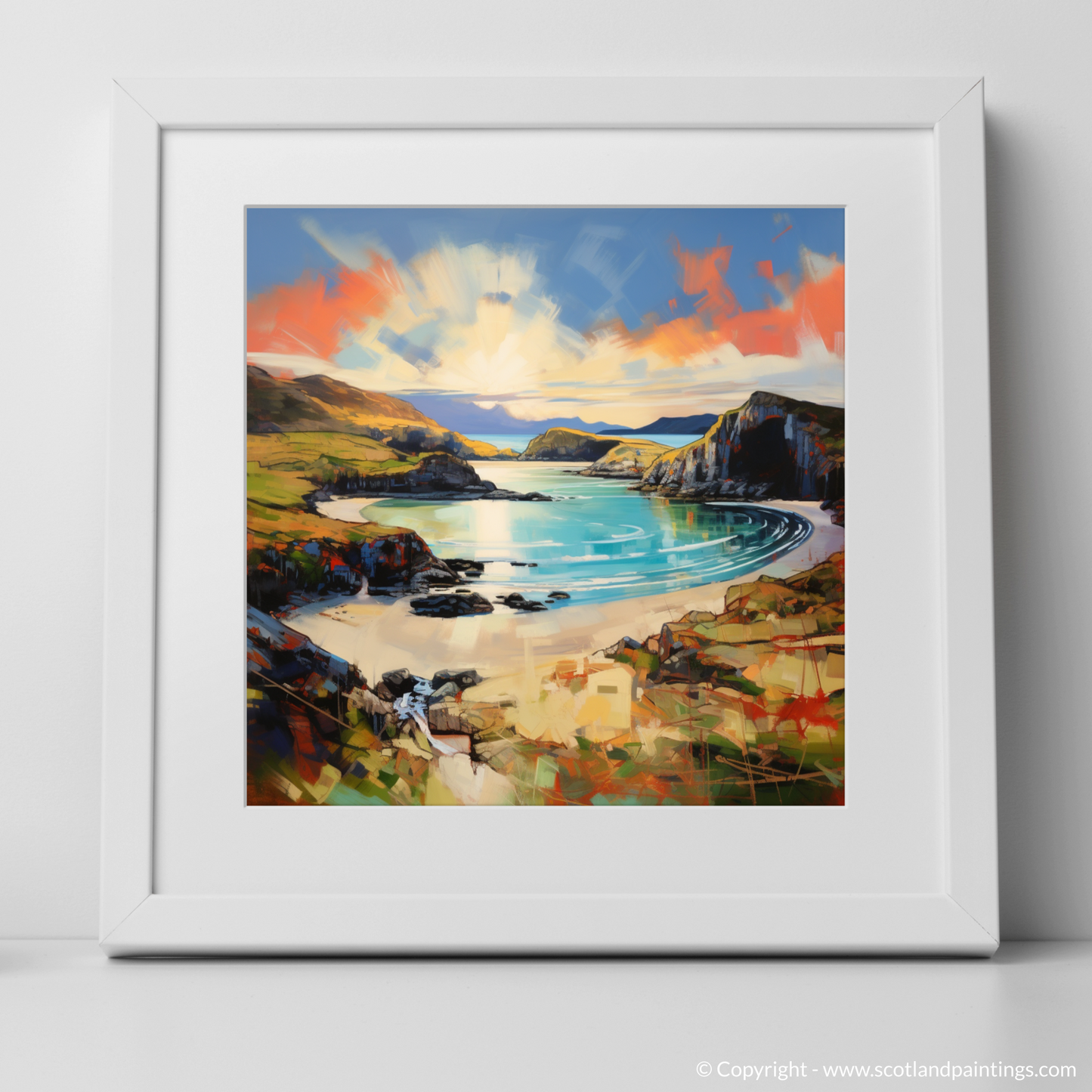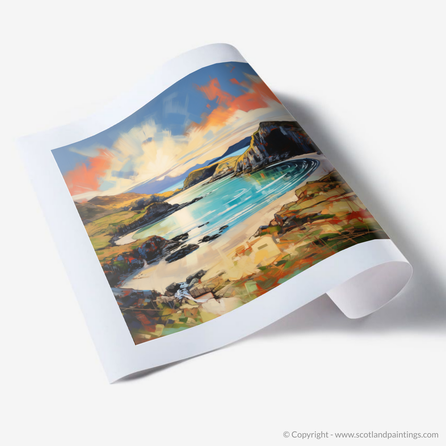 This evocative print captures the raw beauty of Balnakeil Bay, one of Sutherland's hidden gems, through the vivid and emotive lens of Expressionist art. The scene is a symphony of colour and movement that encapsulates the essence of the Scottish Highlands' rugged coastline. A luminous turquoise sea kisses the crescent shores, cradled by grand cliff faces that stand as ancient guardians of the cove. The sky above is a theatre of dramatic brushstrokes, where bold oranges and reds flare out from the sun like fiery petals, contrasting with the serene blues, hinting at the unpredictable nature of this northern landscape.