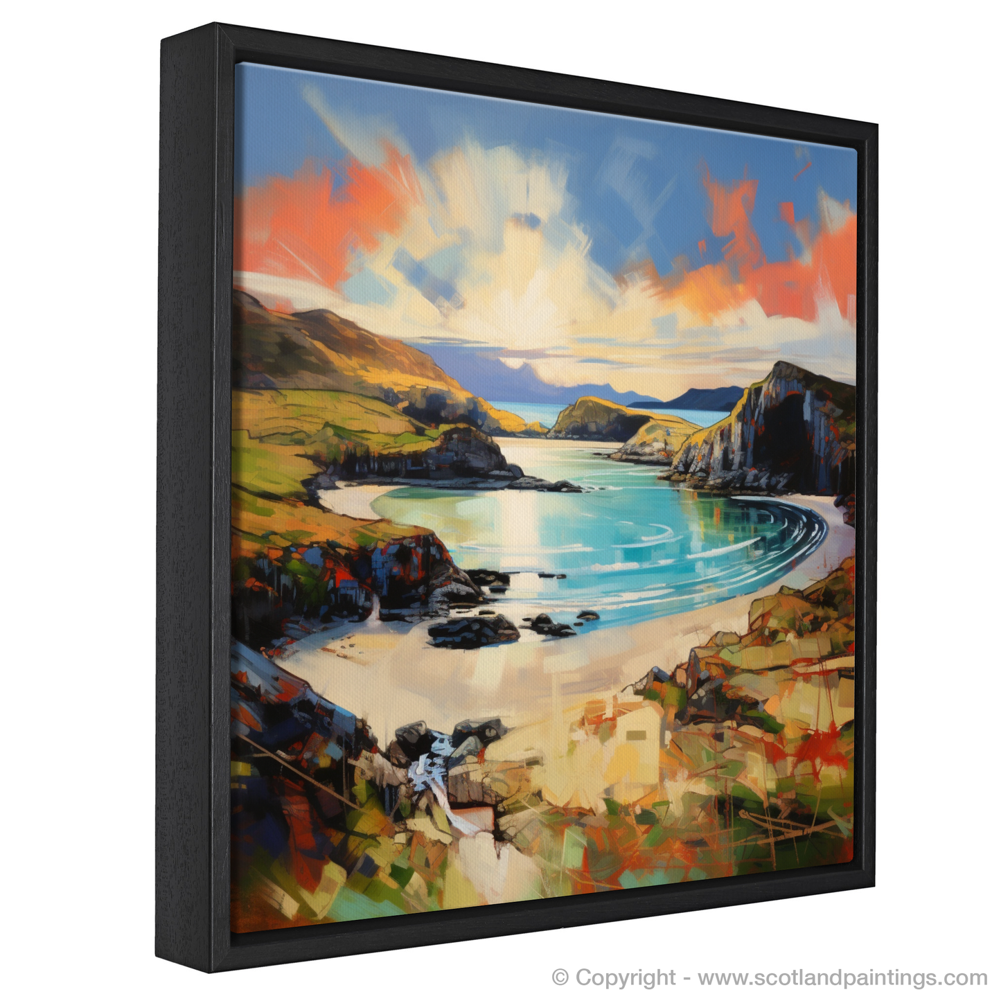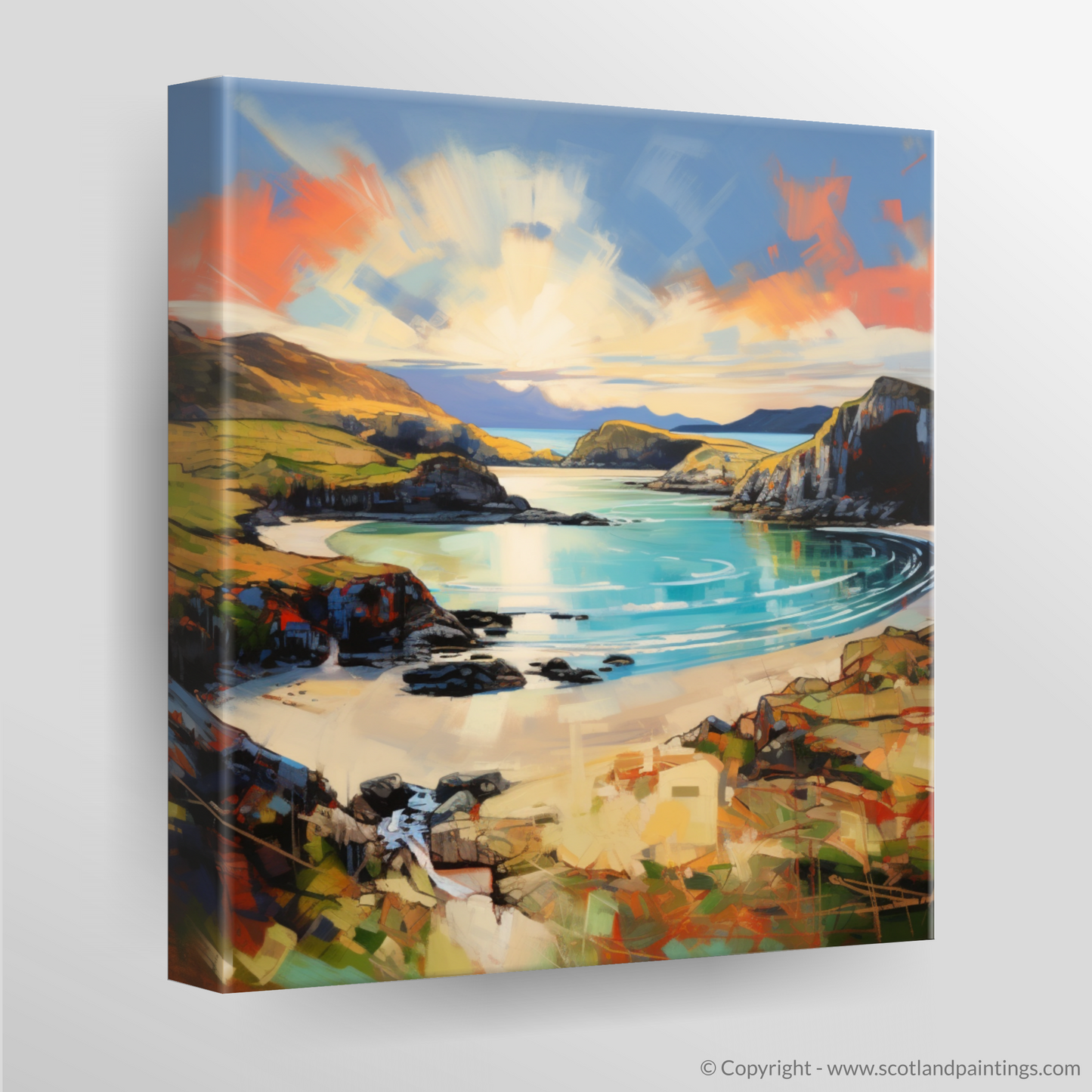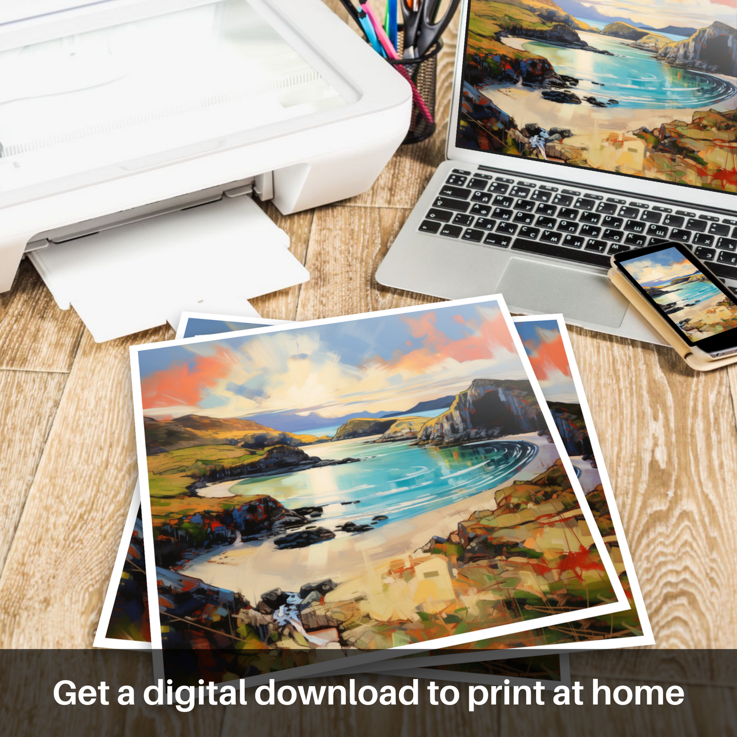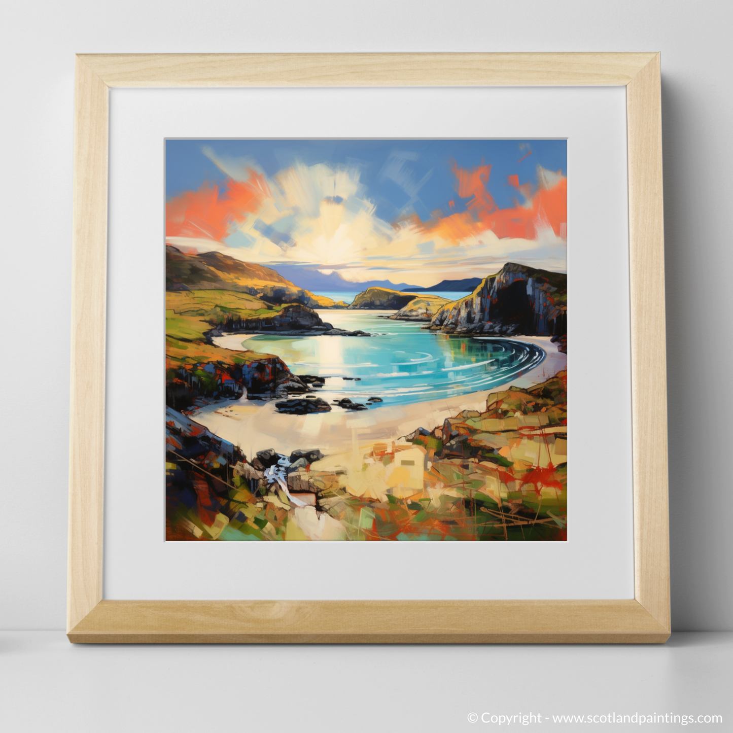 This evocative print captures the raw beauty of Balnakeil Bay, one of Sutherland's hidden gems, through the vivid and emotive lens of Expressionist art. The scene is a symphony of colour and movement that encapsulates the essence of the Scottish Highlands' rugged coastline. A luminous turquoise sea kisses the crescent shores, cradled by grand cliff faces that stand as ancient guardians of the cove. The sky above is a theatre of dramatic brushstrokes, where bold oranges and reds flare out from the sun like fiery petals, contrasting with the serene blues, hinting at the unpredictable nature of this northern landscape.