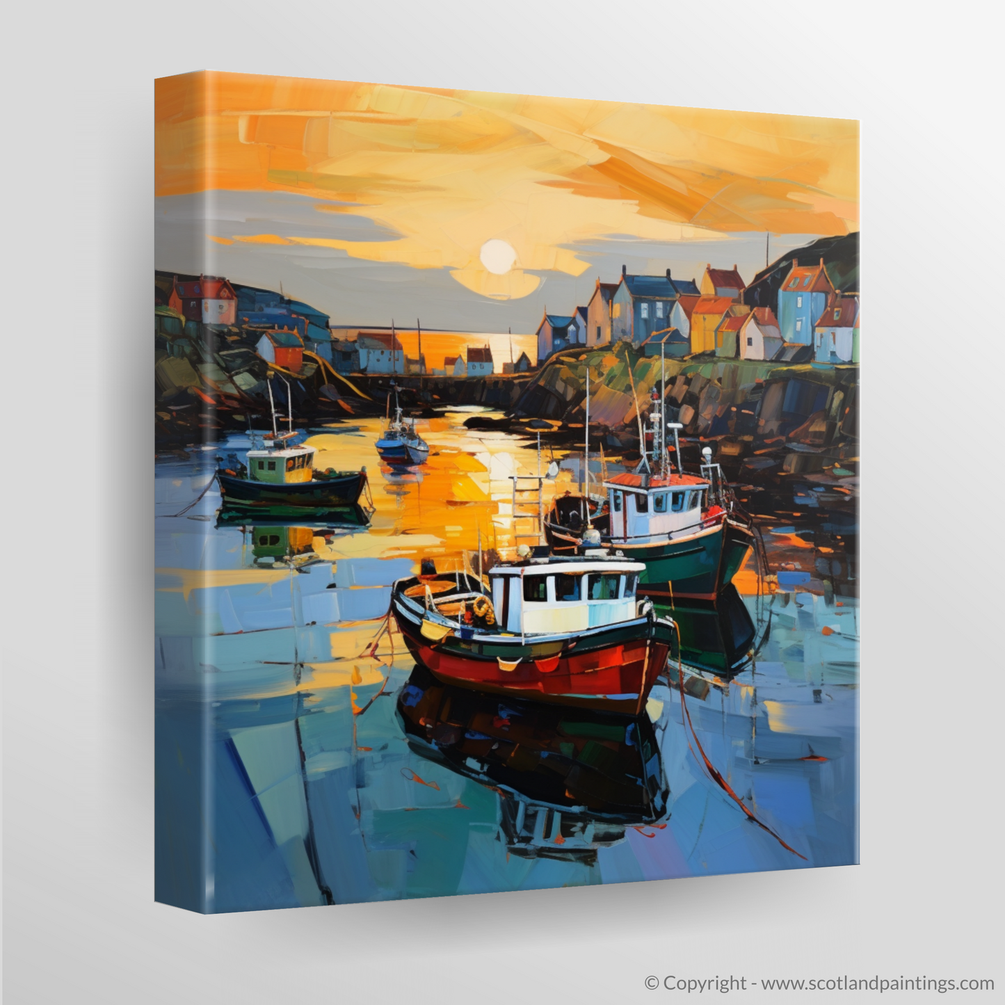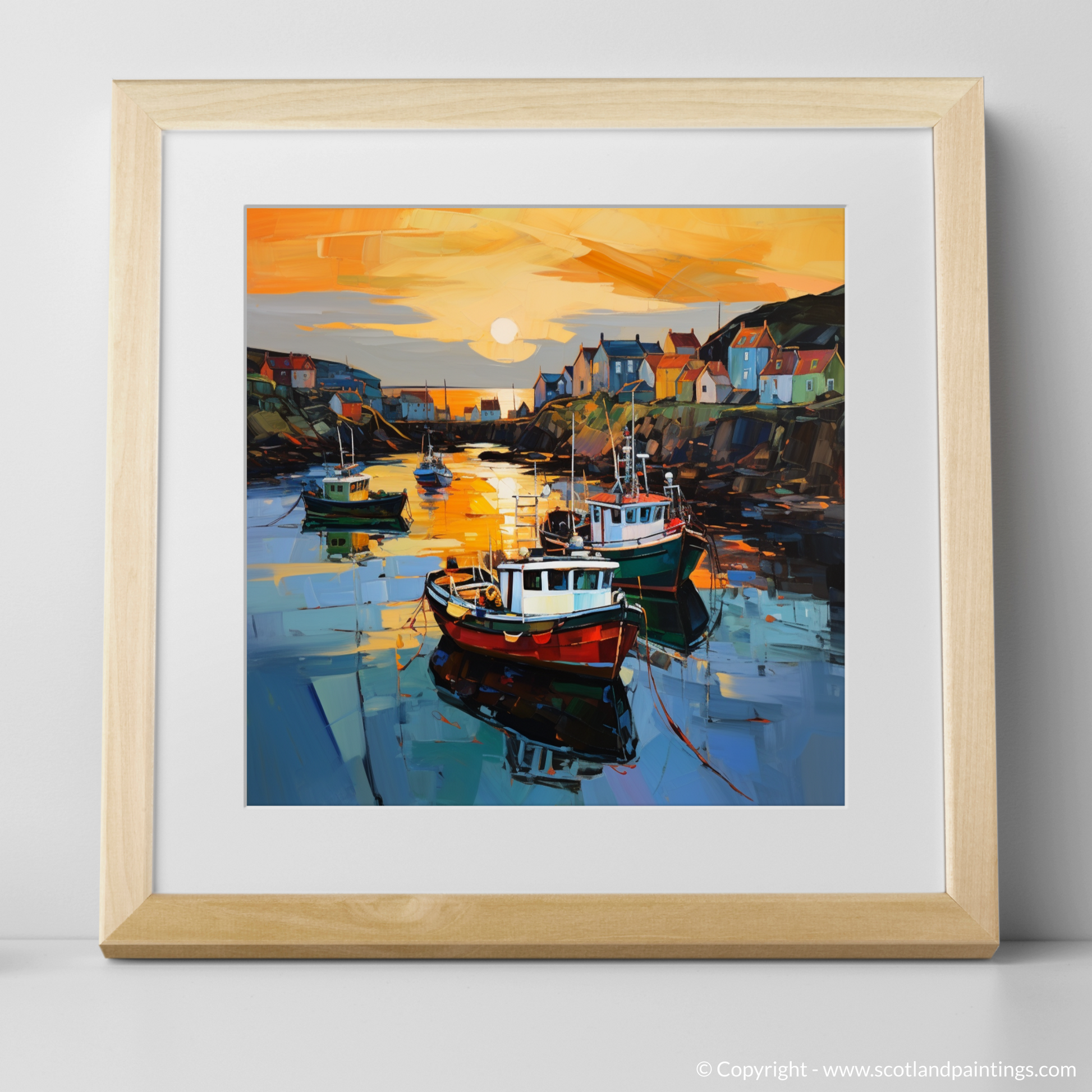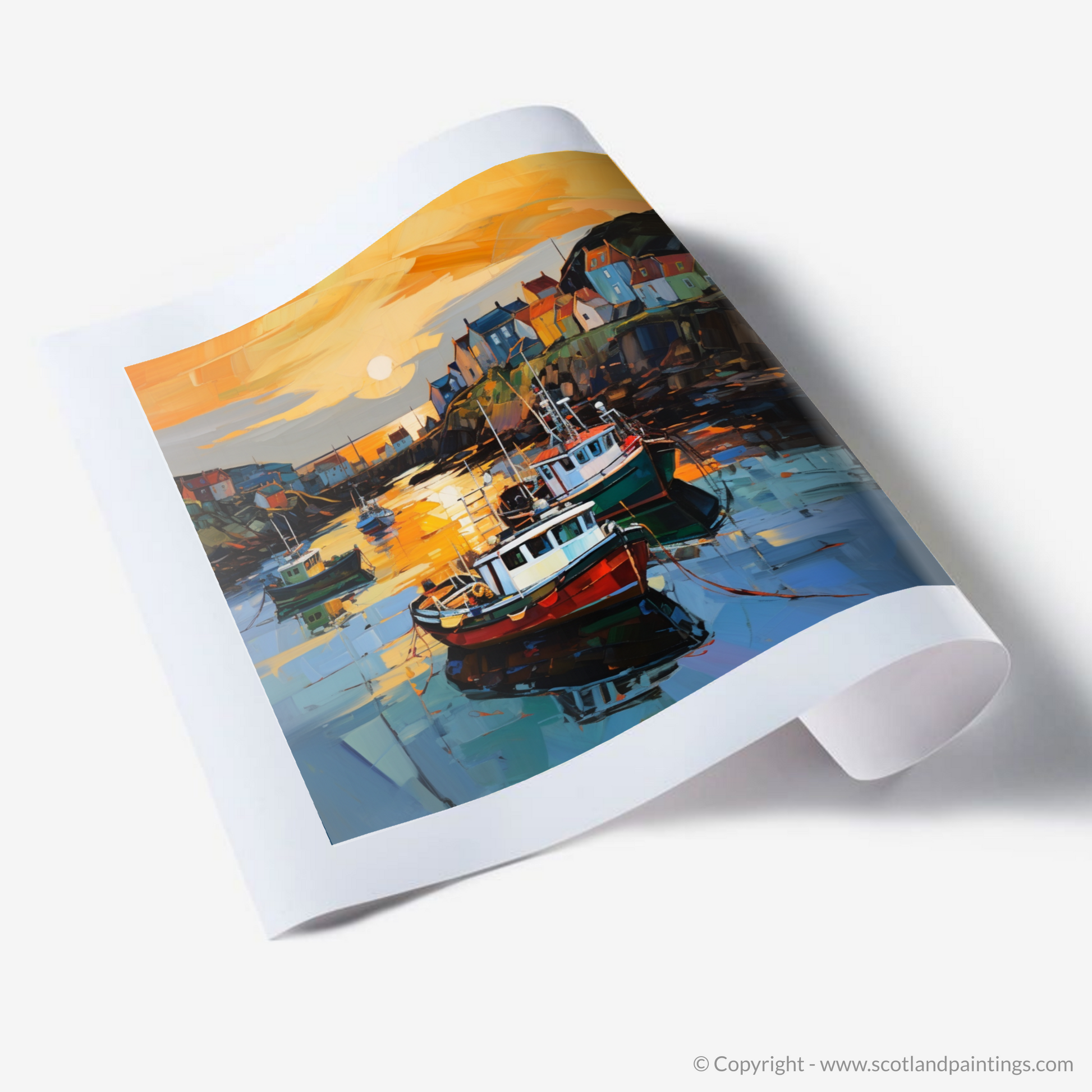 Capturing the mesmeric tranquillity of a Scottish harbour at the gentle close of day, this evocative expressionist print presents a delightful scene of Portnahaven Harbour bathed in the amber glow of dusk. The viewer is greeted by the radiant reflection of the setting sun as it dances across the water, where a symphony of oranges and yellows harmonise with the deep blues and purples that hint at the approaching evening.