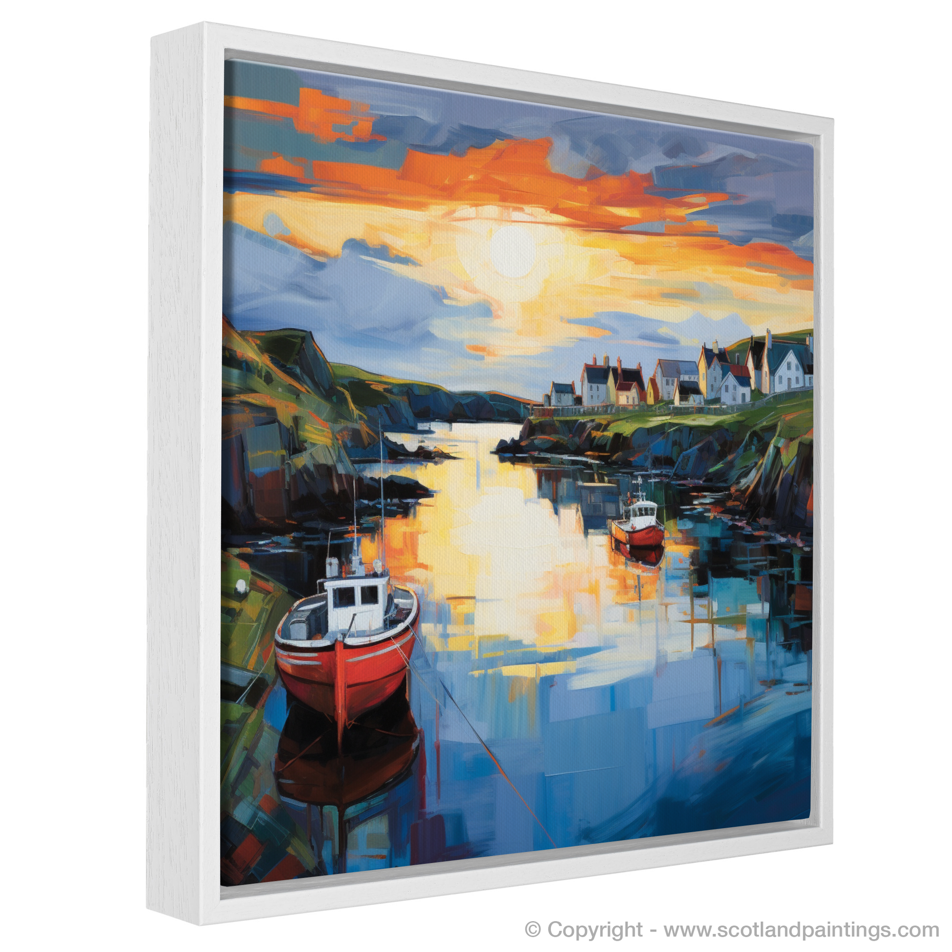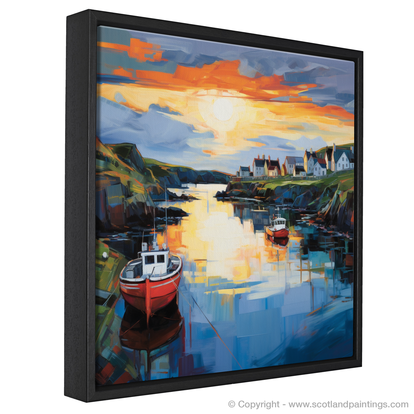 Captured in the evocative strokes of Expressionism, this print brings to life the tranquil beauty of Portnahaven Harbour at the magical hour of dusk. The viewer is greeted by a vivid tapestry of warm hues, as the setting sun casts a fiery glow across the sky, mirrored gracefully in the calm, reflective waters below. Swirls of orange, red, and yellow blend harmoniously, suggesting the ephemeral nature of the evening light.