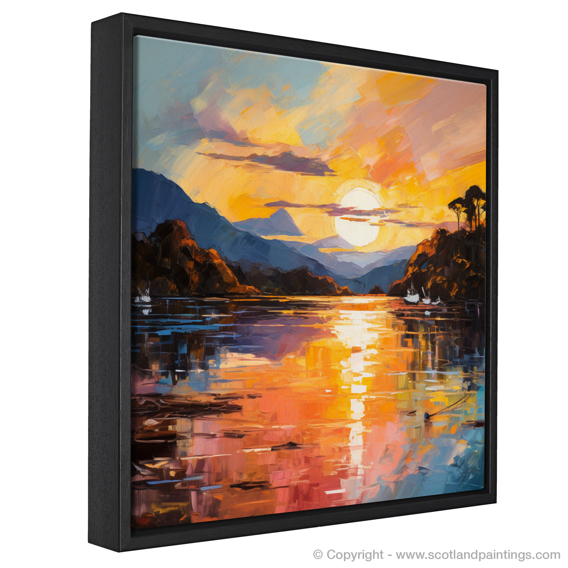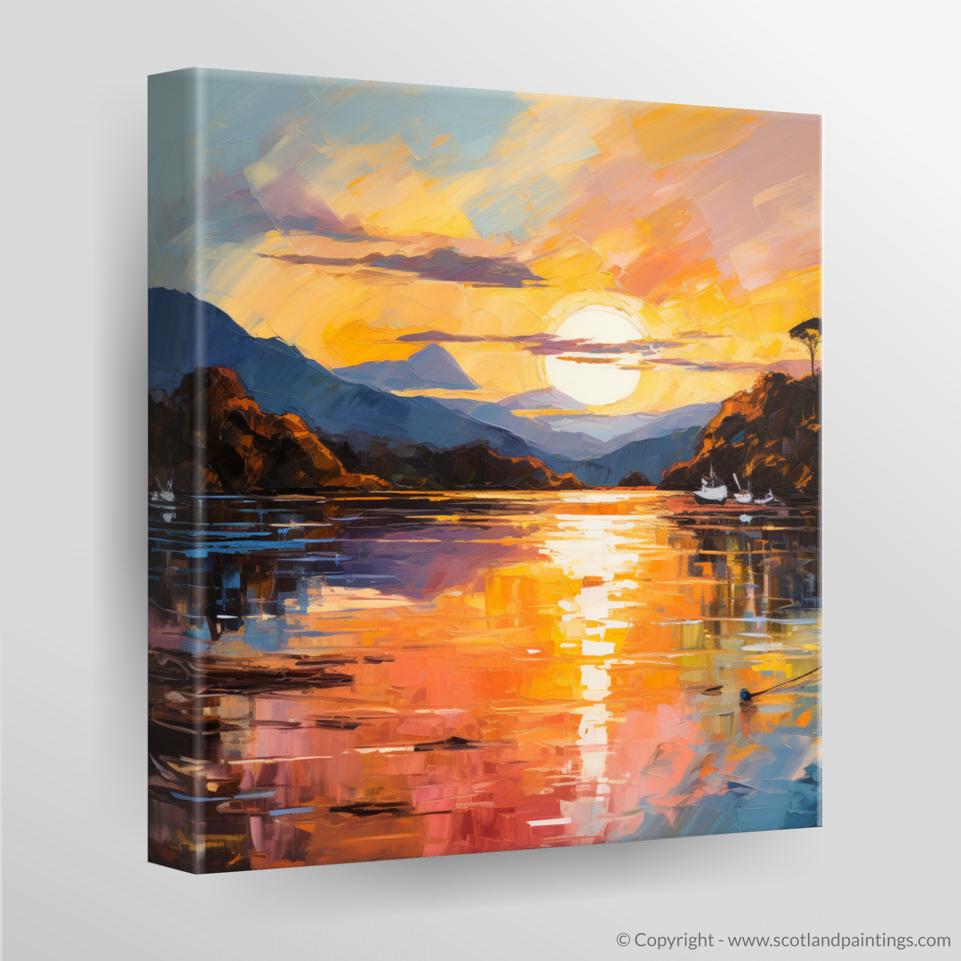 Captured within this expressive piece is the breathtaking beauty of Loch Lomond bathed in the enchanting light of the golden hour. The vivacious strokes and vibrant palette echo the tumultuous emotions of nature, seamlessly blending the fiery oranges, warm yellows, and cool blues that dance across the canvas. The sun, a radiant orb, dips towards the mountainous horizon, casting its reflection over the tranquil waters, which ripple with colours of molten gold and rose-tinted hues.